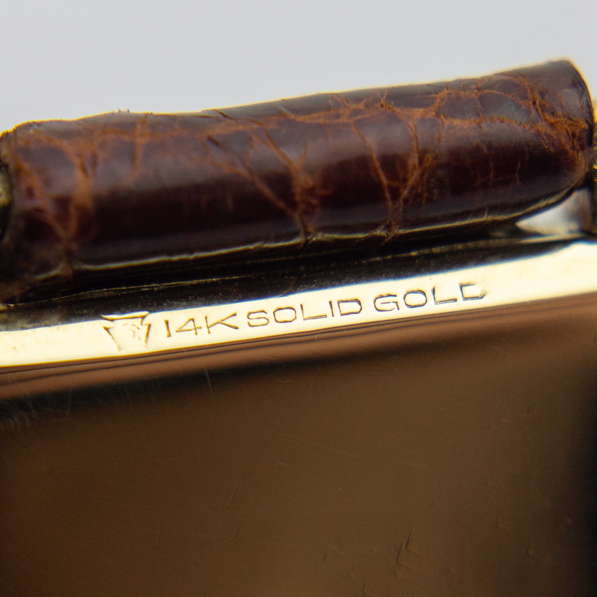 Une montre-bracelet Lord Elgin classique, Datant des années 1930 environ, cette montre est montée sur un bracelet en cuir de crocodile brun véritable. Son boîtier en or jaune massif 14 carats renferme un Mouvement à remontage manuel de fabrication américaine, doté de 21 rubis. Boîtier et mouvement produits par Elgin National Watch Company à Elgin, dans l'Illinois, aux États-Unis, contrairement aux nouvelles montres Elgin désormais fabriquées en Chine.