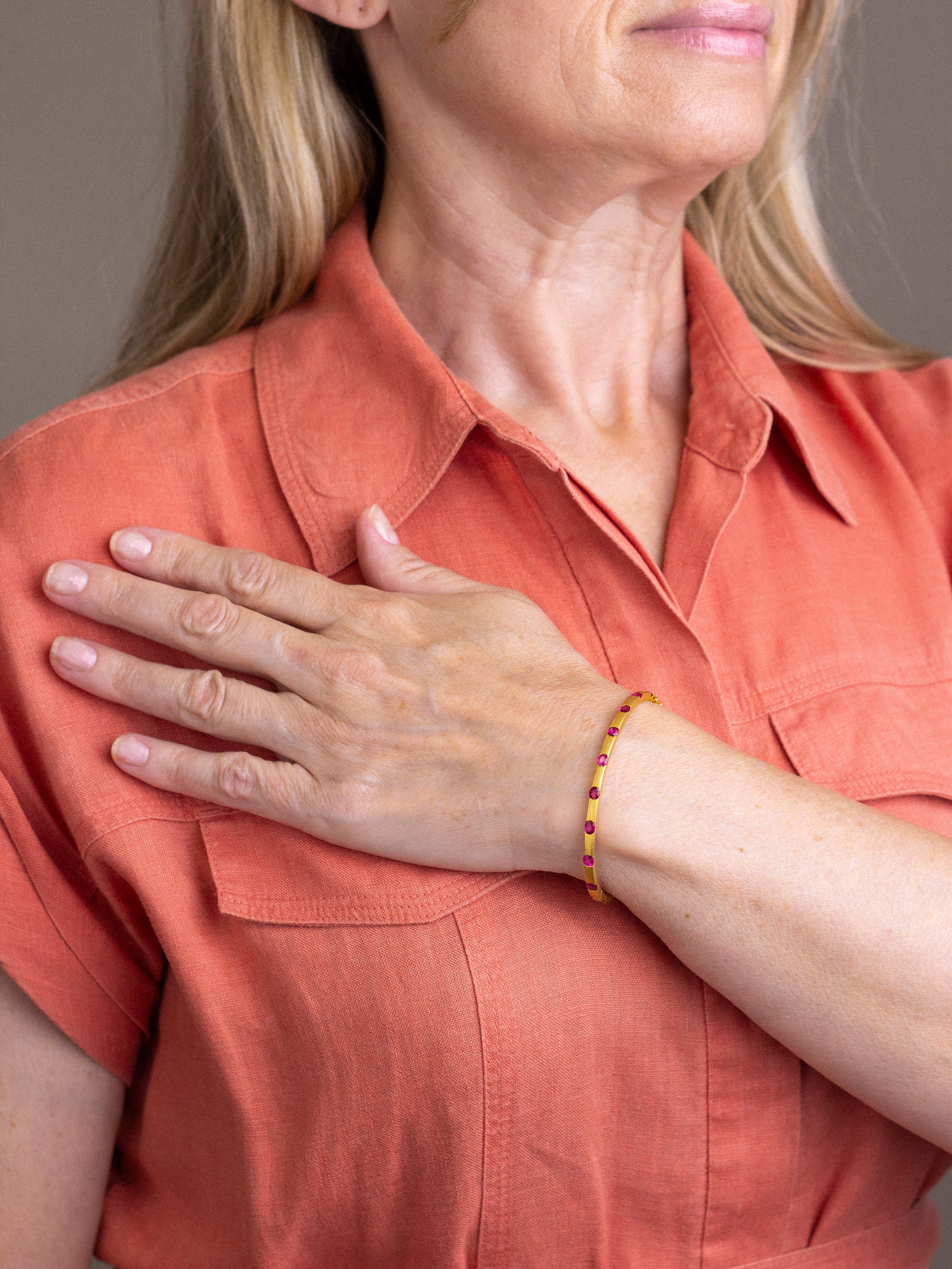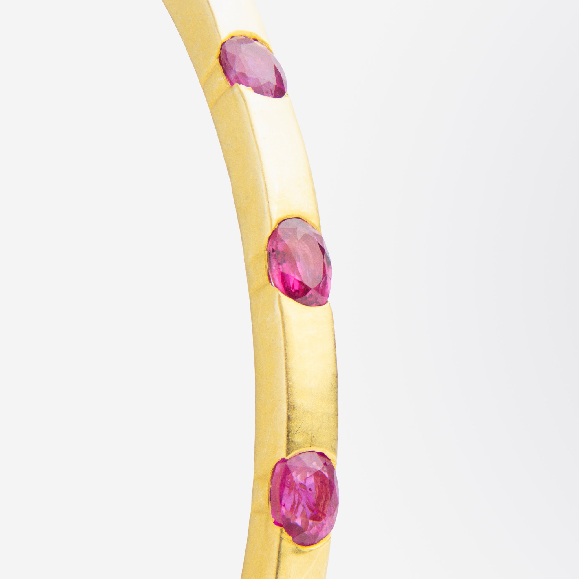 Ce magnifique bracelet jonc en or brossé est orné de rubis rouges éclatants. Sa structure articulée présente une superbe texture brossée, évoquant un fini satiné, mise en valeur par 18 rubis ovales de taille mixte, sertis clos. Un gemmologue a décrit ces rubis comme étant d'un rouge rosé intense, brillants, purs à légèrement inclus et de belle taille. À l'œil nu, leur harmonie est remarquable. Le bracelet est muni d'un fermoir à cliquet intégré, doté d'une ouverture à pression et de deux fermoirs de sécurité en forme de 8, tous deux parfaitement fonctionnels et sécurisés. Un bijou ravissant à porter seul ou associé à d'autres bracelets en or.
