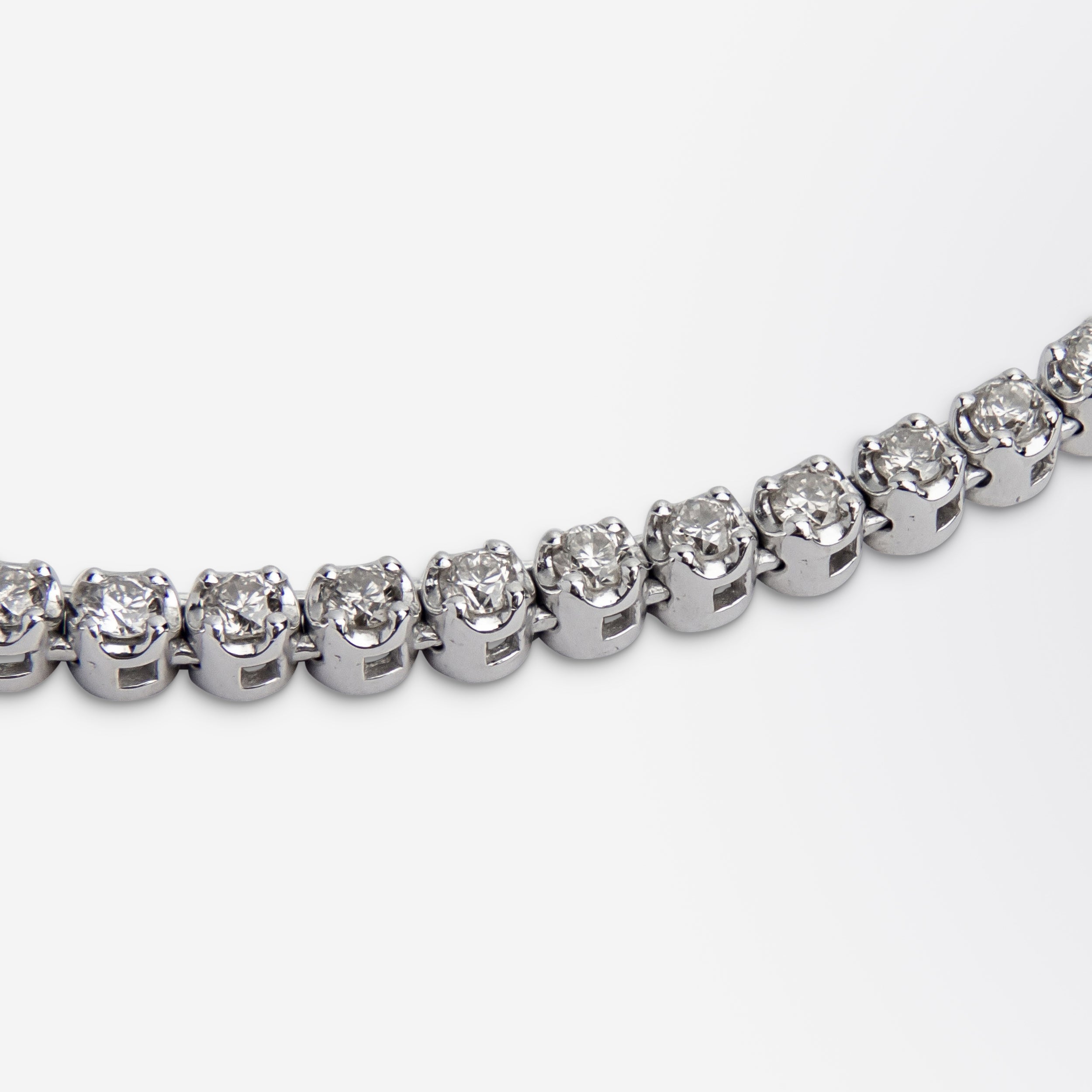 Confectionné en or blanc 14 carats, ce collier est un collier de type « tennis ». Il est serti de 166 diamants ronds taille brillant, de couleur KM et de pureté VS-SI, pour un total de 2,50 carats. Chaque pierre est sertie par quatre griffes, permettant une diffusion optimale de la lumière. Le collier se ferme par un fermoir à cliquet et un fermoir de sécurité en forme de huit, parfaitement fonctionnels et sécurisés. Un bijou d'une grande beauté, à porter seul avec une petite robe noire ou à associer à d'autres chaînes en or fin et colliers de type « tennis ».