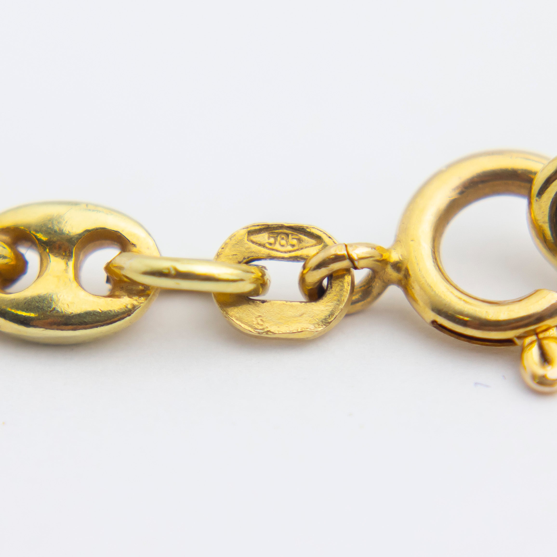 Ce collier imposant, fabriqué en Italie, est une chaîne à maillons dits « Gucci » ou « marin ». Confectionné en or jaune massif 14 carats, il porte le poinçon de la maison italienne Balestra, réputée pour la qualité de ses chaînes. Ce modèle particulier est lourd et, bien que plusieurs versions similaires existent sur le marché, il se distingue par sa maille pleine, contrairement à beaucoup d'autres qui sont creuses. Le fermoir à anneau est fonctionnel et sécurisé, garantissant ainsi une longue durée de vie à cette chaîne de qualité. Un bijou d'une grande beauté, unisexe, qui peut facilement accueillir un pendentif précieux.