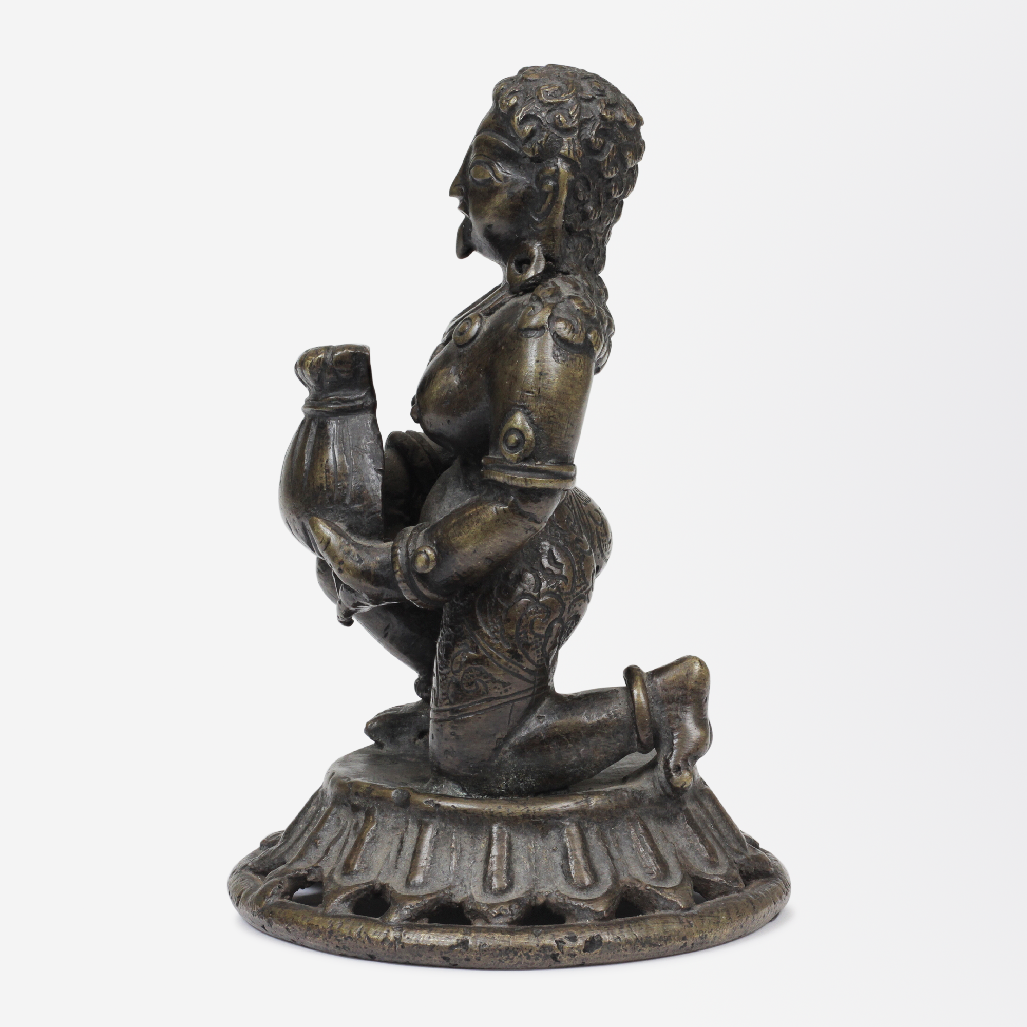 Magnifique statuette indienne en bronze de Krishna, datant probablement du XVIIe siècle. Elle représente le dieu agenouillé, tenant un sac. La statuette repose sur un socle rond ajouré en bronze et présente une riche patine ancienne. Krishna est une divinité majeure de l'hindouisme, fils de Devaki et Vasudeva. Un témoignage authentique et magnifique de l'histoire indienne.