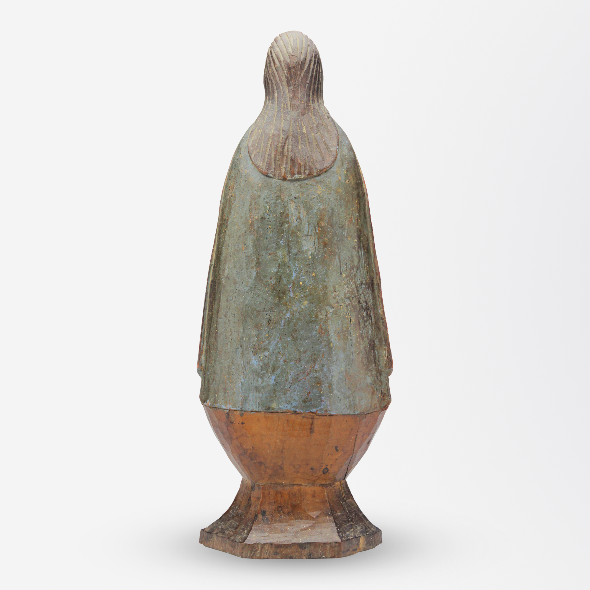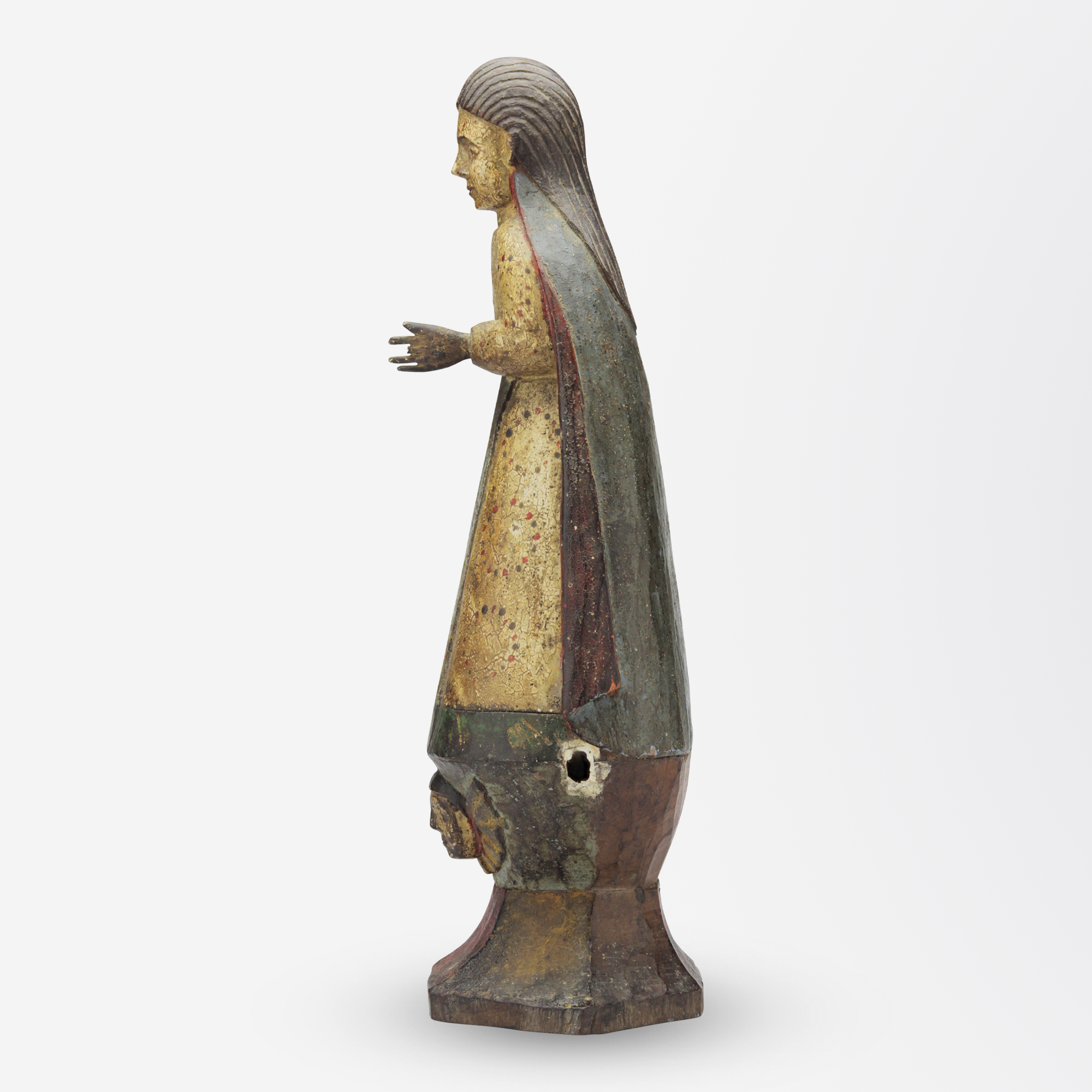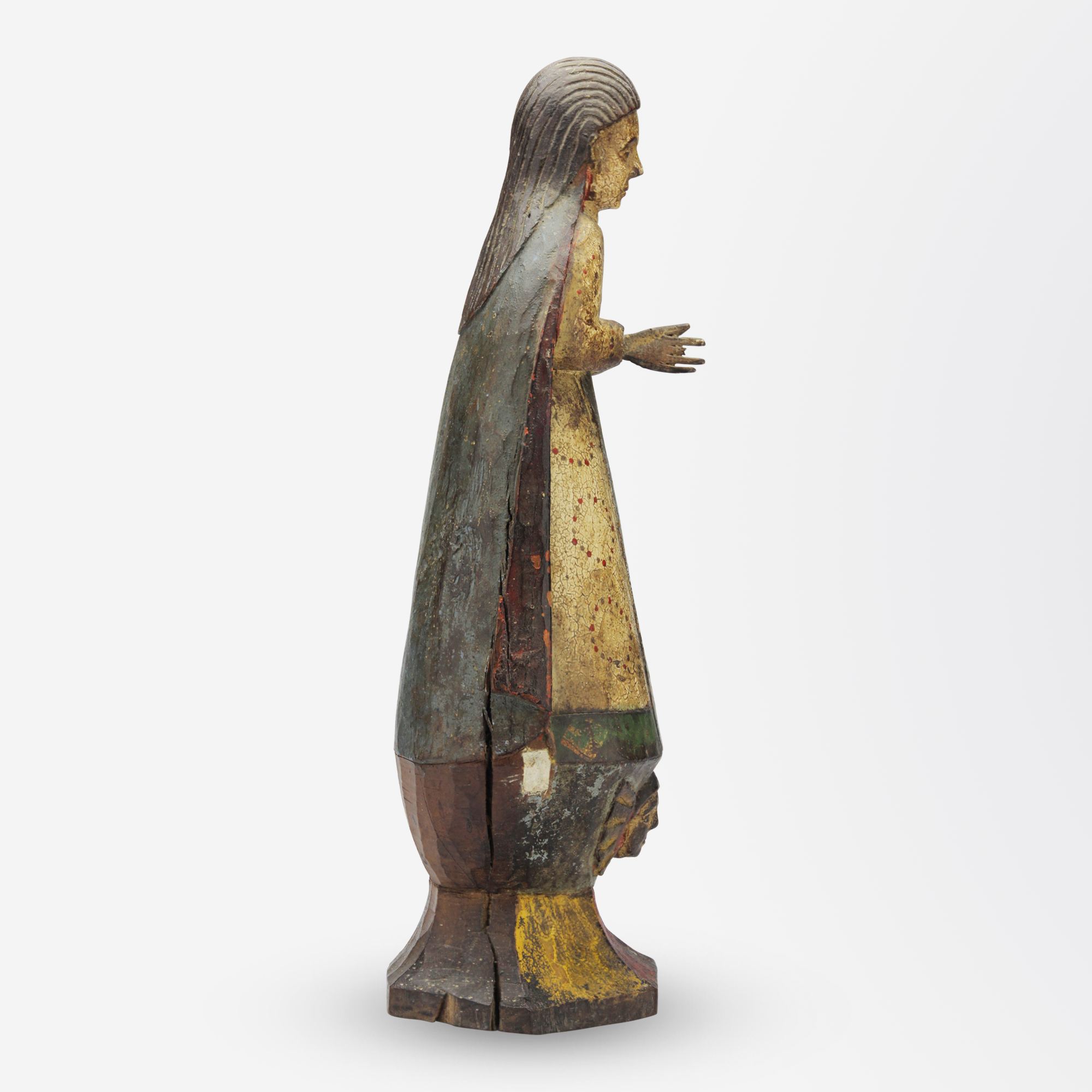 Une magnifique statuette de la Vierge Marie datant du XVIIe siècle. Probablement originaire du Guatemala, elle représente Marie, mère de Jésus, vêtue d'une robe blanche et d'un manteau rouge et bleu. On peut affirmer avec certitude qu'il s'agit bien de Marie, car, dans l'histoire de l'art, elle est le plus souvent représentée vêtue d'un manteau rouge et bleu, et ce depuis au moins 500 après J.-C. Le bleu, en raison de la valeur de ses pigments, était réservé à la haute noblesse et aux plus fortunés ; il était donc tout à fait approprié d'habiller la Vierge Marie de ce que l'on appelle aujourd'hui le bleu « marial ». La statuette est représentée avec une main manquante, aujourd'hui disparue.