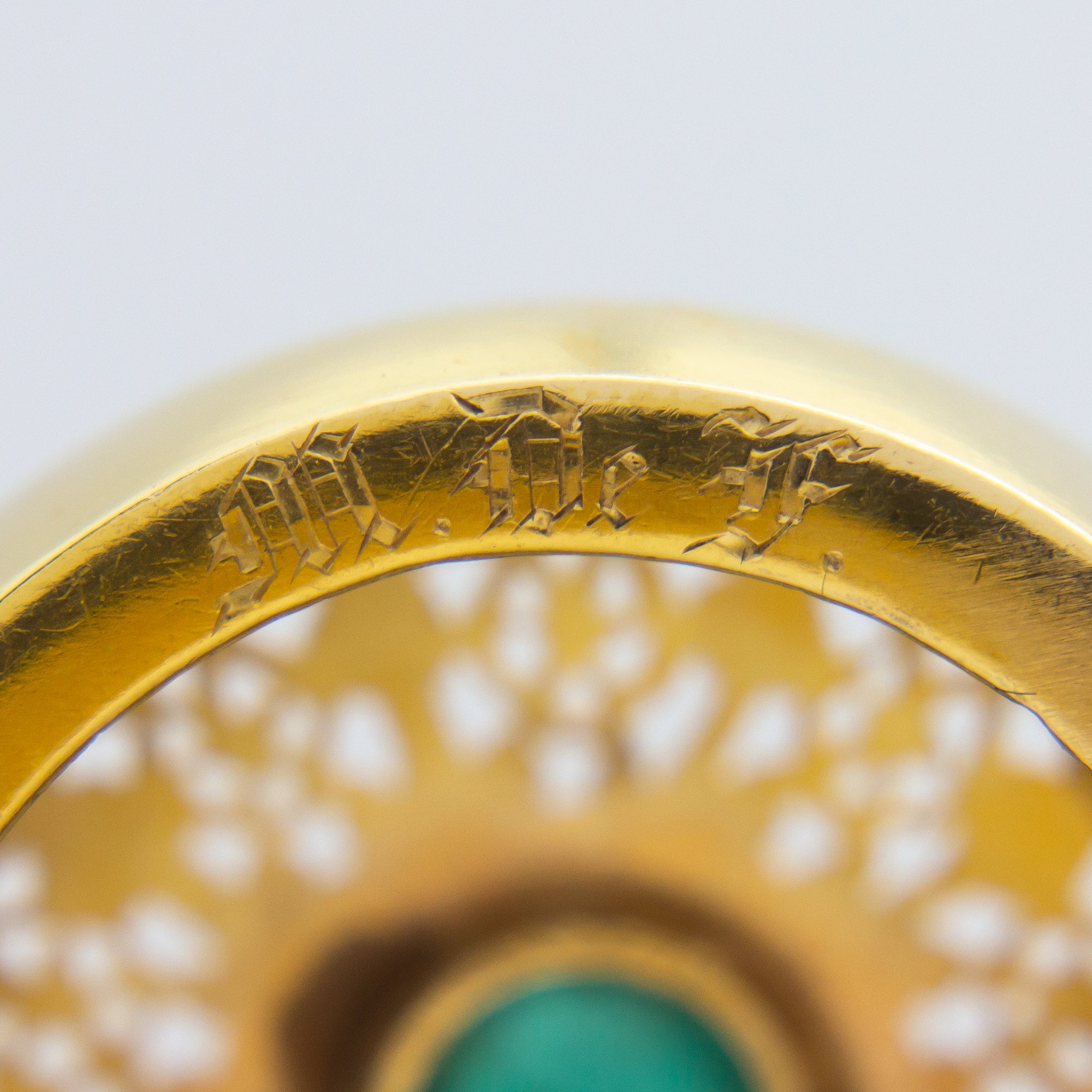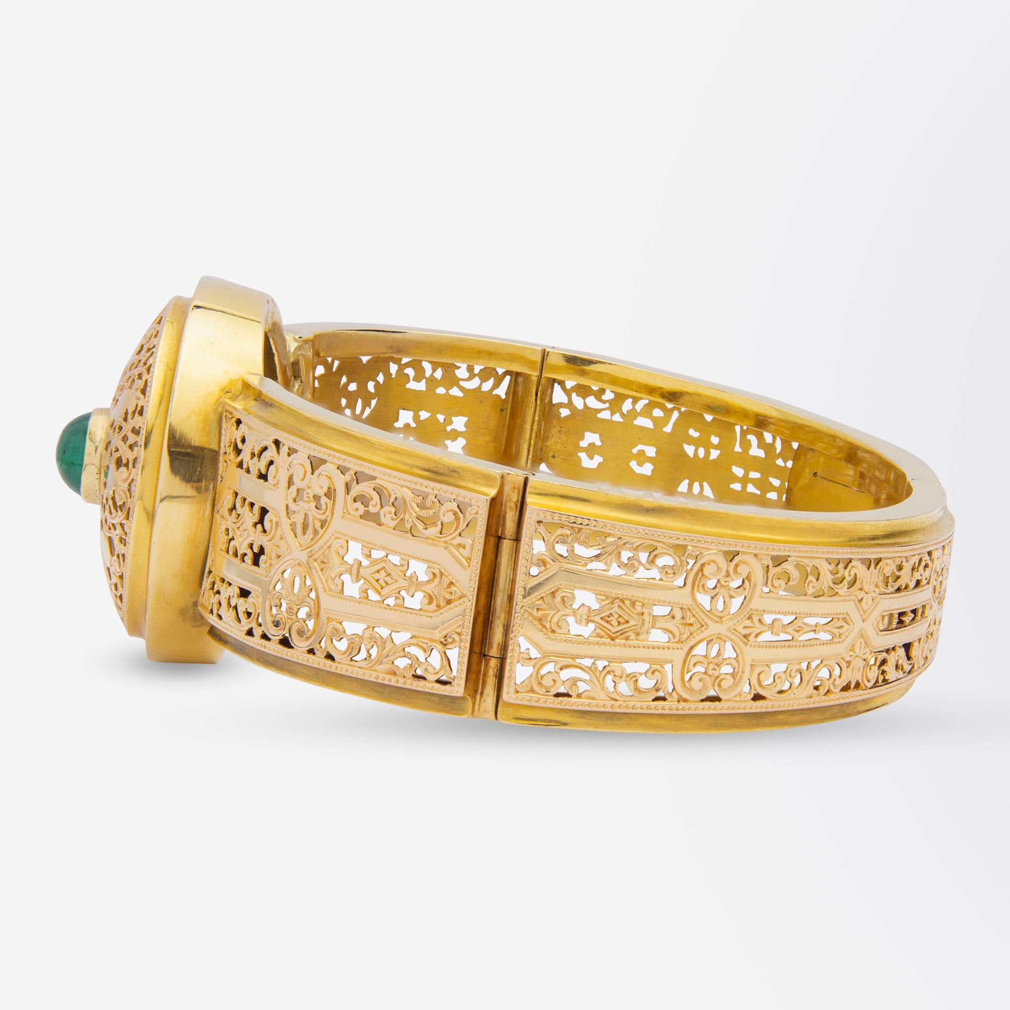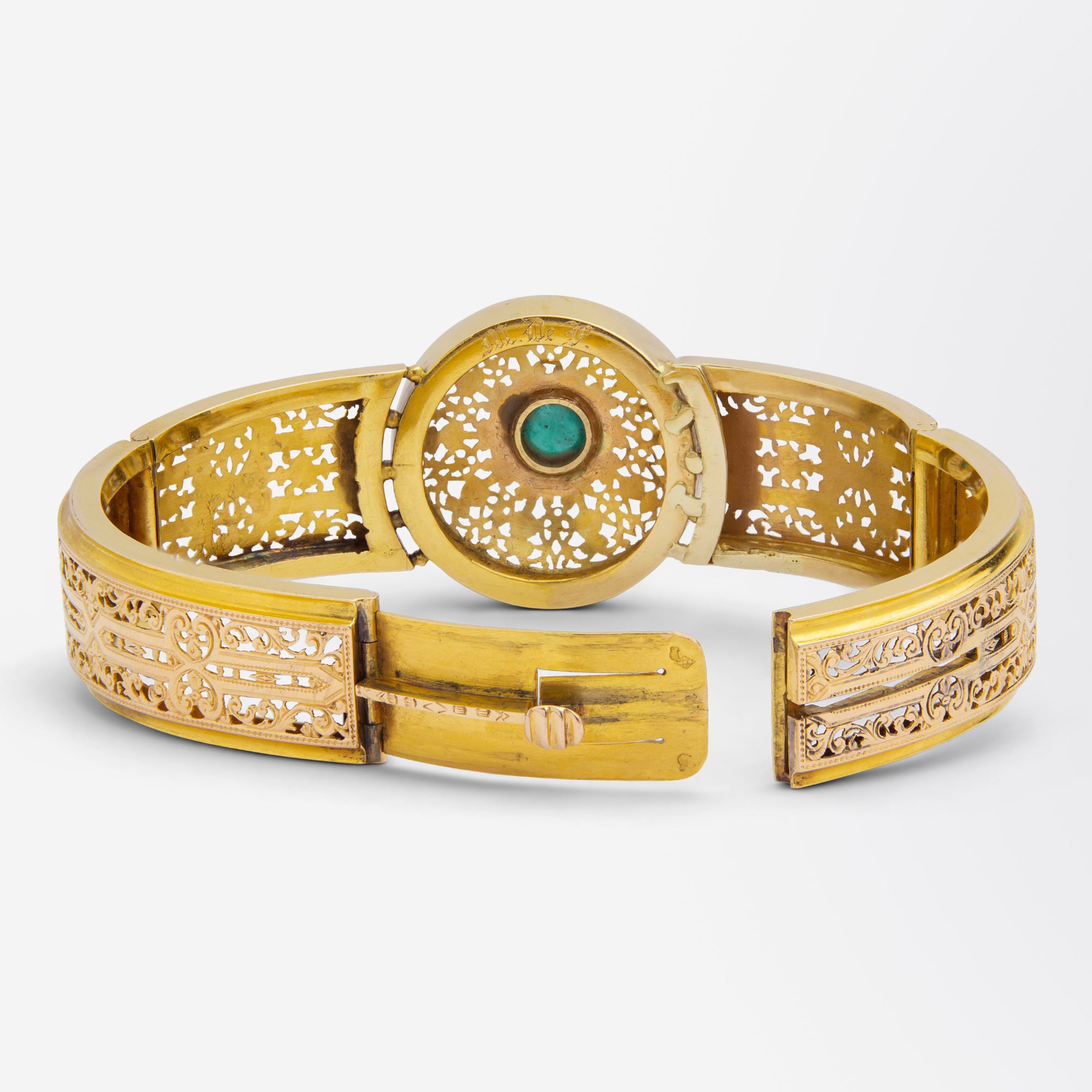 Un très beau bracelet jonc français en or rose et jaune 18 carats, à charnière, orné d'une émeraude cabochon, datant de la fin du XIXe siècle. Entièrement réalisé à la main, ce bracelet présente un anneau finement ajouré et gravé, orné en son centre d'un médaillon rond serti d'une émeraude cabochon ronde. Il est muni d'un fermoir à cliquet dissimulé, portant quatre poinçons français très discrets. L'un d'eux semble être le poinçon de pureté français, tandis que les autres, malheureusement illisibles, sont probablement des poinçons de maître. Un magnifique bijou français du XIXe siècle, authentique et en très bon état compte tenu de sa finesse d'exécution.