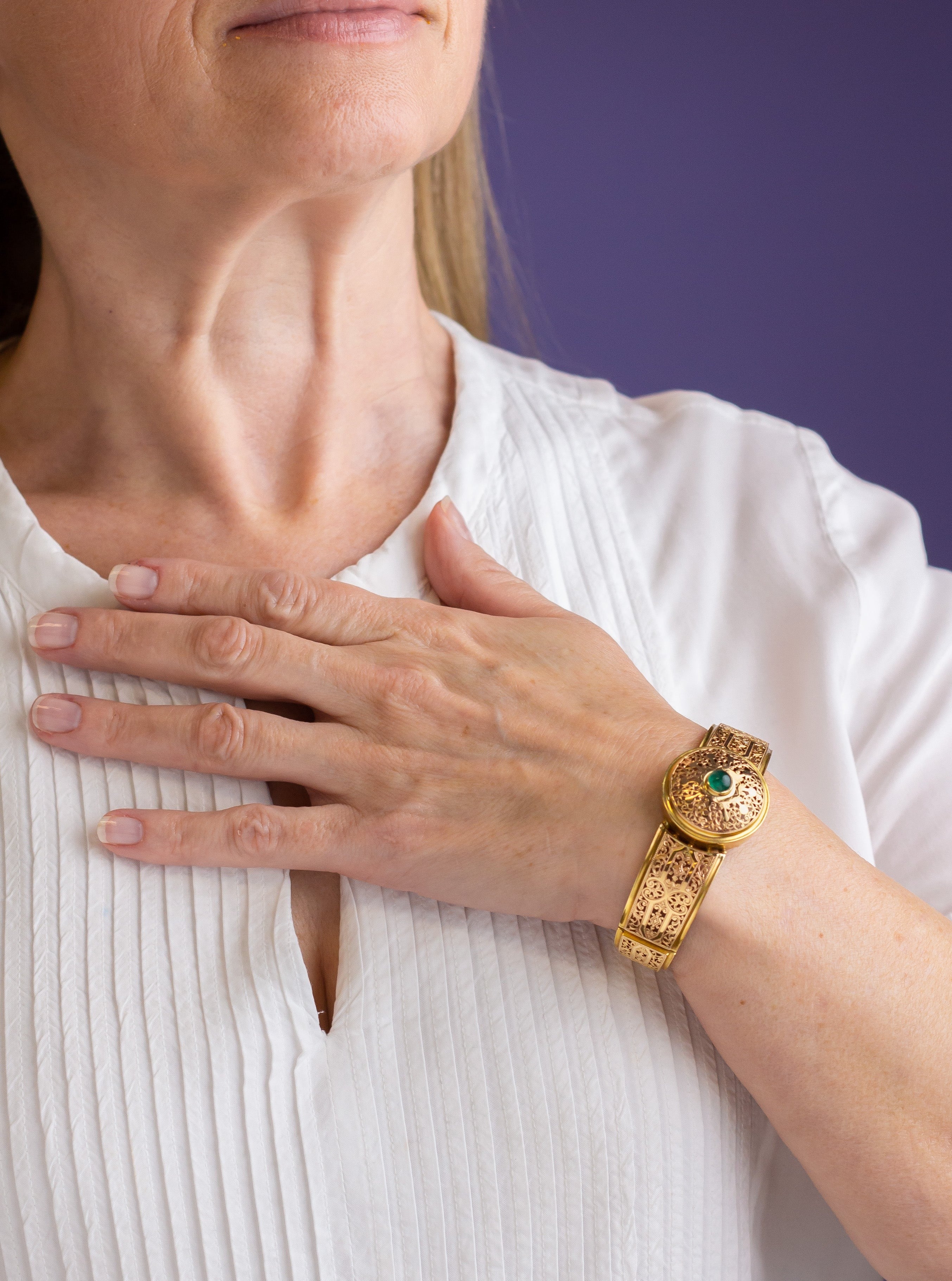 Bracelet jonc articulé français en or 18 carats et émeraude cabochon