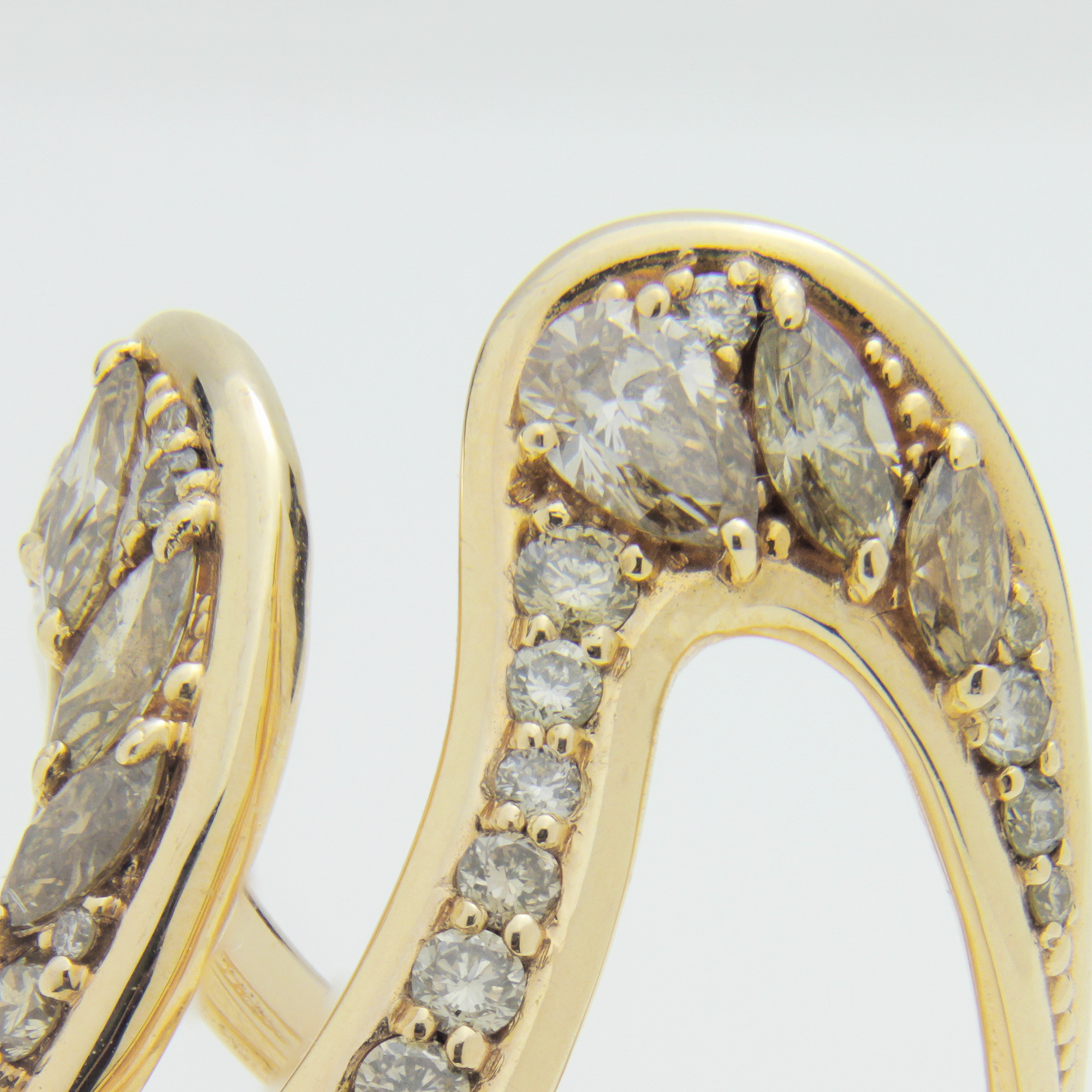Un bracelet manchette exceptionnel et sa bague assortie en or rose 18 carats, sertis de 19,26 carats de diamants taille fantaisie, de couleur cognac, brun et champagne. Cet ensemble a été conçu par le joaillier brésilien Fernando Jorge pour sa collection « Stream » et réalisé respectivement en 2015 et 2016. La bague et le bracelet, poinçonnés anglais, sont d'une qualité exceptionnelle, alliant éléments moulés et faits main. Ils sont sertis de diamants de tailles variées : rond brillant, marquise, émeraude, baguette et poire, de couleur C1 à C5 et de pureté SI. Le bracelet manchette est doté d'une double charnière à ressort et fonctionne parfaitement. Selon le sens dans lequel il est porté, il convient aux poignets fins à moyens.