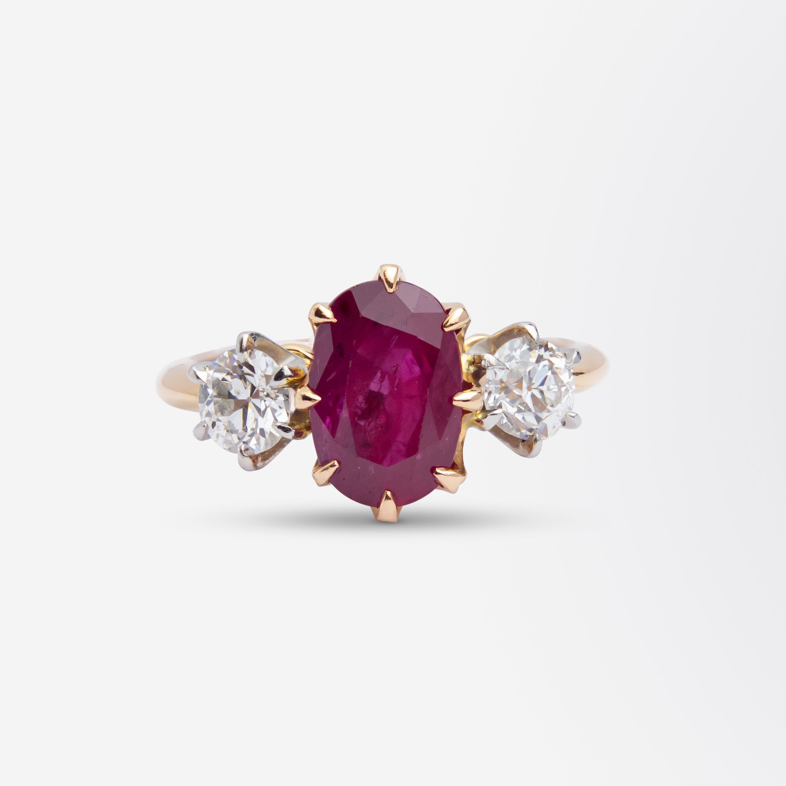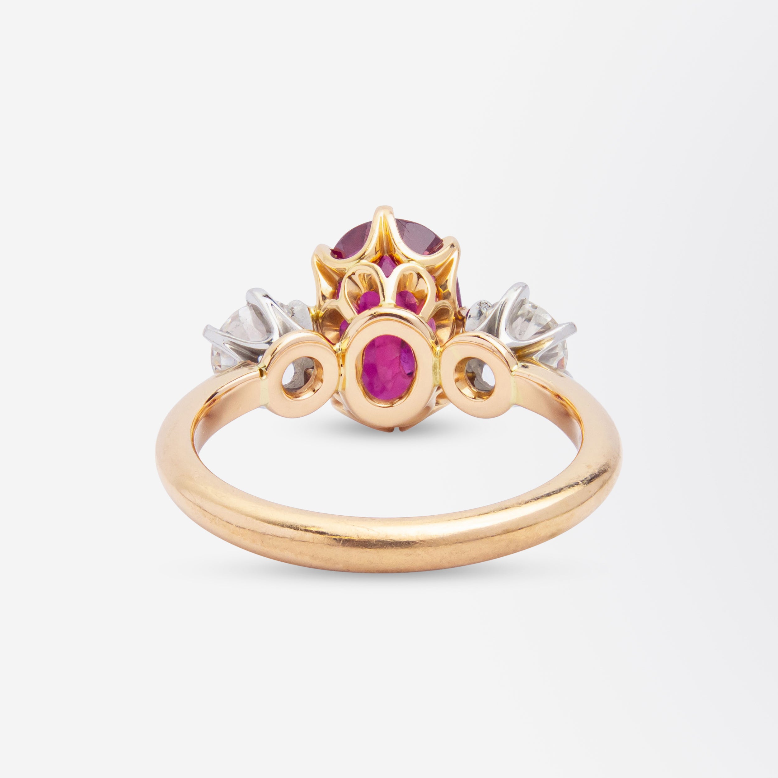 Cette bague en or rose 18 carats, ornée d'un rubis et de diamants, est de fabrication récente. Le rubis central, de taille ovale mixte, est d'origine thaïlandaise et pèse 2,44 carats. Il est à noter que ce type de rubis provient d'une source désormais épuisée en Thaïlande. Deux diamants taille ancienne européenne, sertis chacun sur six griffes en platine, encadrent le rubis. Ils sont de couleur G/H et de pureté SI1-SI2, pour un poids total de 0,66 carat. Bien que relativement récente, cette bague, entièrement réalisée à la main, est d'une qualité exceptionnelle, sublimant les pierres anciennes qui la composent. Le poinçon attestant de la pureté des métaux utilisés ne permet pas de déterminer son origine exacte. Figurant parmi nos plus belles bagues en rubis, elle pourrait, associée à une alliance en or et diamants, constituer une magnifique parure de mariage.