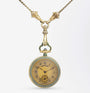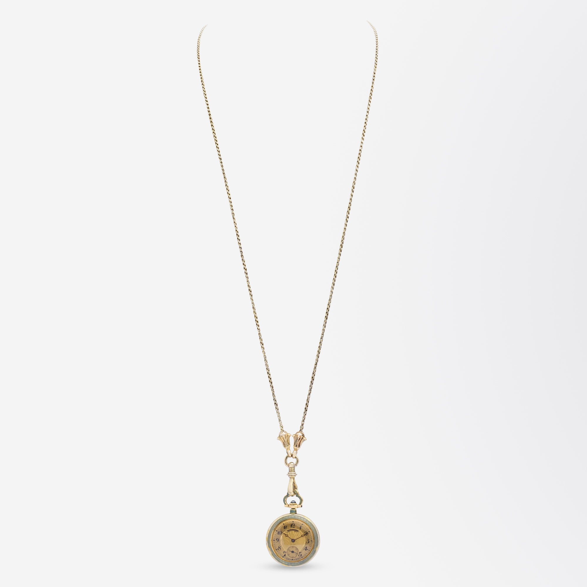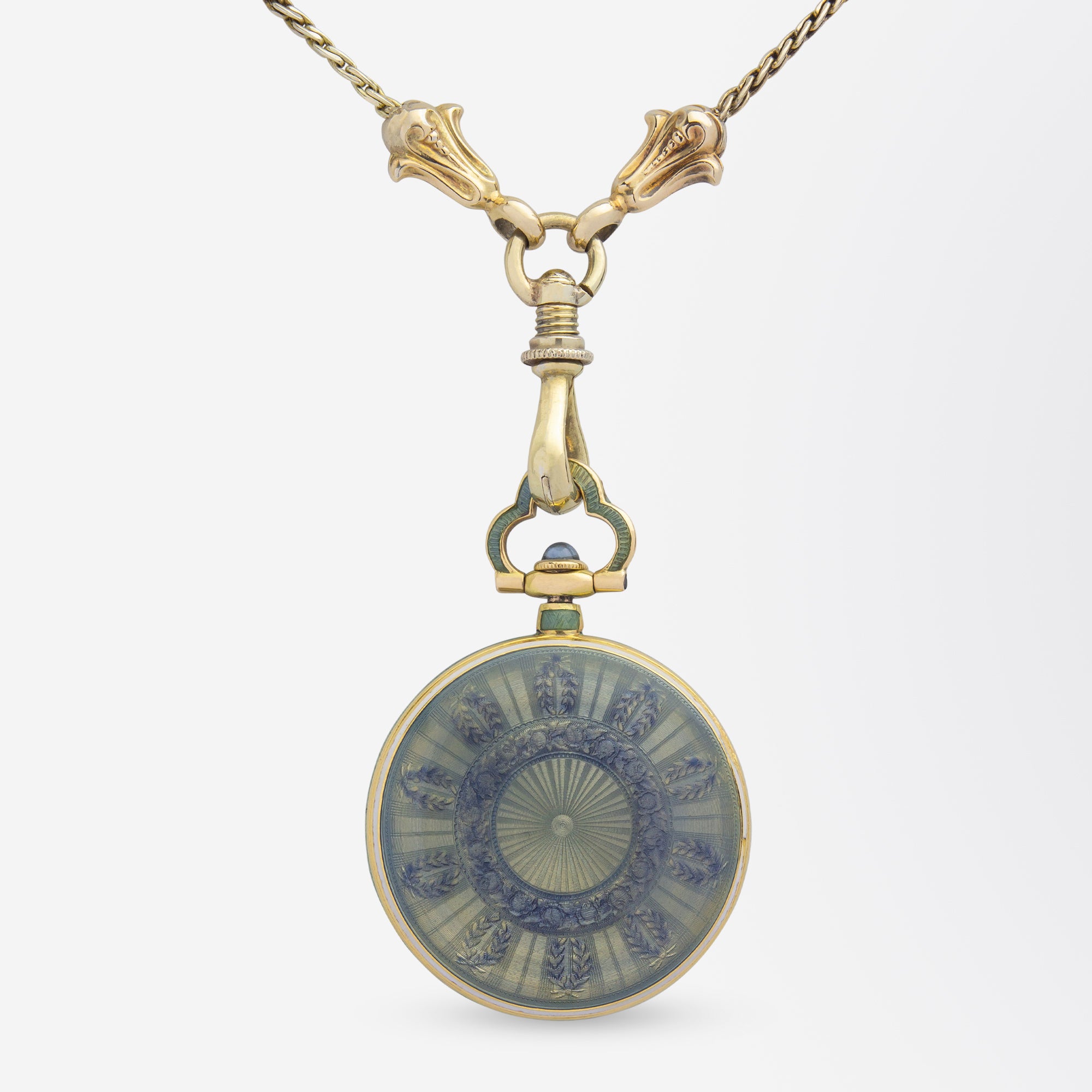 Cette montre pendentif Art nouveau, montée sur une chaîne, a été fabriquée pour Tiffany & Co. et destinée à la vente aux États-Unis. Elle est suspendue à une chaîne gourmette en plaqué or jaune, munie d'un fermoir pivotant, probablement non d'origine. Cette montre pendentif, finement ouvragée, est en or jaune 18 carats et possède un fond et une lunette émaillés. Le cadran en or jaune arbore des chiffres arabes noirs et une petite seconde, ainsi que les inscriptions « Swiss » et « Tiffany & Co. ». Remontée par la couronne à 12 heures, la montre est en état de marche, mais sa précision n'a pas été testée et elle n'a pas été révisée récemment. Son mouvement est un Longines à 17 rubis et l'intérieur du fond de boîtier porte la mention « Made for Tiffany & Co. by Wittnauer & Co. ». Nous estimons que cette montre date de l'après-Première Guerre mondiale, vers 1915, époque à laquelle Tiffany était reconnu comme l'un des plus grands joailliers et détaillants au monde. Cette pièce magnifique présente quelques manques d'émail que nous considérons comme normaux compte tenu de son âge et qui n'altèrent en rien sa beauté.