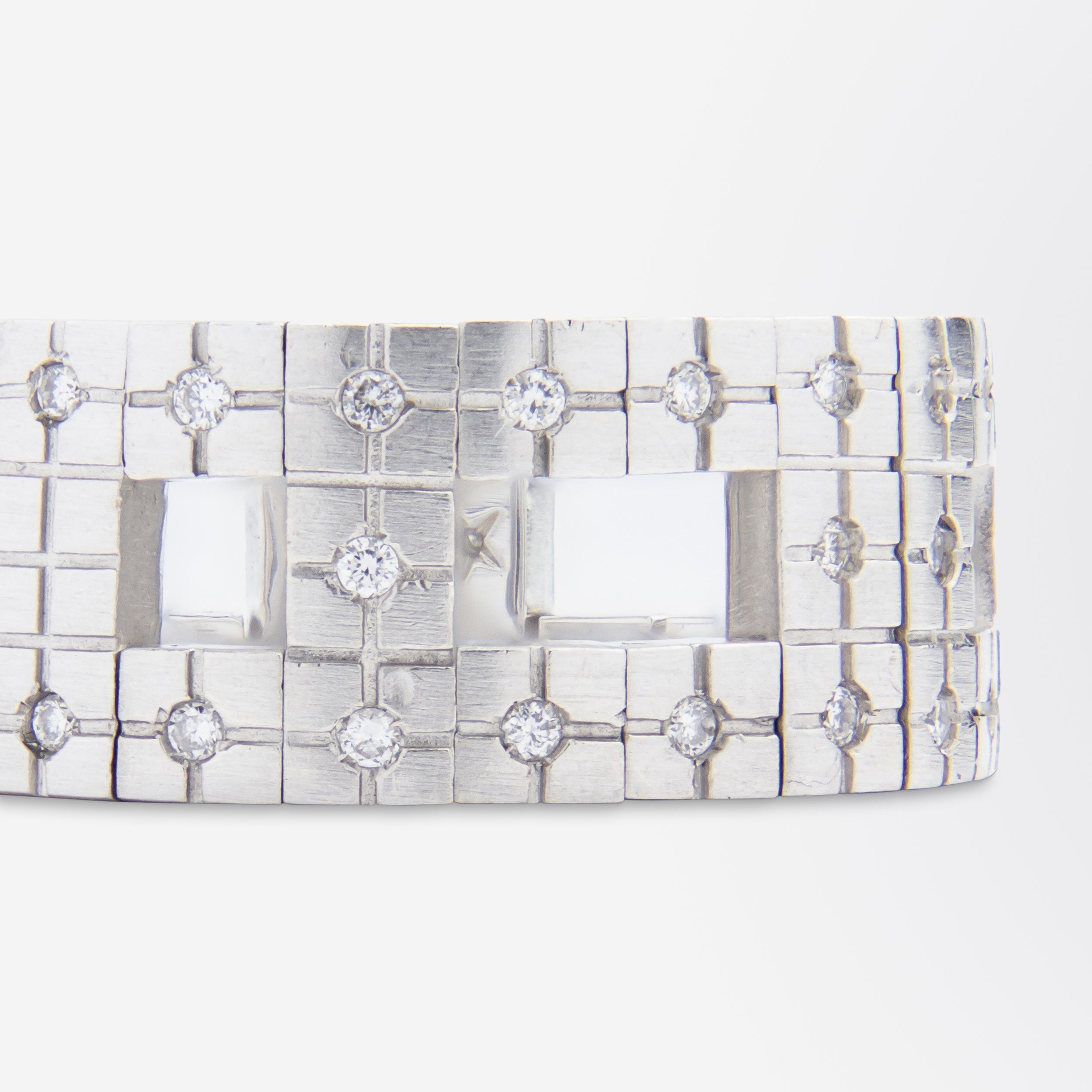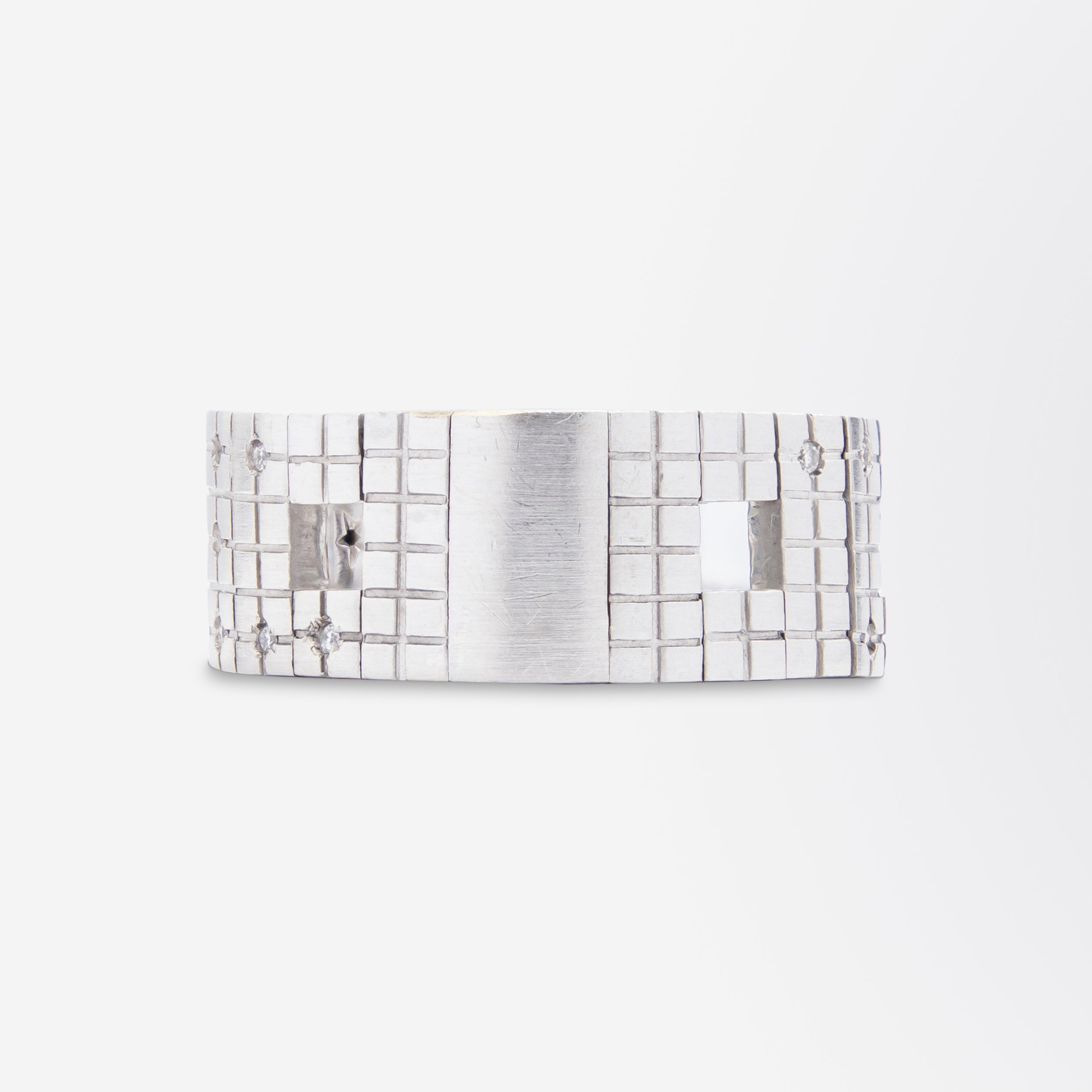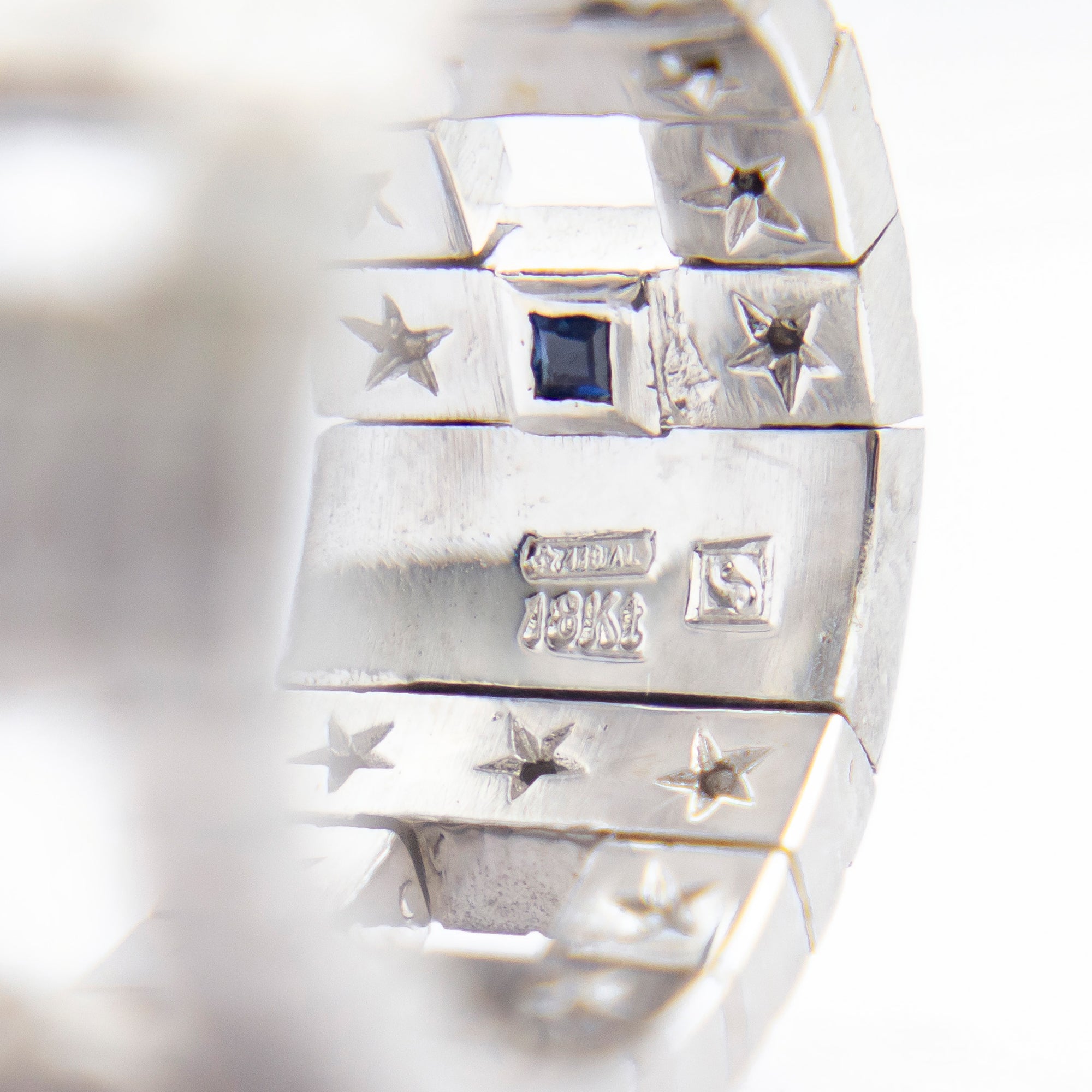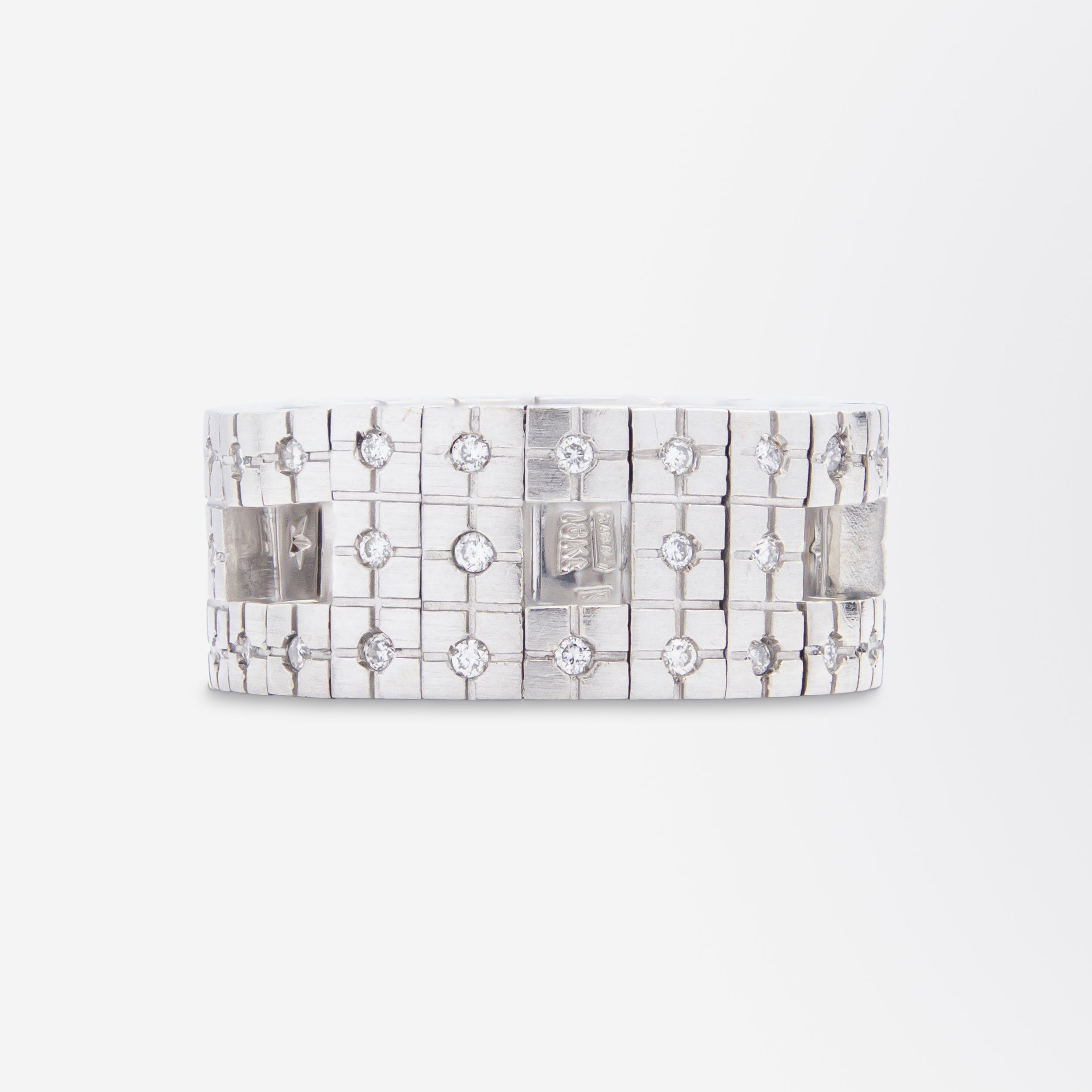 Cette bague plutôt originale a été fabriquée en Italie et distribuée par la célèbre maison de joaillerie brésilienne H. Stern. Flexible, elle est composée de maillons carrés et barres en or blanc 18 carats satiné, articulés pour épouser la forme du doigt. Ces maillons sont sertis de 36 diamants ronds taille brillant, sertis à grains, de couleur H et de pureté VS-SI, pour un poids total de 0,18 carat. À l'intérieur, près des poinçons, se trouve un saphir taille carrée serti clos, invisible à l'œil nu, une sorte de « saphir secret ». La bague porte des poinçons italiens ainsi que le poinçon de H. Stern, la célèbre maison de joaillerie brésilienne. Ce modèle, baptisé « Metropolis », date probablement du début du XXIe siècle. D'une conception vraiment unique, cette bague est une pièce que vous aurez peu de chances de croiser.