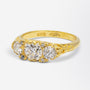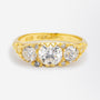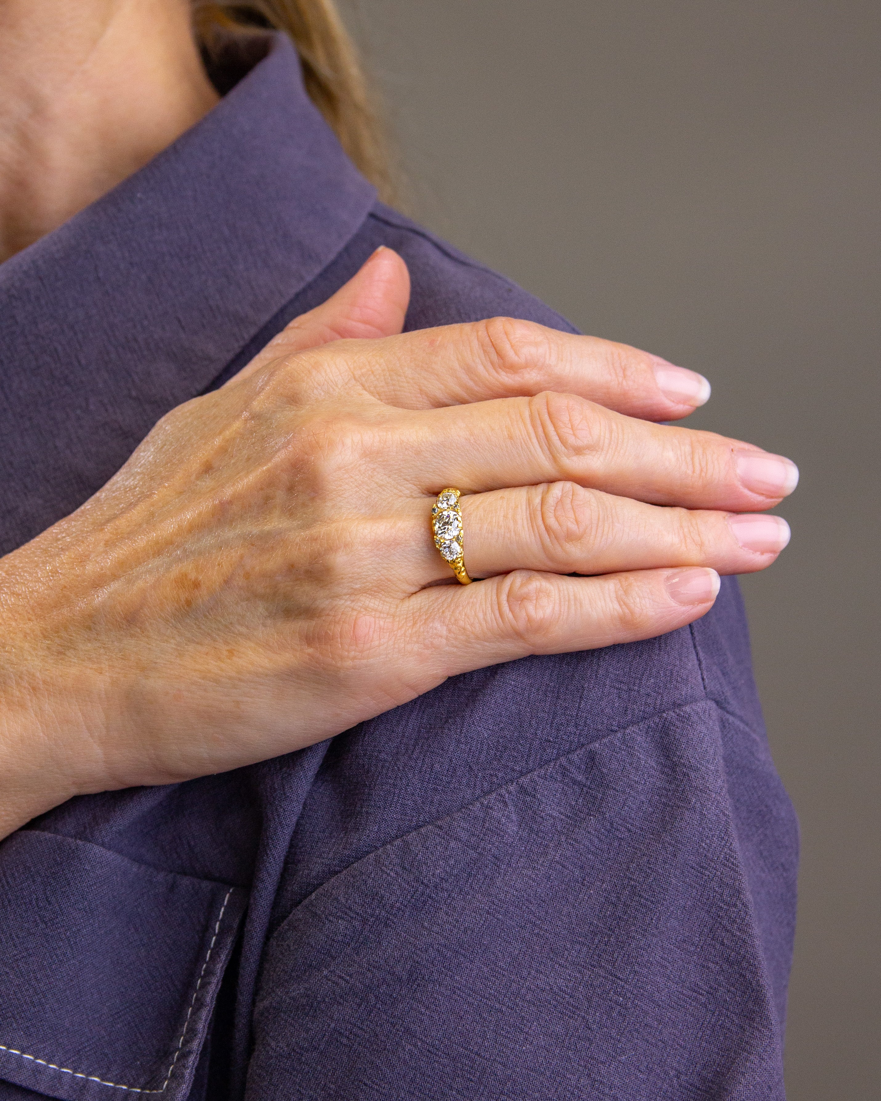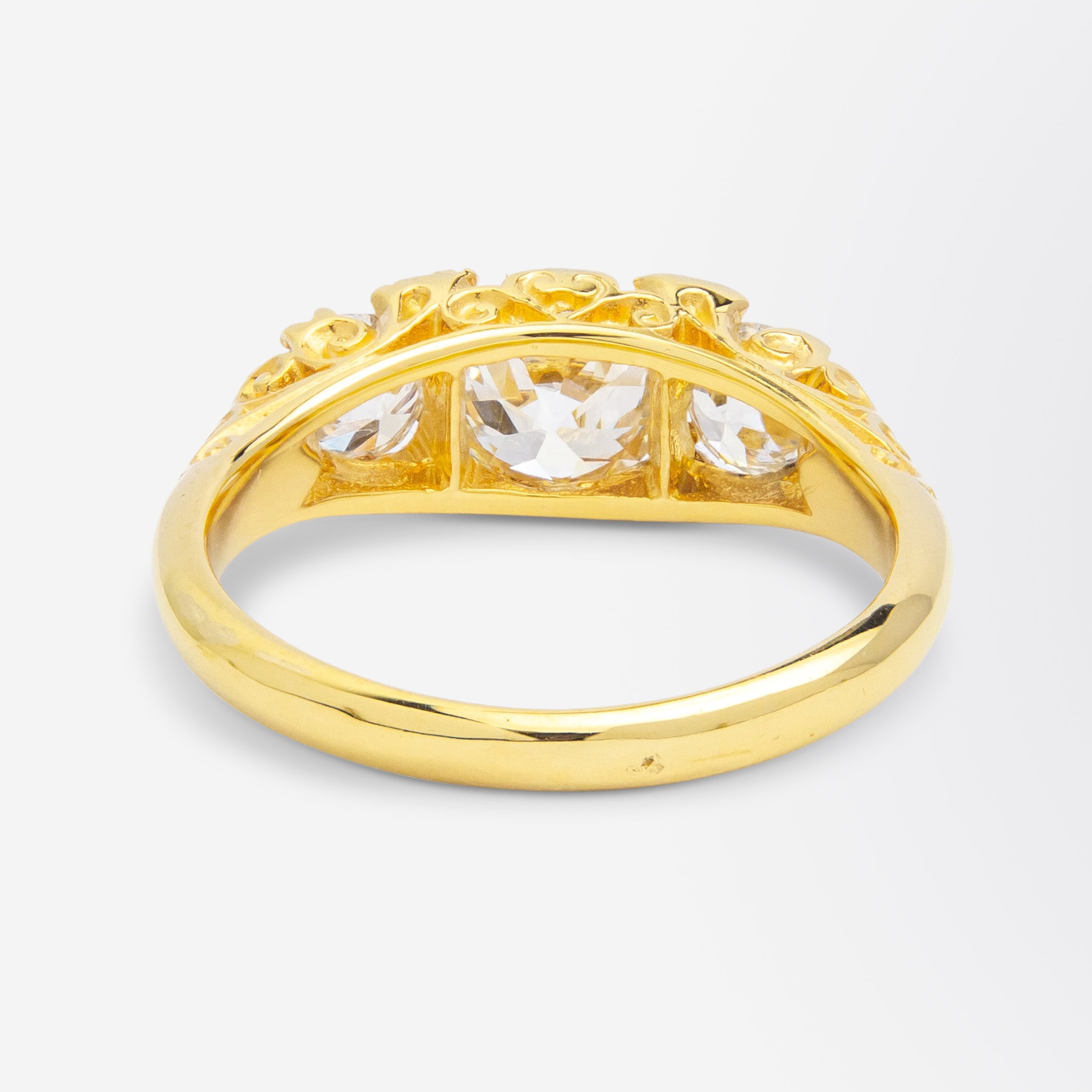 Cette bague en diamant est montée sur une monture en or jaune 18 carats, évoquant les créations du XIXe siècle. La monture, coulée et finie à la main, est sertie de trois diamants taille ancienne, disposés d'est en ouest, autour d'une pierre centrale de couleur F/G et de pureté VS1, pesant 0,82 carat. Le diamant central est flanqué de deux diamants taille ancienne, chacun de couleur G et de pureté SI1, totalisant 0,62 carat. Quatre autres diamants taille simple, sertis entre les diamants principaux, ajoutent au charme de la bague. Au total, le bijou est serti d'environ 1,47 carat de diamants. Bien que de style ancien, sa fabrication date probablement des 40 ou 50 dernières années. Il est à noter que l'un des diamants taille simple est d'une couleur nettement plus foncée que les trois autres, ce qui n'altère en rien la beauté de la bague et contribue même à son caractère unique. Une très belle bague sertie de diamants de qualité, qui pourrait aisément servir de bague de fiançailles.