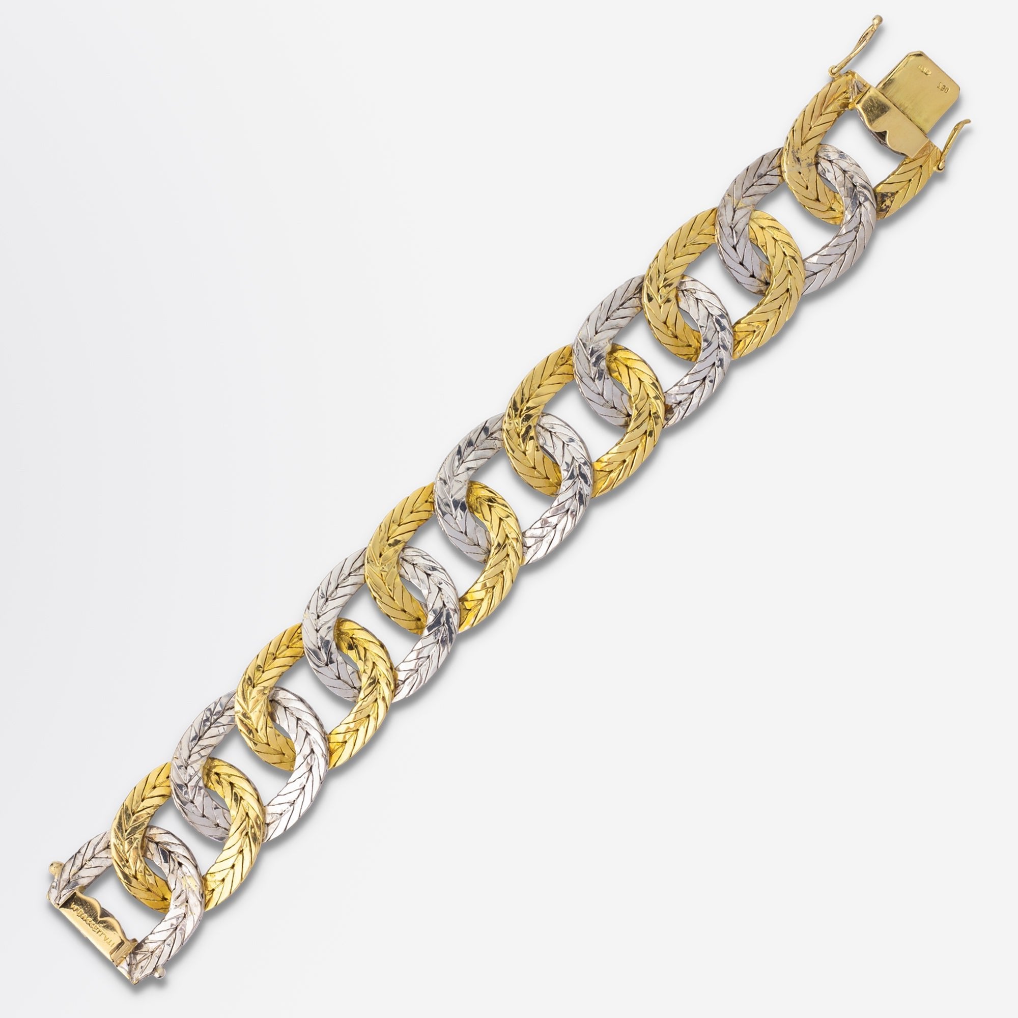 Nous sommes ravis de vous présenter ce magnifique bracelet artisanal signé Mario Buccellati. Ce bracelet bicolore est composé d'ovales d'or 18 carats jaune et blanc, tressés en alternance. Les maillons entrelacés sont ensuite finement brossés pour obtenir un fini mat doux, évoquant la finition florentine. Le bracelet est doté d'un fermoir à cliquet et de deux fermoirs de sécurité en forme de huit, intégrés à un fermoir à maillons. Le fermoir et les fermoirs de sécurité fonctionnent parfaitement et assurent un maintien optimal du bracelet grâce à ses trois points d'attache. Bien que ce bracelet soit relativement fin, sa qualité de fabrication exceptionnelle, signée Mario Buccellati, sans doute l'orfèvre italien le plus renommé, compense largement ce petit détail. Difficile de dater précisément sa fabrication, il est probable qu'il date de la fin du XXe siècle. Un bijou italien en or d'exception.