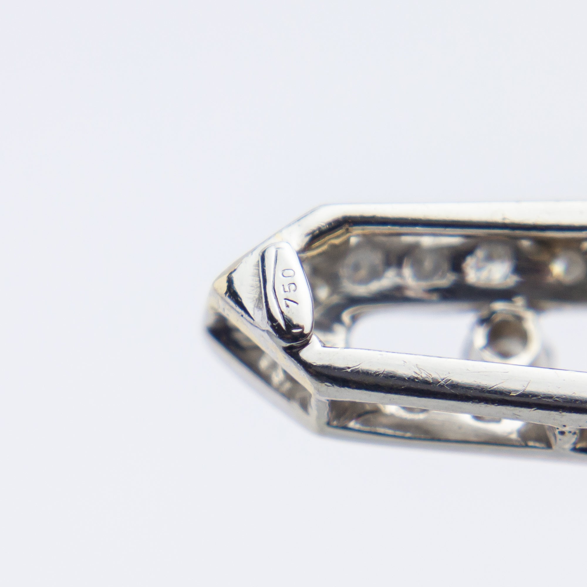 Cette broche de style Art déco est réalisée en or blanc 18 carats et sertie de diamants ronds taille brillant. De forme barrette, elle est entièrement sertie de 114 diamants ronds taille brillant, de couleur GJ et de pureté VS-P1, pour un poids total de 1,54 carat. Rhodiée, elle conserve la blancheur de l'or et, contrairement à une bague ou un bracelet, ne nécessite pas d'entretien fréquent. En excellent état, elle est dotée d'une épingle à charnière avec fermoir de sécurité de type trombone, parfaitement fonctionnel et sécurisé. Cette ravissante broche en diamants, au style Art déco raffiné, sublimera à merveille un manteau d'hiver ou une petite robe noire.