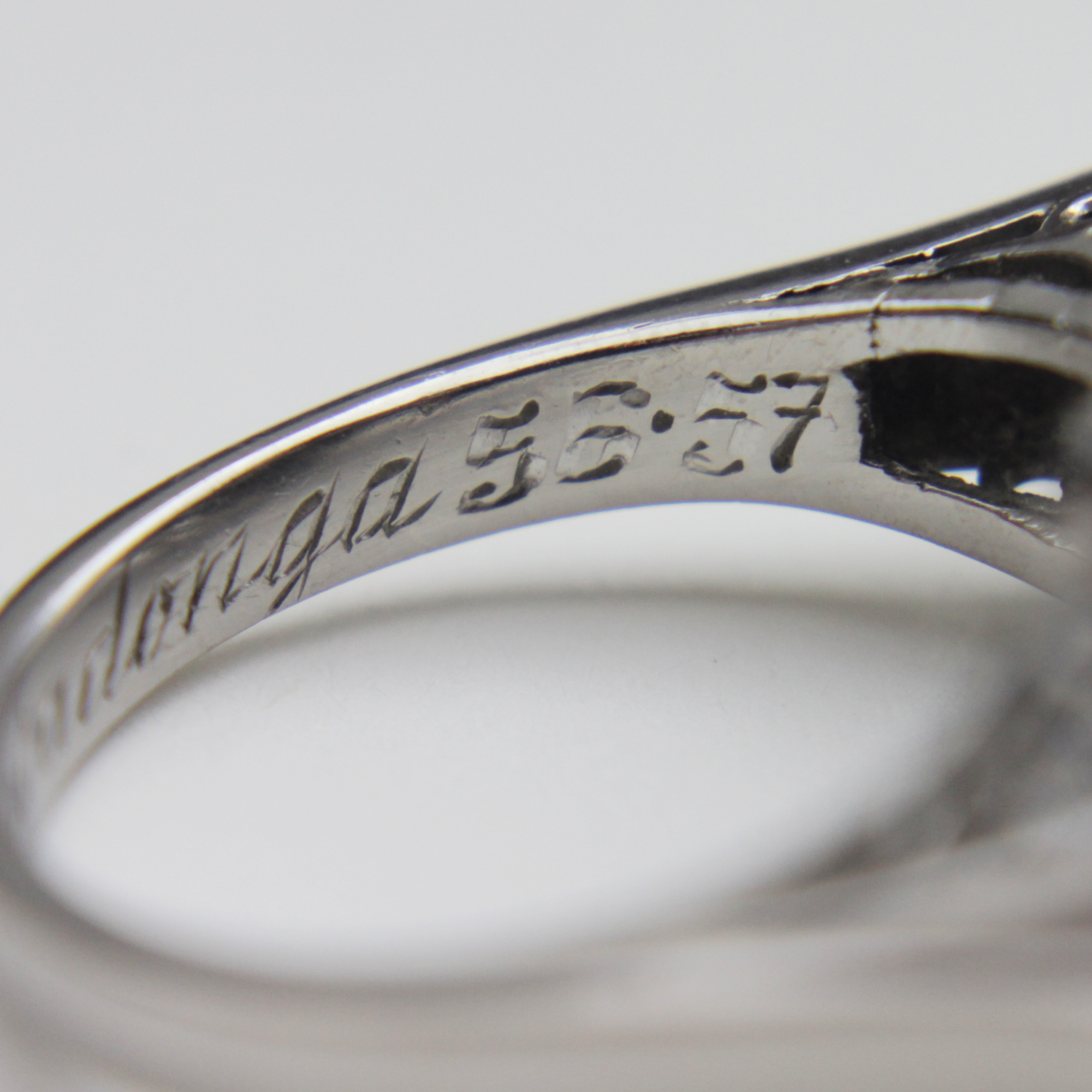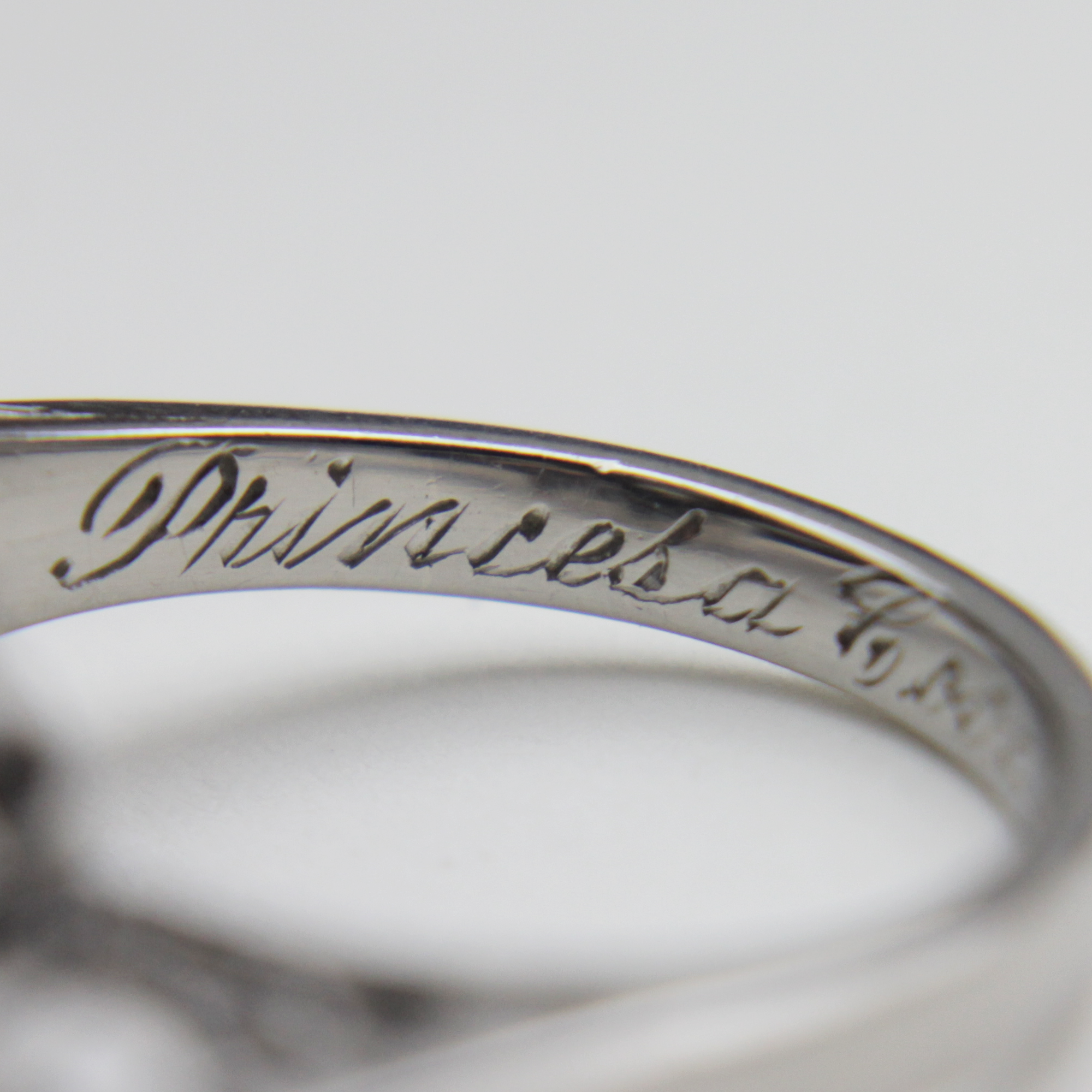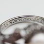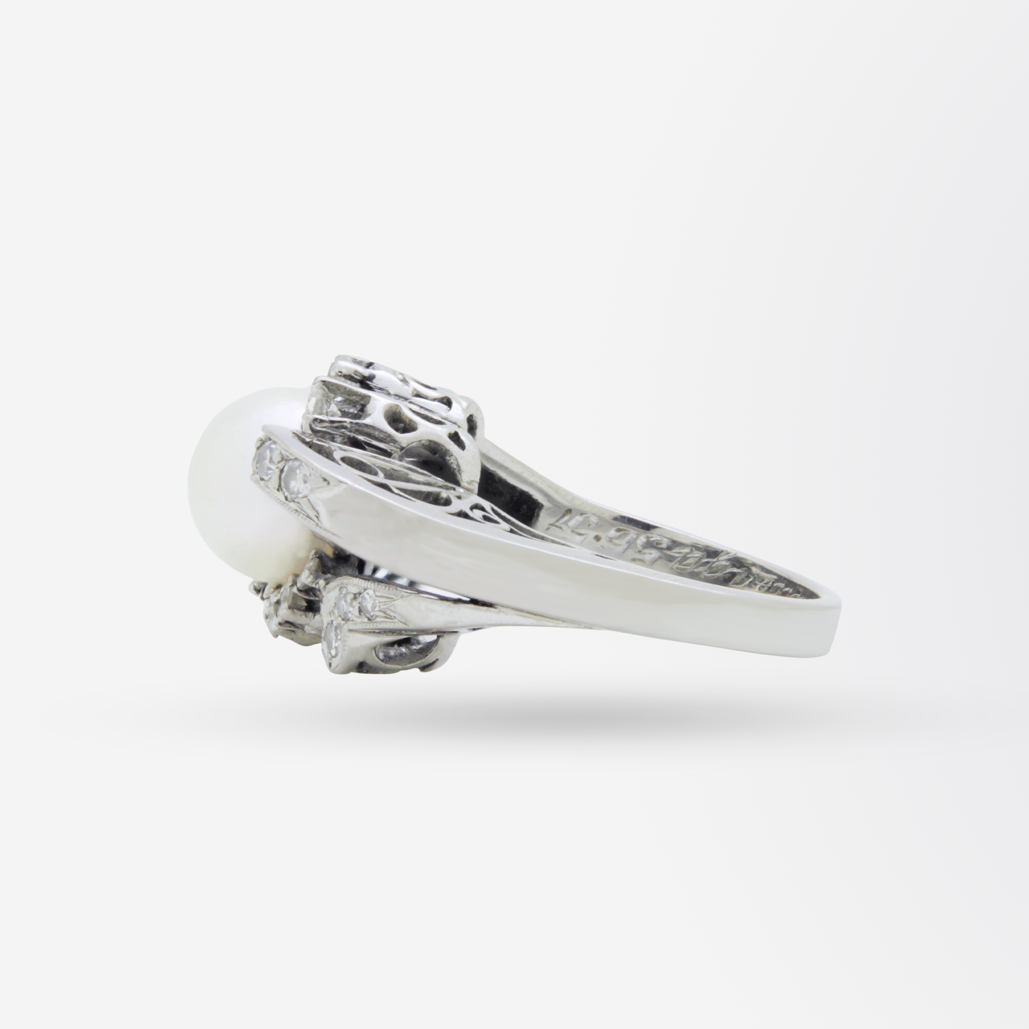 Une magnifique bague de soirée artisanale, typique de la période rétro du milieu du XXe siècle. Réalisée en or blanc 18 carats, elle est sertie de diamants taille simple et d'une perle de culture Akoya. Les anneaux, également sertis de diamants, s'élèvent avec fluidité, tels un ruban, pour rejoindre la perle blanche. Son design audacieux évoque les bijoux de cocktail des années 1940 et 1950. Une date, « 5.6.57 », est gravée à l'intérieur, indiquant qu'elle a été offerte en 1957. L'inscription « Princesa Covadonga » signifie « Princesse Covadonga », Covadonga étant une région d'Espagne. Une bague de soirée vraiment originale, à la fois audacieuse et harmonieuse, d'une élégance rare.