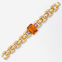 Ce superbe bracelet rétro est un exemple remarquable de bijoux cocktail des années 1940. Ce bracelet en or 18 carats, composé de maillons fantaisie ajourés, est orné d'une citrine octogonale à facettes sertie par quatre griffes. La citrine est encadrée par deux rangées de rubis synthétiques taille carrée et de diamants taille ancienne. Les rubis synthétiques, courants à l'époque rétro, étaient généralement de grande qualité. Sur ce bracelet, l'un d'eux s'est perdu et a été remplacé par un rubis naturel. Le bracelet se ferme par un fermoir à pression bombé et une chaînette de sécurité amovible (non visible sur les photos). De taille généreuse, il conviendra aisément aux poignets moyens à larges. Bien qu'il ne porte pas de poinçon, il est fort probable qu'il ait été fabriqué aux États-Unis dans les années 1940, comme beaucoup de bijoux rétro. En excellent état, c'est un magnifique bracelet qui ravira les amatrices de bijoux en or audacieux.