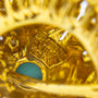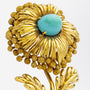 Au milieu du XXe siècle, Tiffany & Co. était incontestablement l'une des maisons de joaillerie les plus luxueuses au monde. Cette magnifique broche stylisée en forme de fleur date de cette période faste et a été fabriquée en Italie pour la vente au détail par Tiffany. Cette imposante broche est en or jaune 18 carats et sertie d'une turquoise cabochon ovale qui forme le cœur de la fleur. L'extrémité des pétales est texturée d'une incroyable finition mouchetée, créant un contraste saisissant. La broche est munie d'une épingle à charnière avec fermoir de sécurité à rouleau pour une sécurité optimale. Une plaque signée à l'intérieur, au dos de la fleur, indique qu'elle a été fabriquée en Italie pour les boutiques Tiffany. La turquoise cabochon est d'une qualité telle qu'elle provient probablement de Perse (l'Iran actuel), où l'on extrayait certaines des plus belles turquoises au monde au XXe siècle. Une broche absolument ravissante, idéale pour orner un manteau d'hiver épais.