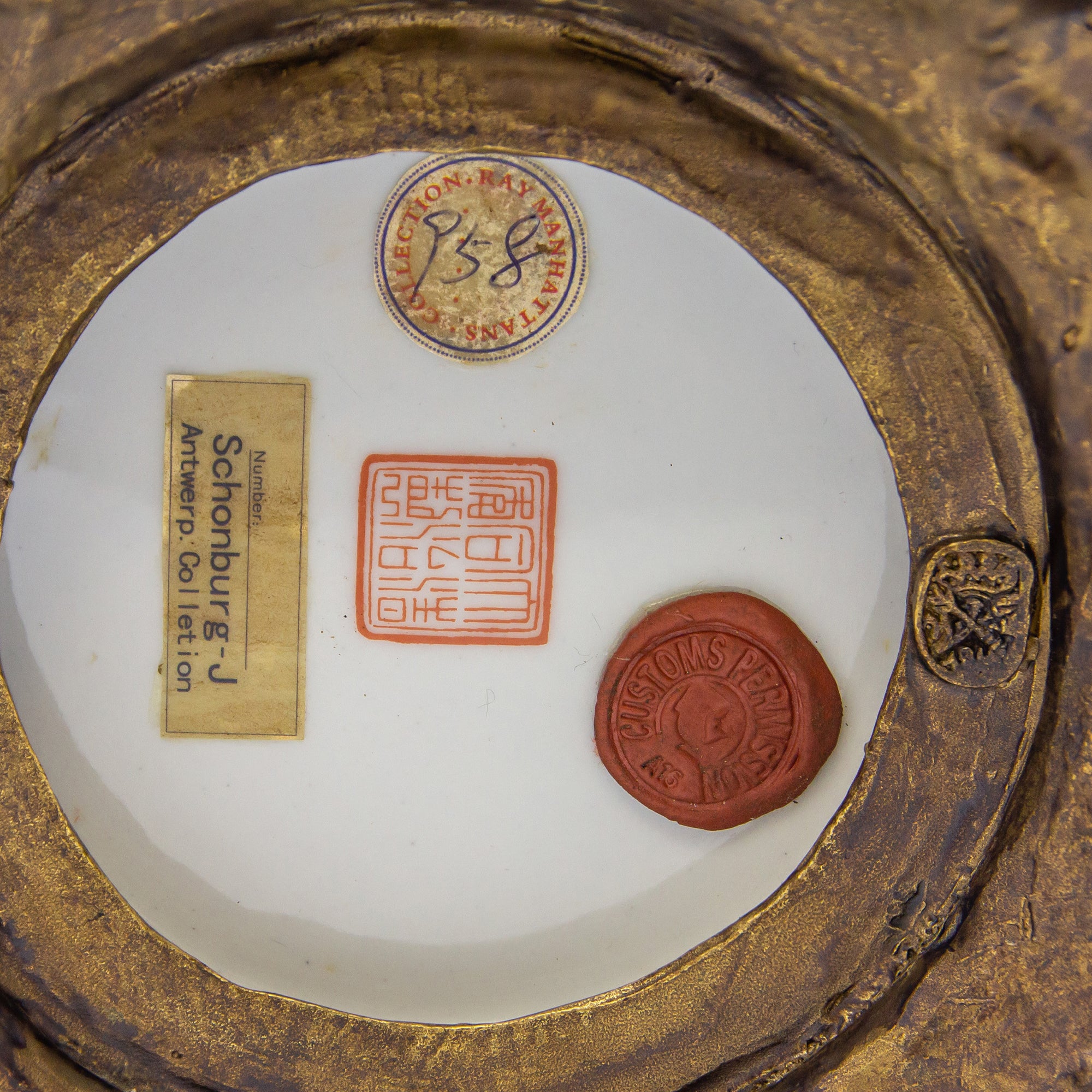 Ce vase chinois polychrome d'une finesse exquise, orné de montures en bronze, a appartenu à deux collections privées. Datant du règne de l'empereur Tongzhi (1856-1875), souverain de la longue dynastie Qing, il connut un règne bref, mourut à l'âge de 18 ans. Décoré d'émaux polychromes aux couleurs éclatantes, il a été ultérieurement rehaussé d'une monture en bronze français de grande qualité. Sur le rebord supérieur en bronze, un phénix ou un faisan, la queue pendante, est sculpté. Le dessous du vase porte plusieurs étiquettes, dont l'une indique son appartenance à la « Collection Schoenberg J. Anvers » et une autre à la « Collection Ray Manhattans ». Un sceau de cire rouge atteste de son authentification avant son exportation de Chine. Cette pièce exceptionnelle de porcelaine chinoise de la dynastie Qing, ornée de montures en bronze, est en superbe état pour son âge.