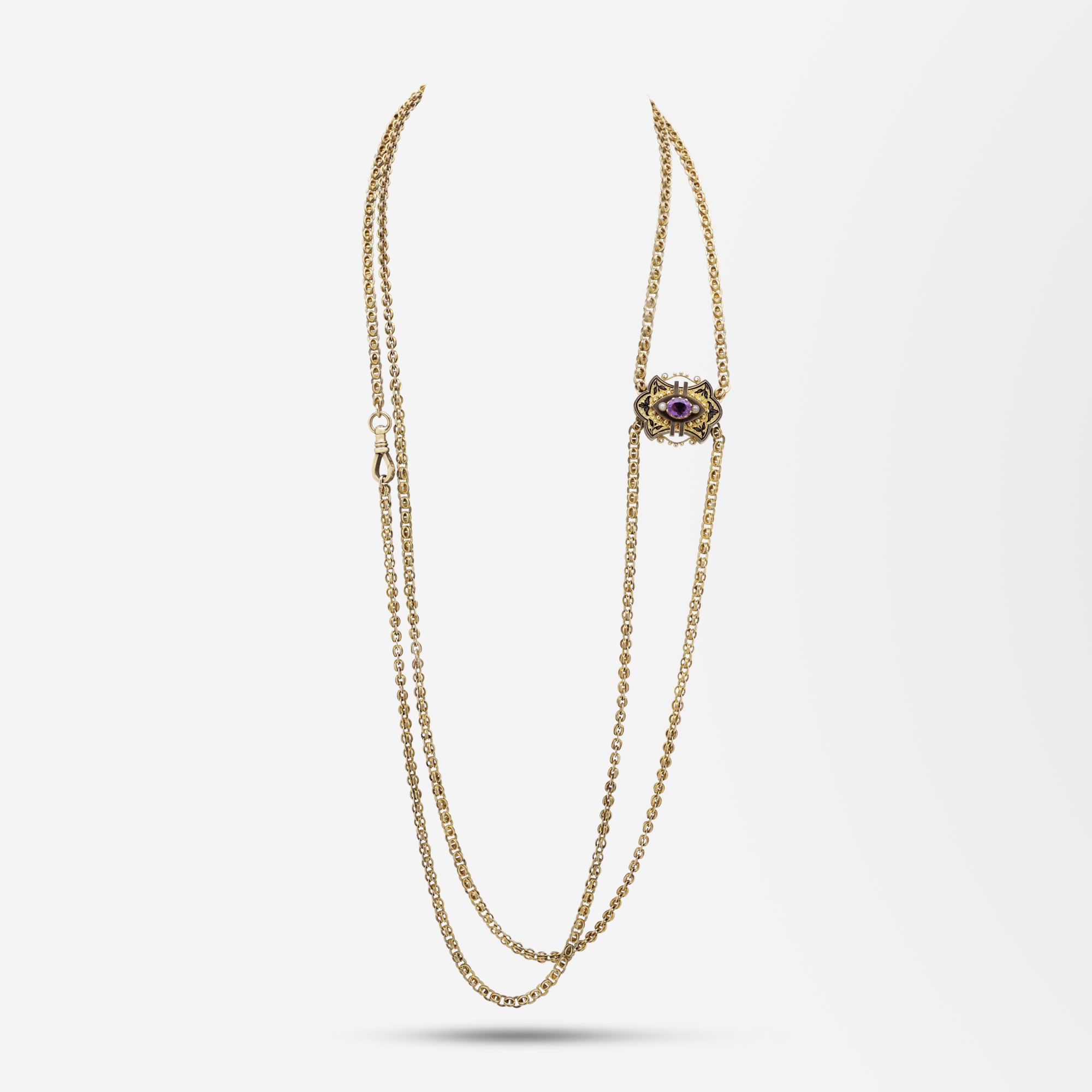 Magnifique chaîne de manchette en or jaune 9 carats, ornée d'un pendentif coulissant fait main. La chaîne à double maille gourmette se termine par un fermoir pivotant en or jaune, fonctionnel et sécurisé. Le pendentif coulissant, réalisé à la main, est en or jaune et rose 9 carats et serti d'une améthyste ovale et de deux perles de culture naturelles, le tout rehaussé d'un fin émail noir. Ce pendentif permet de porter le collier de différentes façons et peut être retiré pour laisser place à une longue chaîne en or. Une chaîne de manchette était autrefois portée autour du cou par une dame, passant dans son manchon d'hiver pour éviter qu'il ne tombe au sol lorsqu'elle lâchait ses mains. Au dos du pendentif, le prénom « Susie » est gravé d'une élégante main. Un bijou victorien anglais d'une qualité exceptionnelle.