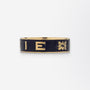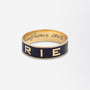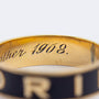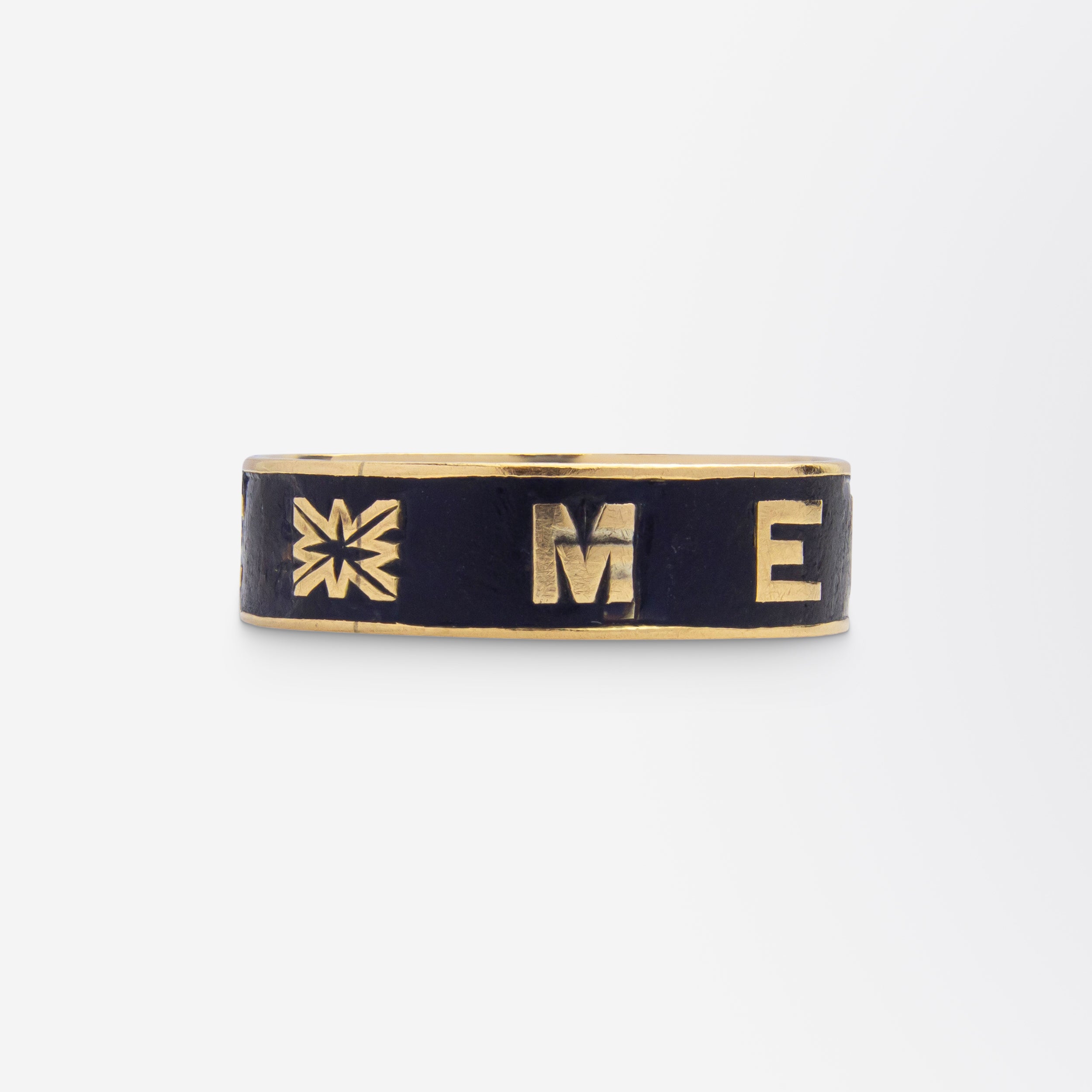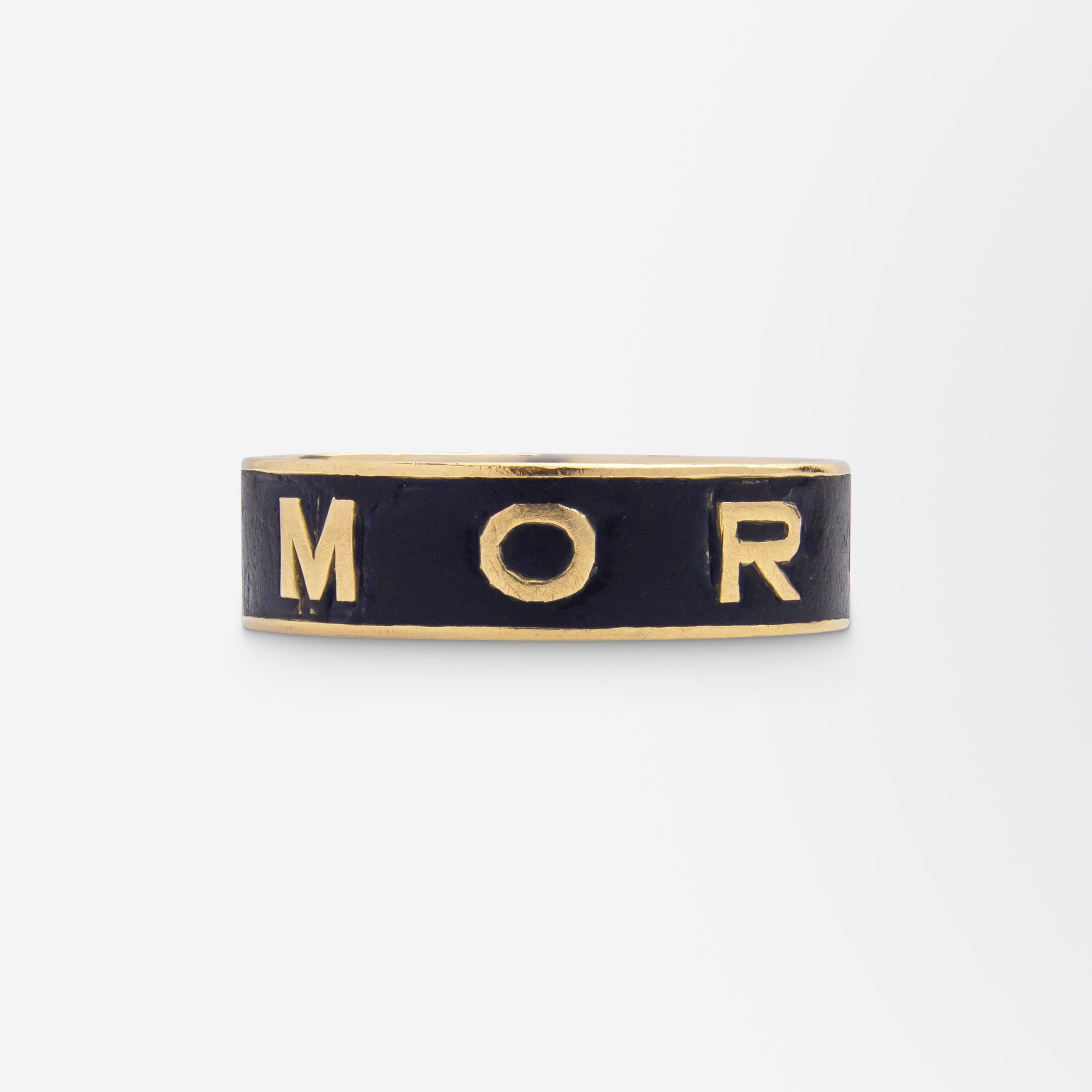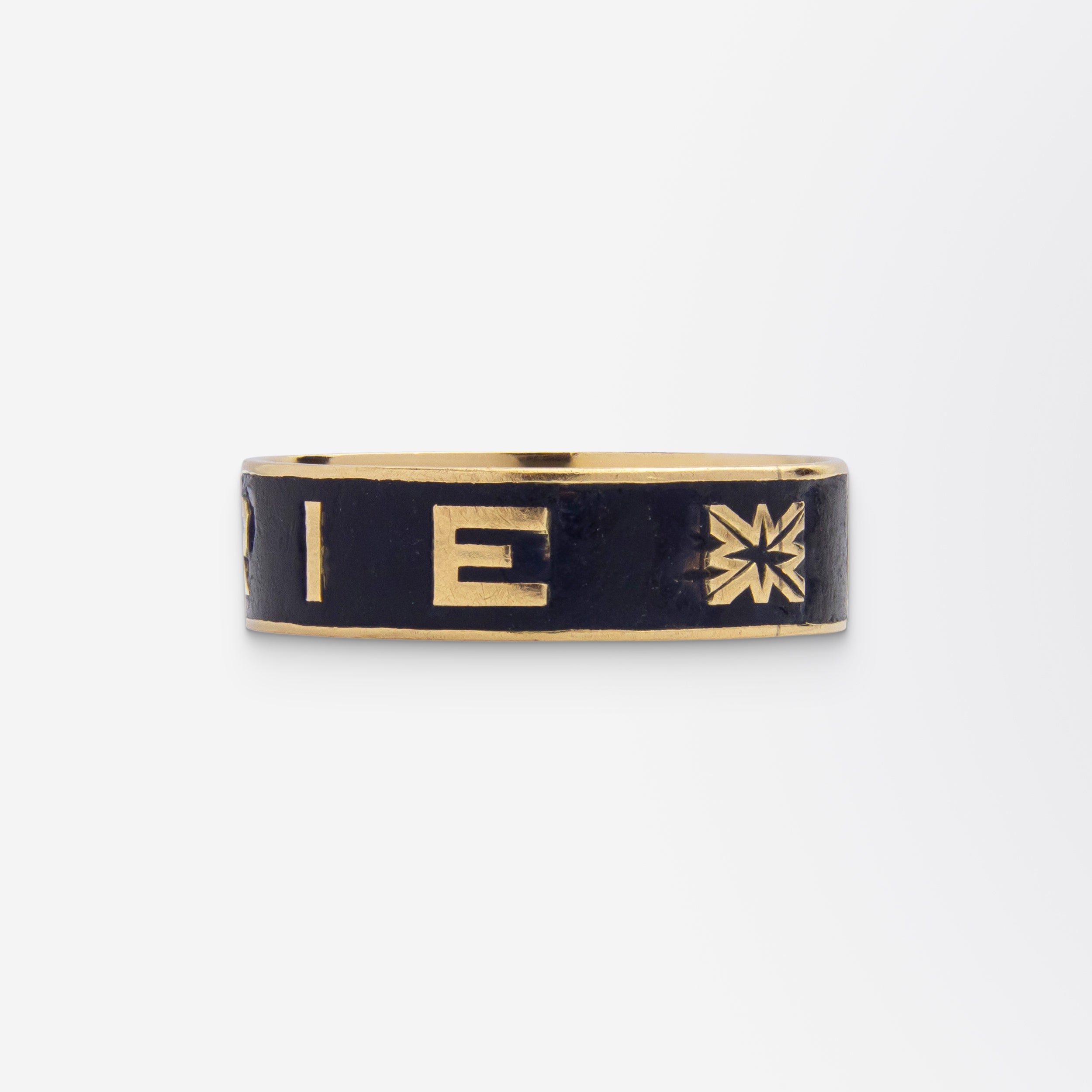Cette ravissante bague en or jaune et émail noir a été conçue comme bague de deuil suite au décès d'un grand-père. D'une largeur de 5 millimètres, elle est ornée d'émail noir sur sa face extérieure et présente de grandes lettres découpées formant le mot « MEMORIE », séparées par un motif géométrique. À l'intérieur, on trouve les inscriptions « Grandfather » et « 1908 », ainsi que des poinçons nets attestant d'une fabrication à Chester, en Angleterre, en 1901. Un poinçon de maître, « WGM », y est également présent, mais nous n'avons pas encore pu l'attribuer à un joaillier précis. L'émail extérieur présente quelques légères traces d'usure, normales pour une pièce de cet âge ; toutefois, nous estimons que la bague est en très bon état. Un magnifique bijou de deuil de l'époque édouardienne, qui complétera à merveille une collection de bagues en or.