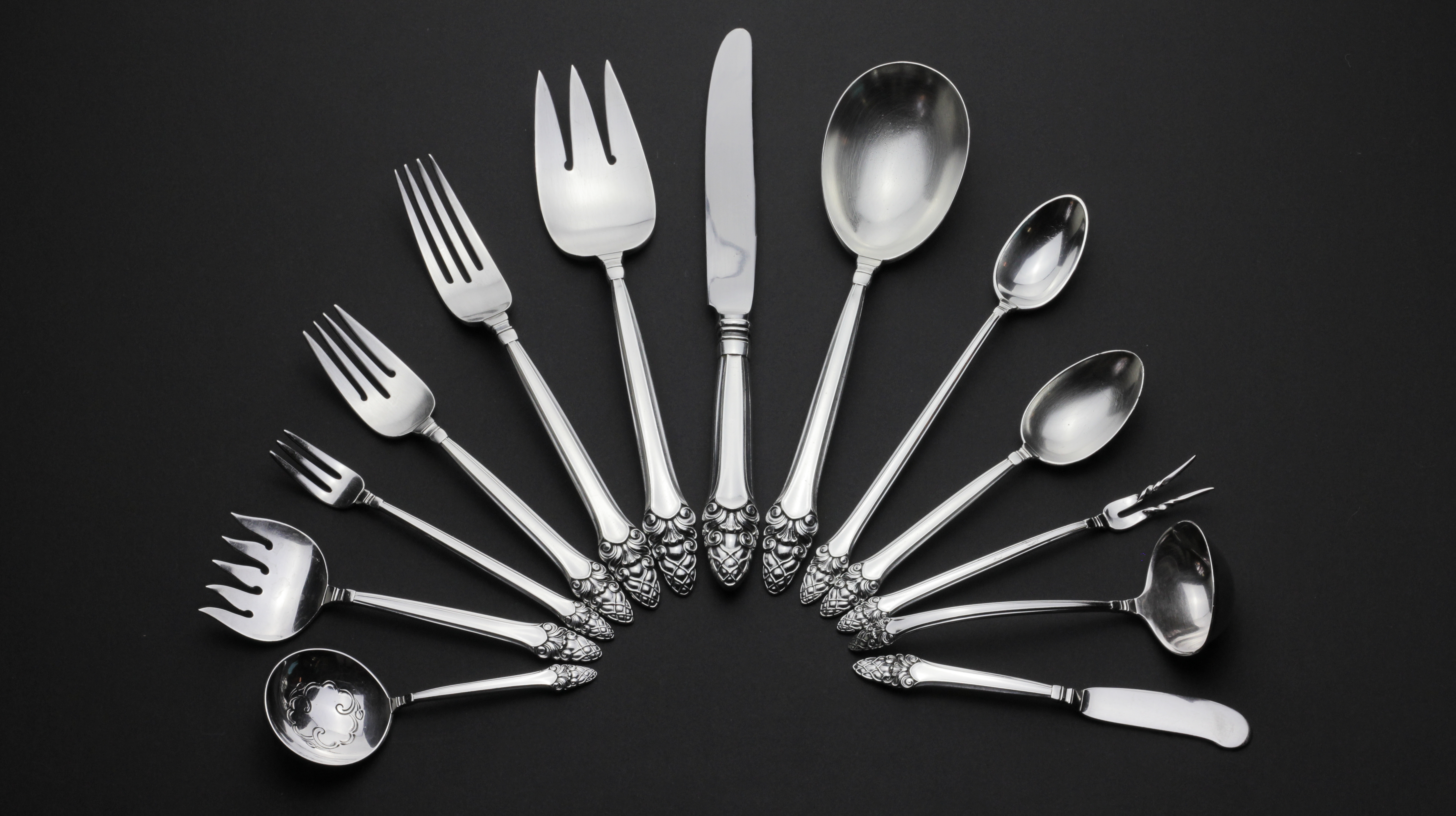 Un ensemble de couverts en argent massif du fabricant américain Gorham, modèle Sovereign Old. Motif datant des années 1940 environ.