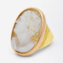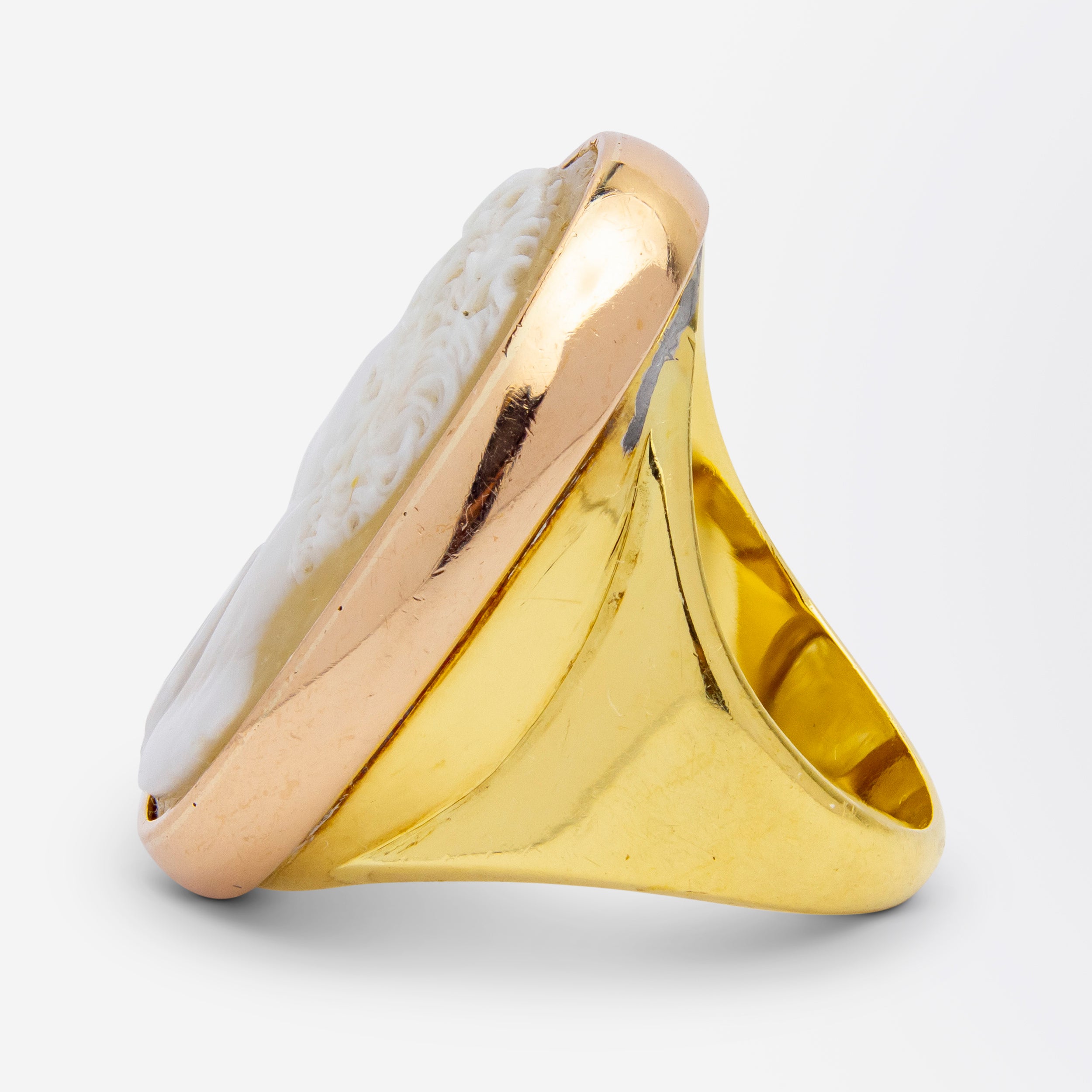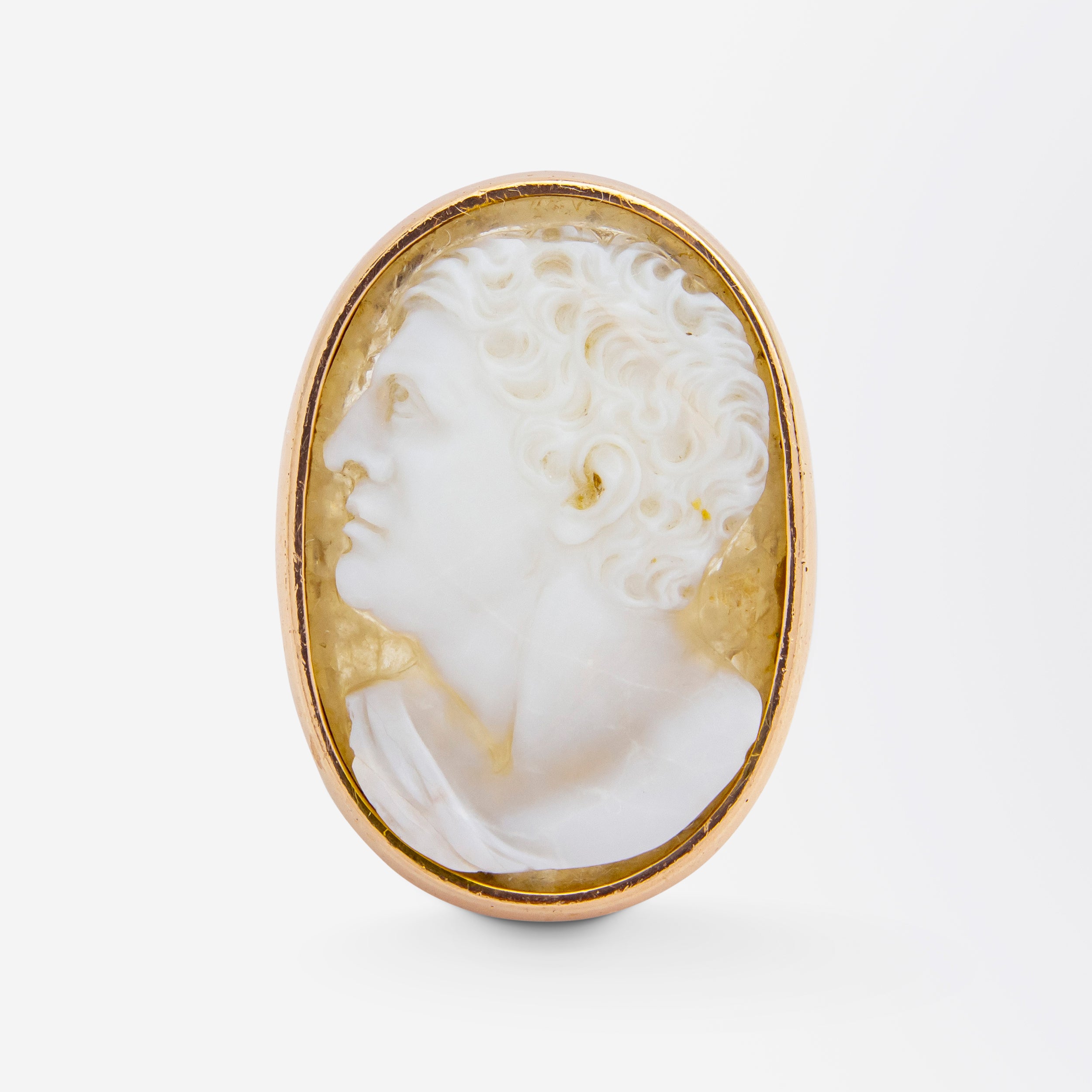 Nous apprécions particulièrement les bagues camées en pierre dure, et celle-ci est peut-être la plus belle que nous ayons eue jusqu'à présent. La monture est en or jaune et rose 18 carats et sertie d'un camée en pierre dure, probablement du XVIIIe ou XIXe siècle. Le camée représente un homme de profil, probablement romain, tourné vers la gauche, mais nous n'avons pas pu l'identifier. Les camées et intailles classiques de profil comme celui-ci représentent souvent des empereurs romains tels que Jules César ou Hadrien, mais il est parfois difficile d'attribuer un profil à une personne en particulier. Il est possible que cette bague ait été à l'origine une petite broche transformée en bague par la suite, mais cela n'enlève rien à sa beauté, car elle est magnifiquement réalisée. On note la présence de craquelures dans la pierre dure, principalement visibles au dos, qui sont très probablement des inclusions naturelles plutôt que des dommages ultérieurs. On observe également de très légères usures sur les parties blanches du profil du camée, normales compte tenu de son âge et de son utilisation. Une bague vraiment ravissante qui ferait sensation auprès d'une dame, ou une belle pièce à arborer pour un gentleman amateur d'antiquités.