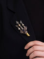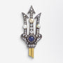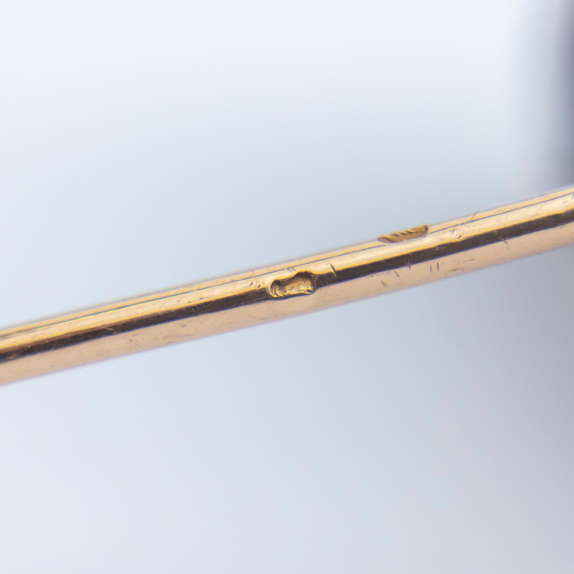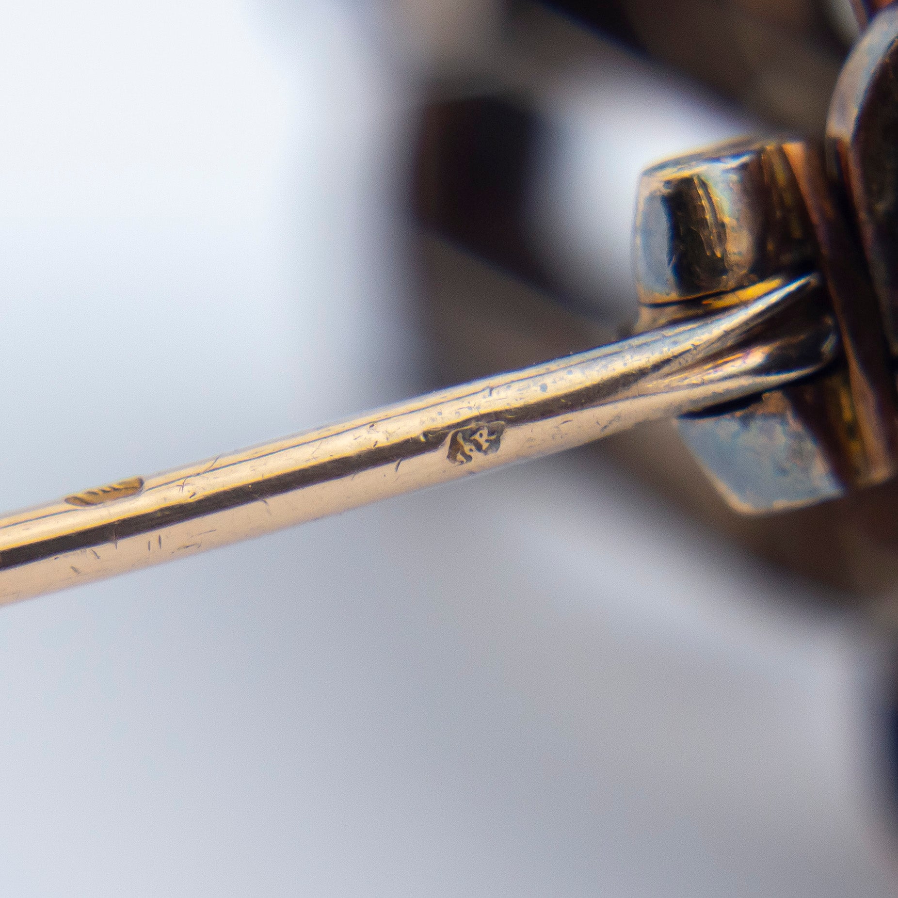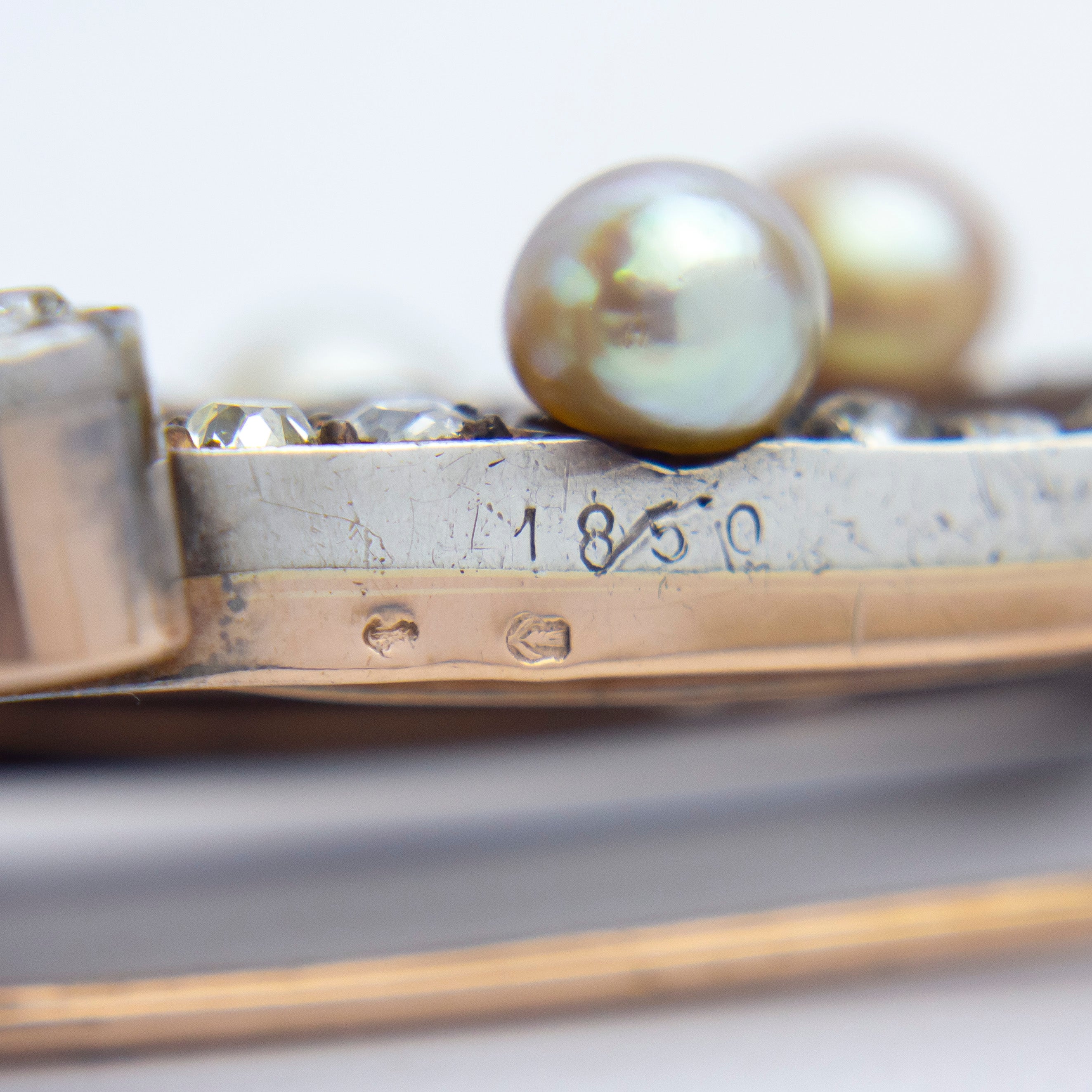 Cette broche exceptionnellement rare date du XIXe siècle et est ornée de diamants, de perles naturelles et d'un saphir bleu. La monture, réalisée à la main en or jaune et rose 14 carats, est plaquée argent aux endroits sertis de diamants. La partie en forme de fourche est sertie d'une multitude de diamants taille ancienne et taille rose, de tailles variées, le plus gros pesant un demi-carat. Chaque diamant présente une couleur allant de H à K et une pureté de SI à P1, pour un poids total de 3,95 carats. Vers le bas de la broche se trouve un saphir bleu taille cabochon, serti par 14 griffes en or jaune et entouré d'un halo de diamants taille rose. Trois perles naturelles, aux nuances légèrement différentes entre crème et abricot, complètent la pièce. À l'arrière, une épingle à charnière en or rose se ferme par un fermoir pliant en forme de « C ». Les deux fermoirs sont en parfait état de fonctionnement et bien sécurisés. Fait intéressant, la broche articulée se dévisse à l'arrière, ce qui indique qu'elle pouvait très probablement être transformée en épingle à cheveux ou même fixée à un écrin plus prestigieux, comme une armature de diadème. La pièce présente de nombreux poinçons au dos, un mélange de marques françaises et tchèques (dans l'actuelle République tchèque), mais nous ignorons dans lequel des deux pays elle a été fabriquée. Cette broche est une véritable pièce de collection, digne d'un connaisseur, et se trouve dans un état de conservation exceptionnel pour un bijou de 150 ans.