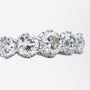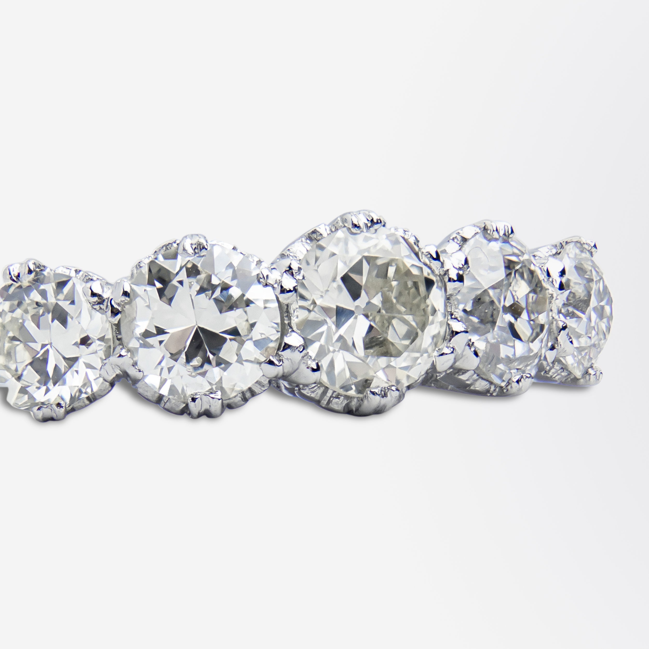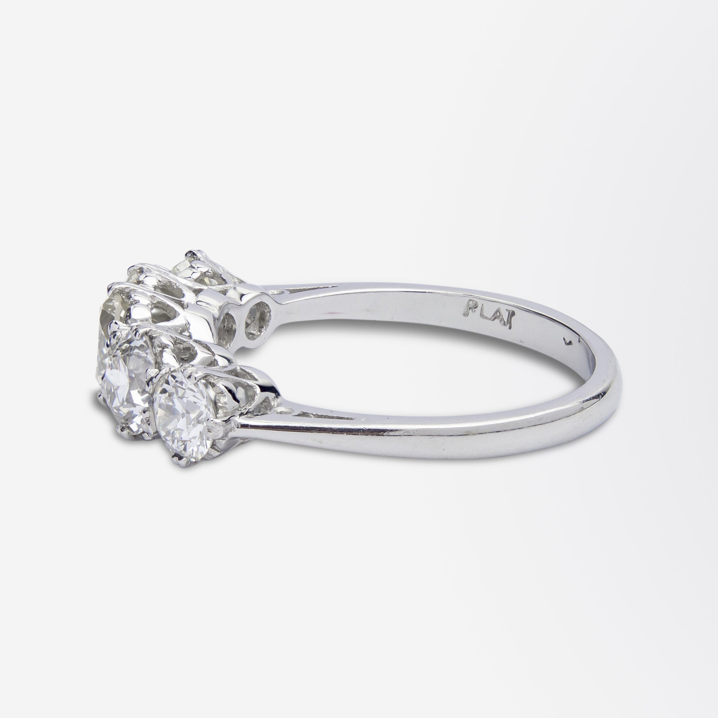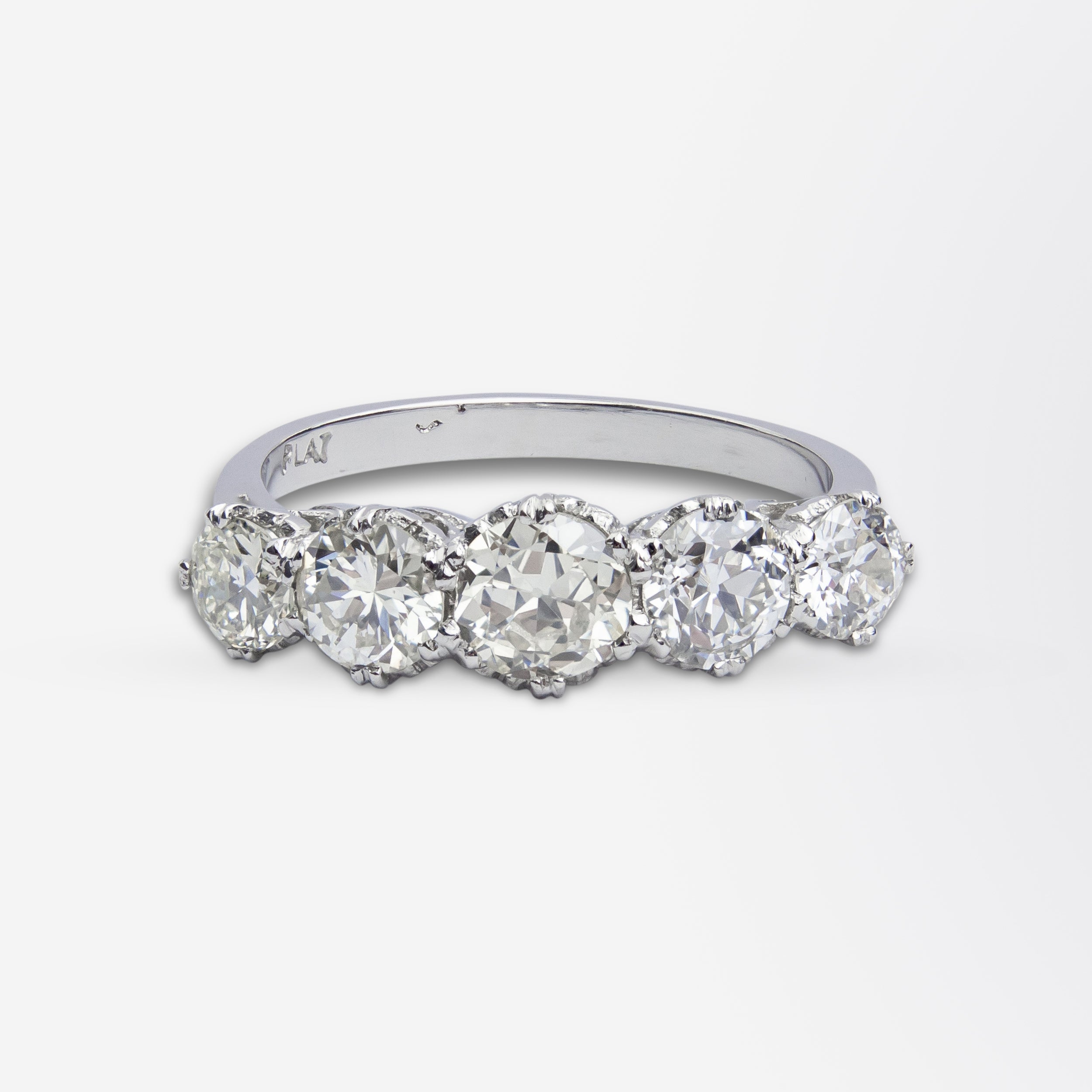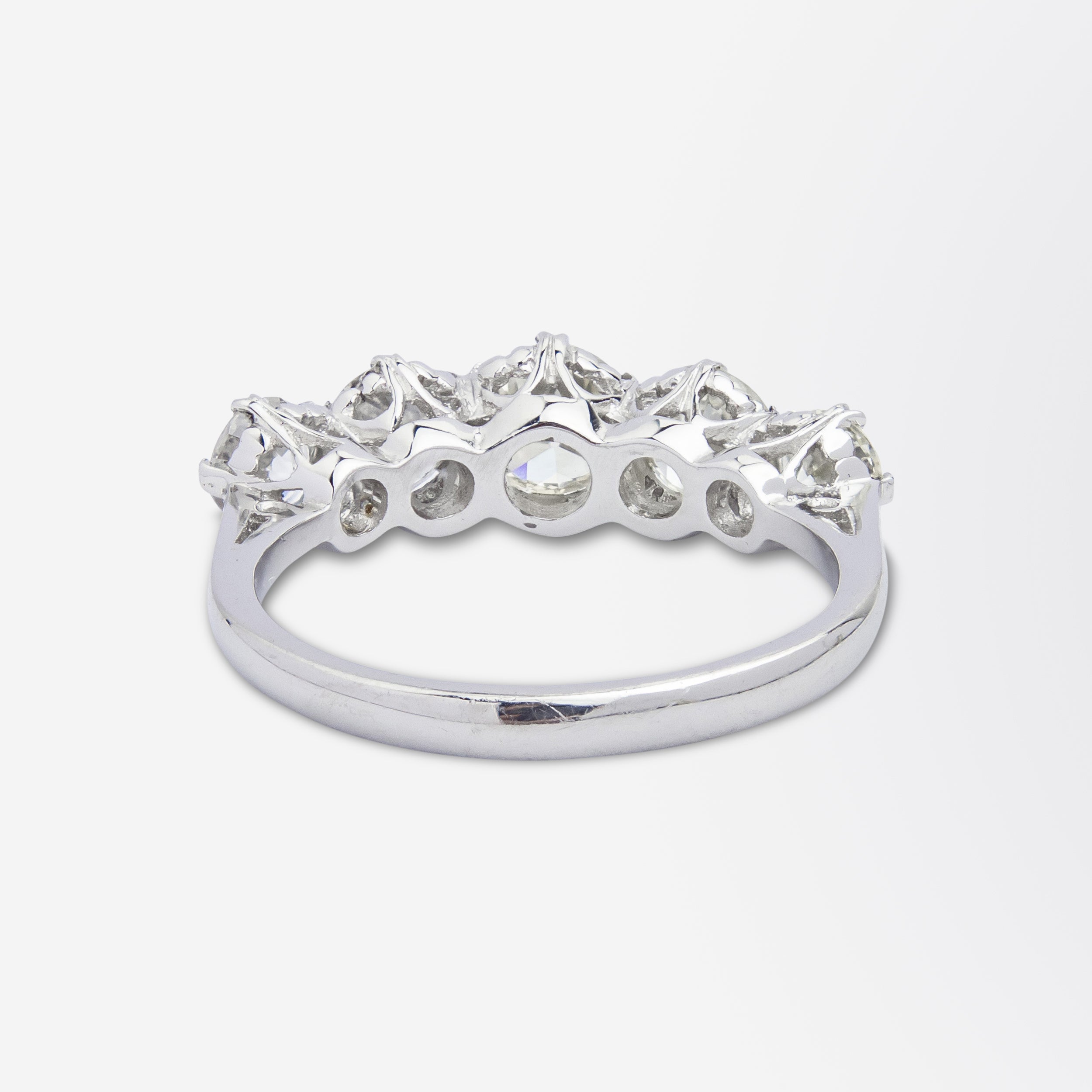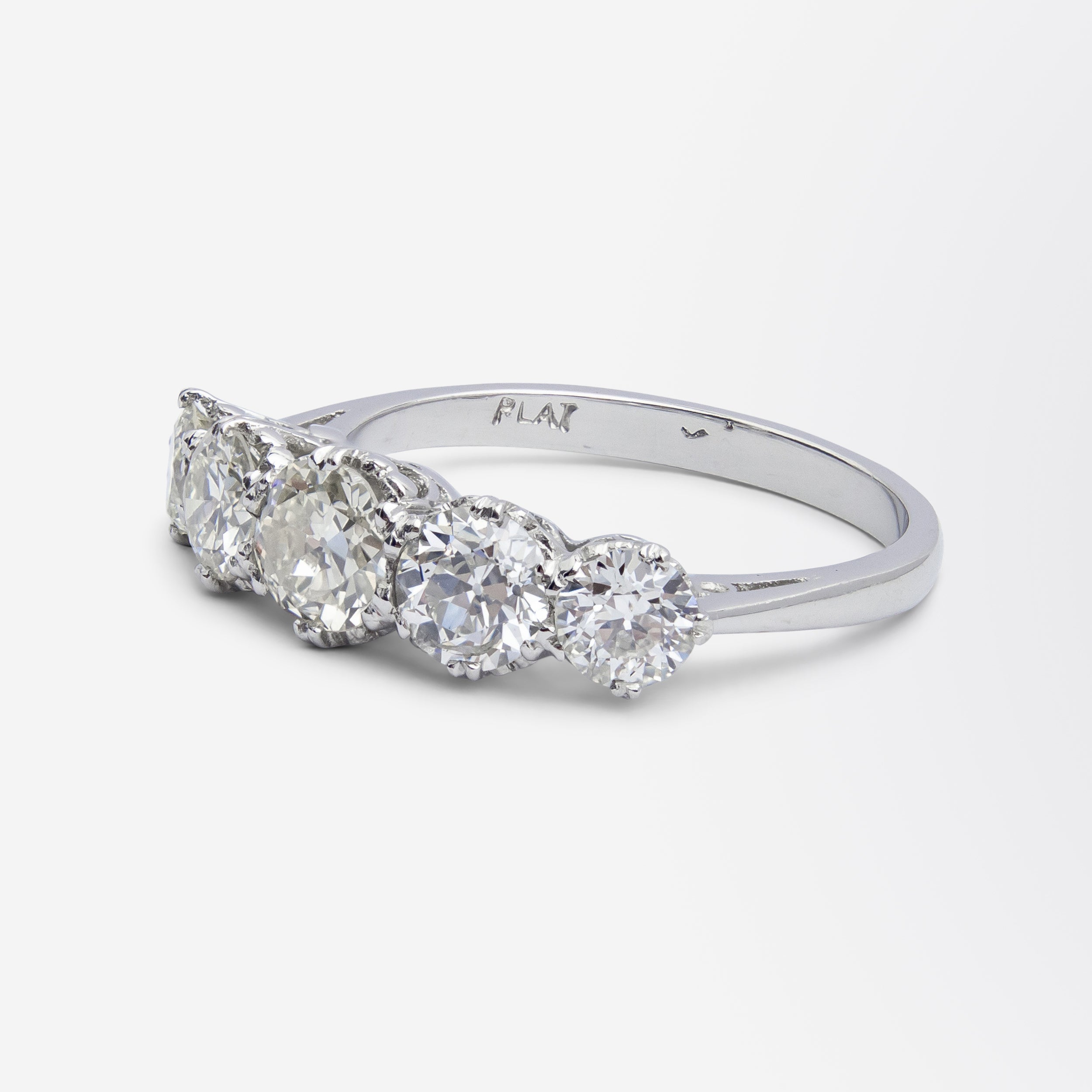 Cette bague, bien que de fabrication relativement moderne, est ornée de diamants taille ancienne et s'inscrit dans un style antique. La monture en platine est sertie de cinq diamants taille ancienne, évoquant le style des bagues « London Bridge ». Les diamants, de couleur G à J et de pureté VS1 à I1, totalisent 2,03 carats. Compte tenu de la variété de couleurs et de puretés, il est probable que les pierres proviennent de différents bijoux anciens et aient été assemblées pour créer cette bague de facture récente. La pièce est en très bon état ; hormis une légère ébréchure sur le rondiste d'une des pierres, elle ne présente aucun autre défaut notable et est prête à être portée au quotidien. Bien que cette bague utilise des diamants anciens, elle pourrait néanmoins être une magnifique bague de fiançailles contemporaine pour une future mariée qui ne souhaite pas forcément un solitaire.