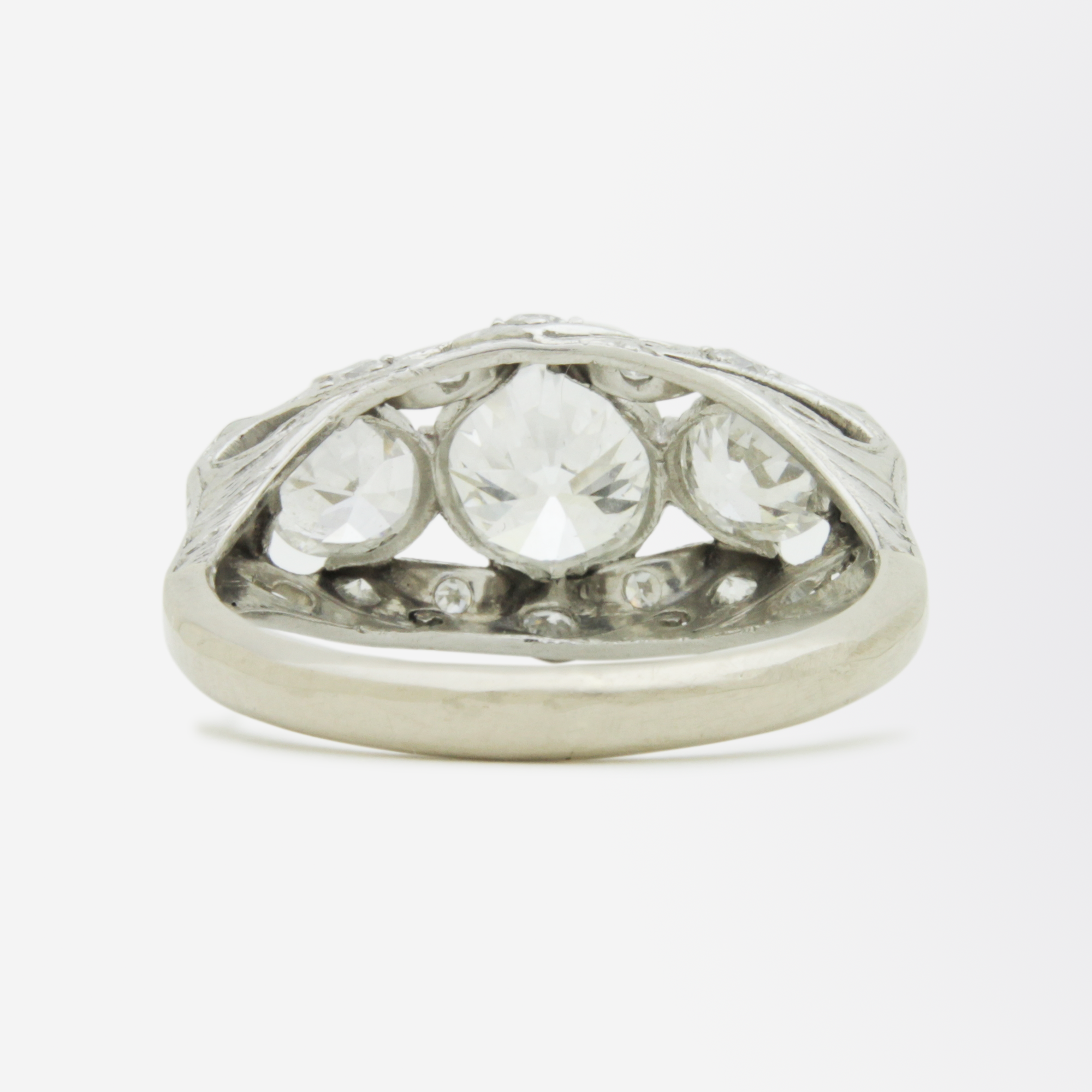 Bague Art Déco exceptionnelle en platine et or blanc sertie de diamants. Cette bague est ornée de diamants de taille ancienne de grande qualité, sertis dans une galerie finement gravée et festonnée. Le diamant central, de couleur G et de pureté VS2, pèse 1,10 carat. Il est flanqué de deux diamants de 0,40 carat chacun, également de couleur G et de pureté VS-SI. Douze autres diamants, de couleur G et de pureté SI, sont sertis dans les épaules et sur les côtés de la galerie. La fabrication de cette bague remonte probablement aux alentours de 1930 et elle est très probablement d'origine continentale. Le dessous de l'anneau a été remplacé à un moment donné, probablement en raison de l'usure du métal. Cependant, la réparation est parfaitement intégrée et correspond à l'âge d'une bague Art Déco de ce style.