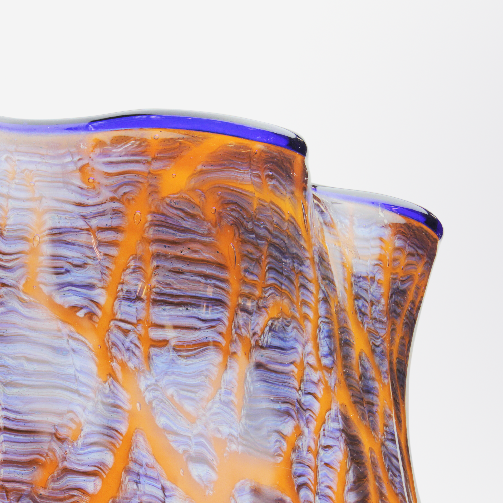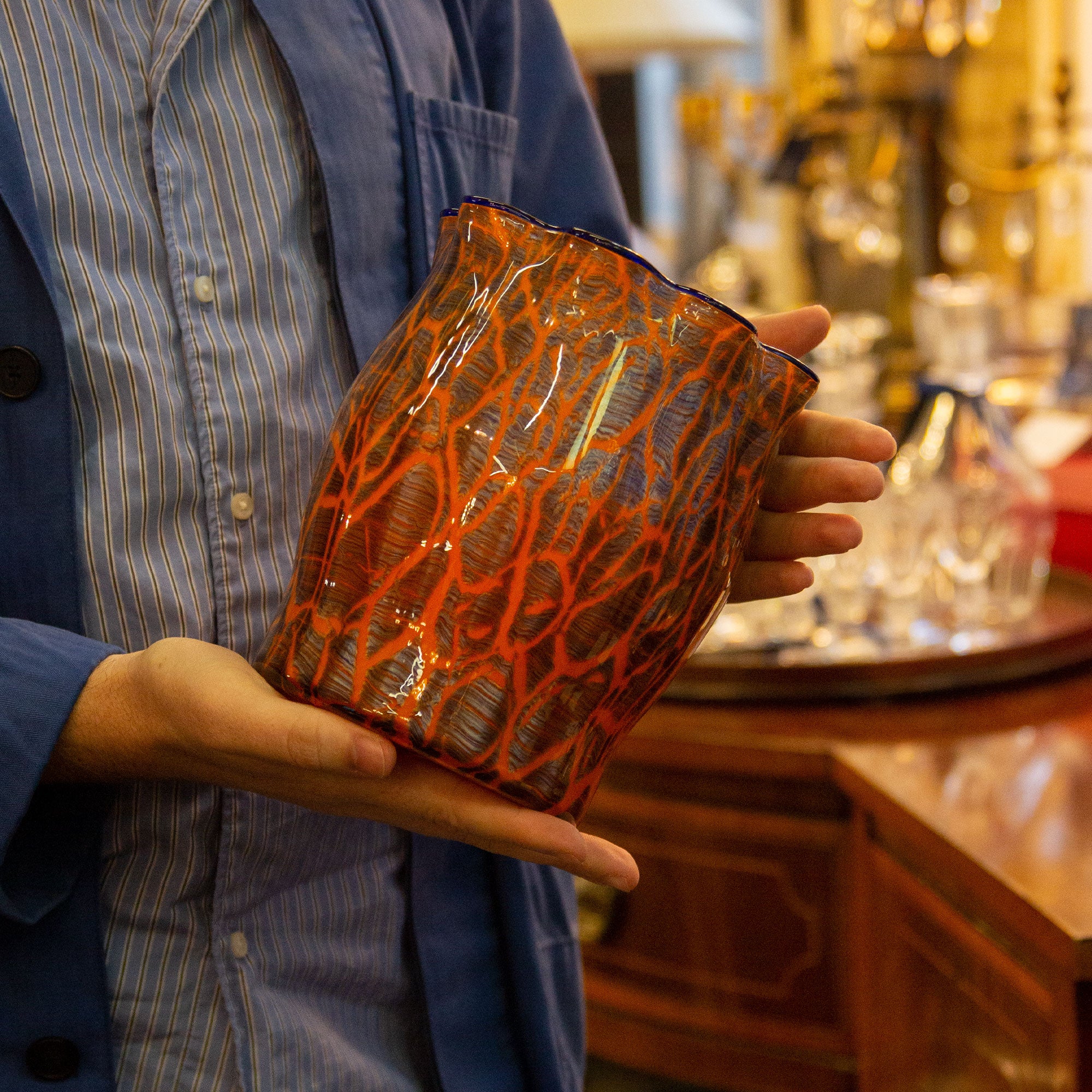 Un vase en verre exceptionnel du fabricant bohémien Loetz. Ce vase orange présente une fine couche de verre bleu acier, dite « ausführung 134 », à l'effet craquelé. Le col est orné d'une bordure festonnée et rehaussé de bleu. Le fond du vase porte une marque de pontil cassée, indiquant qu'il a été soufflé à la main. Ce vase, datant de la période 1911-1935, est l'une des pièces les plus originales produites par Loetz.