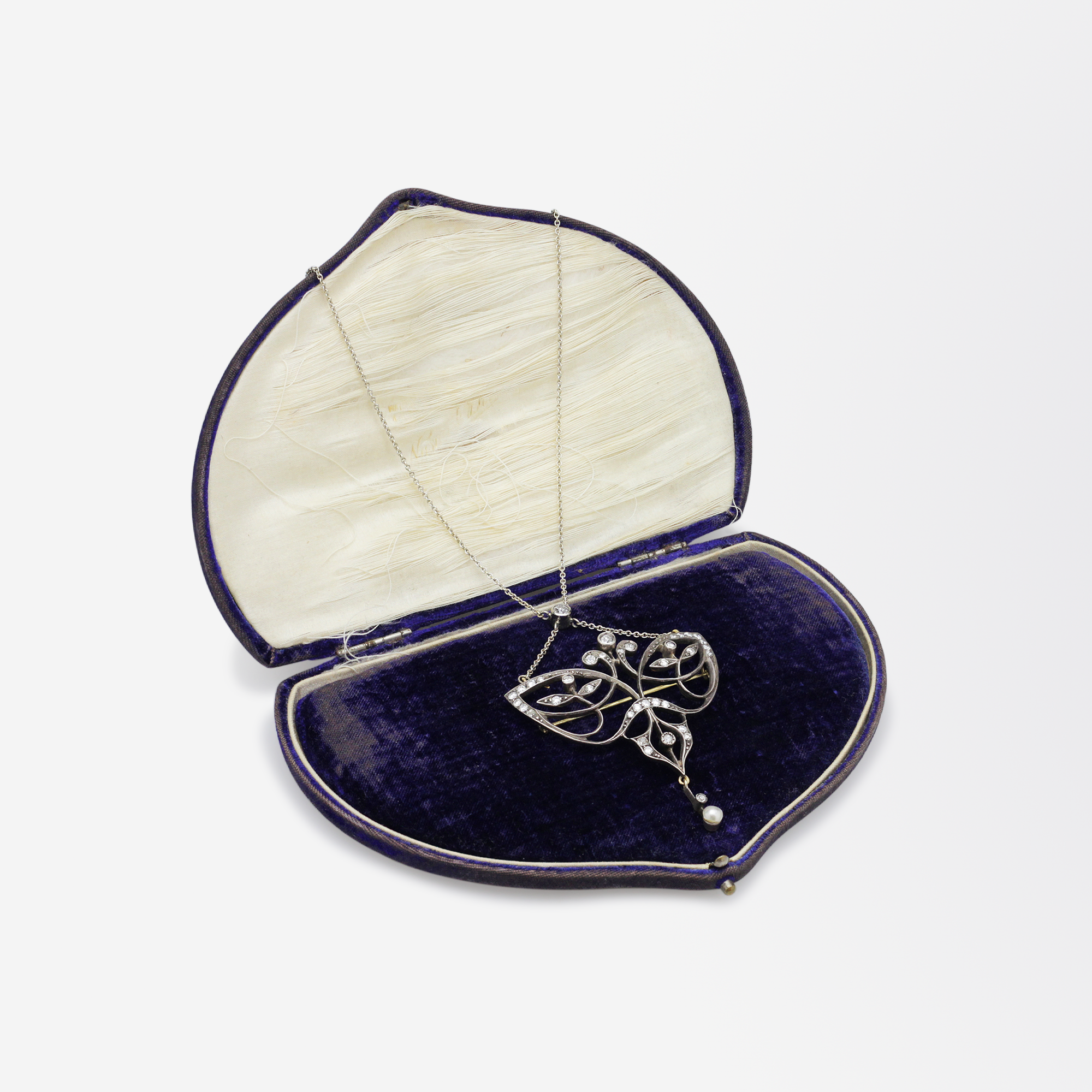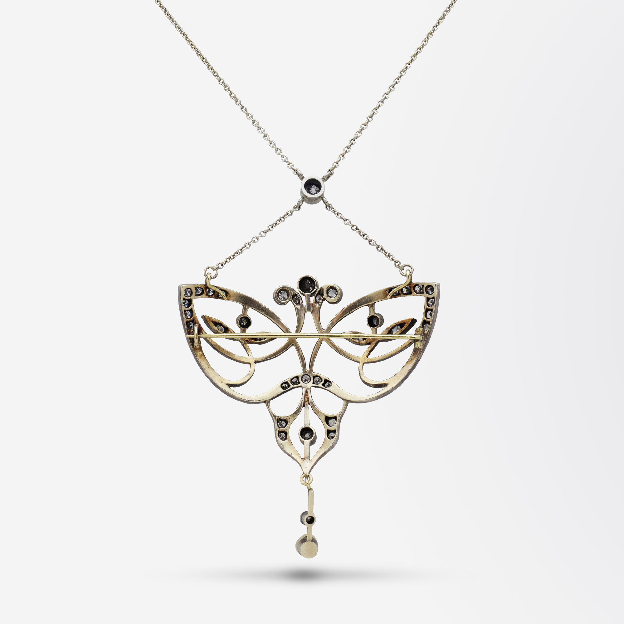 Un pendentif broche exceptionnel de style Art nouveau, présenté dans son écrin de velours d'origine. Le pendentif central est en or jaune 18 carats plaqué argent et serti de brillants diamants taille ancienne. Une goutte articulée orne le pendentif, rehaussée d'une perle de culture naturelle et d'un diamant taille ancienne. Les diamants, de couleur H et de pureté SI-P2, totalisent environ 2,00 carats. Bien que le pendentif broche amovible ne porte pas de poinçon, l'écrin et l'esthétique de la pièce suggèrent une origine française, vers 1910. La chaîne du collier est probablement un remplacement, l'originale s'étant vraisemblablement cassée. Un bijou Art nouveau absolument incroyable et polyvalent, qui incarne à merveille la beauté de cette époque.