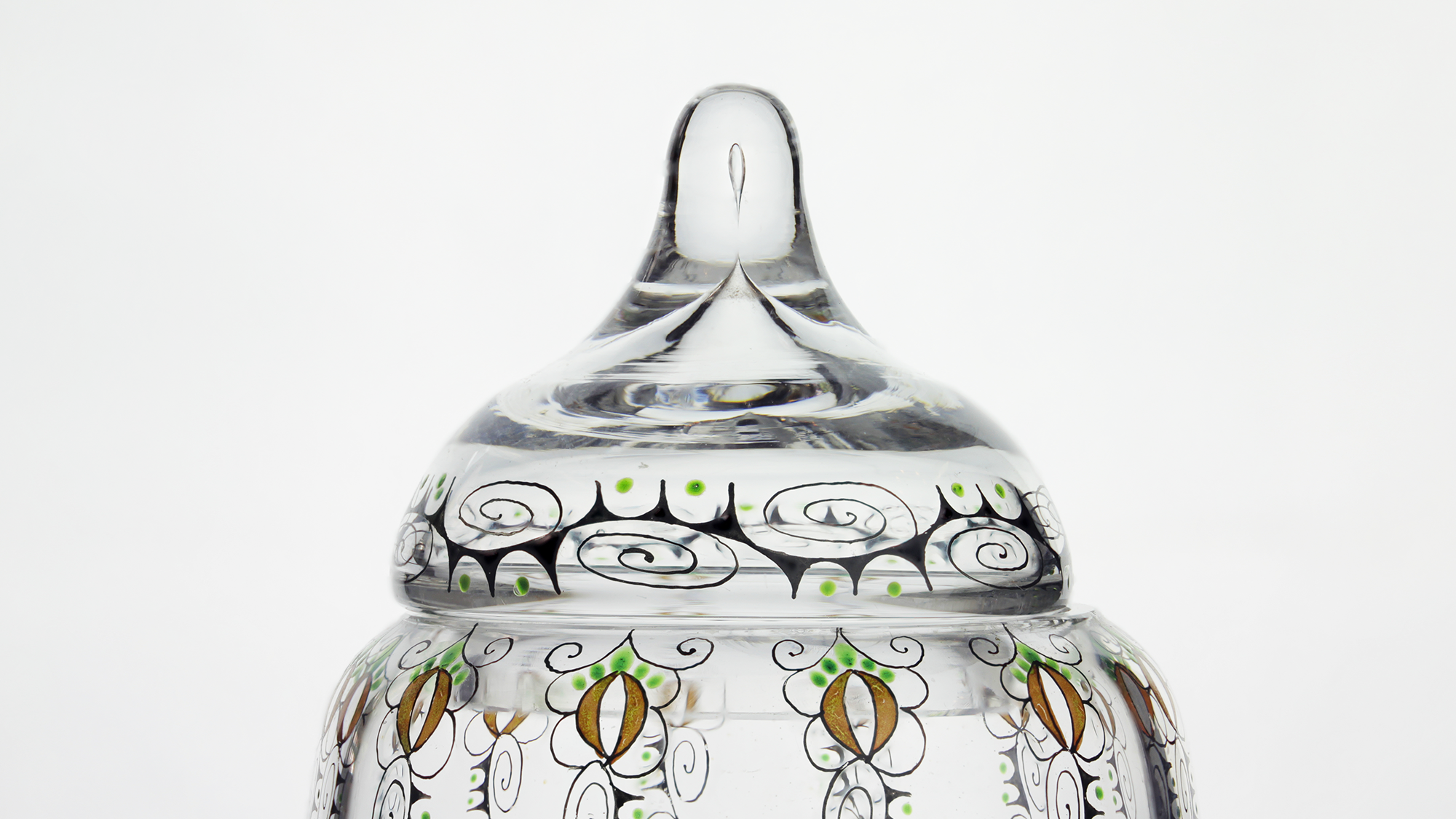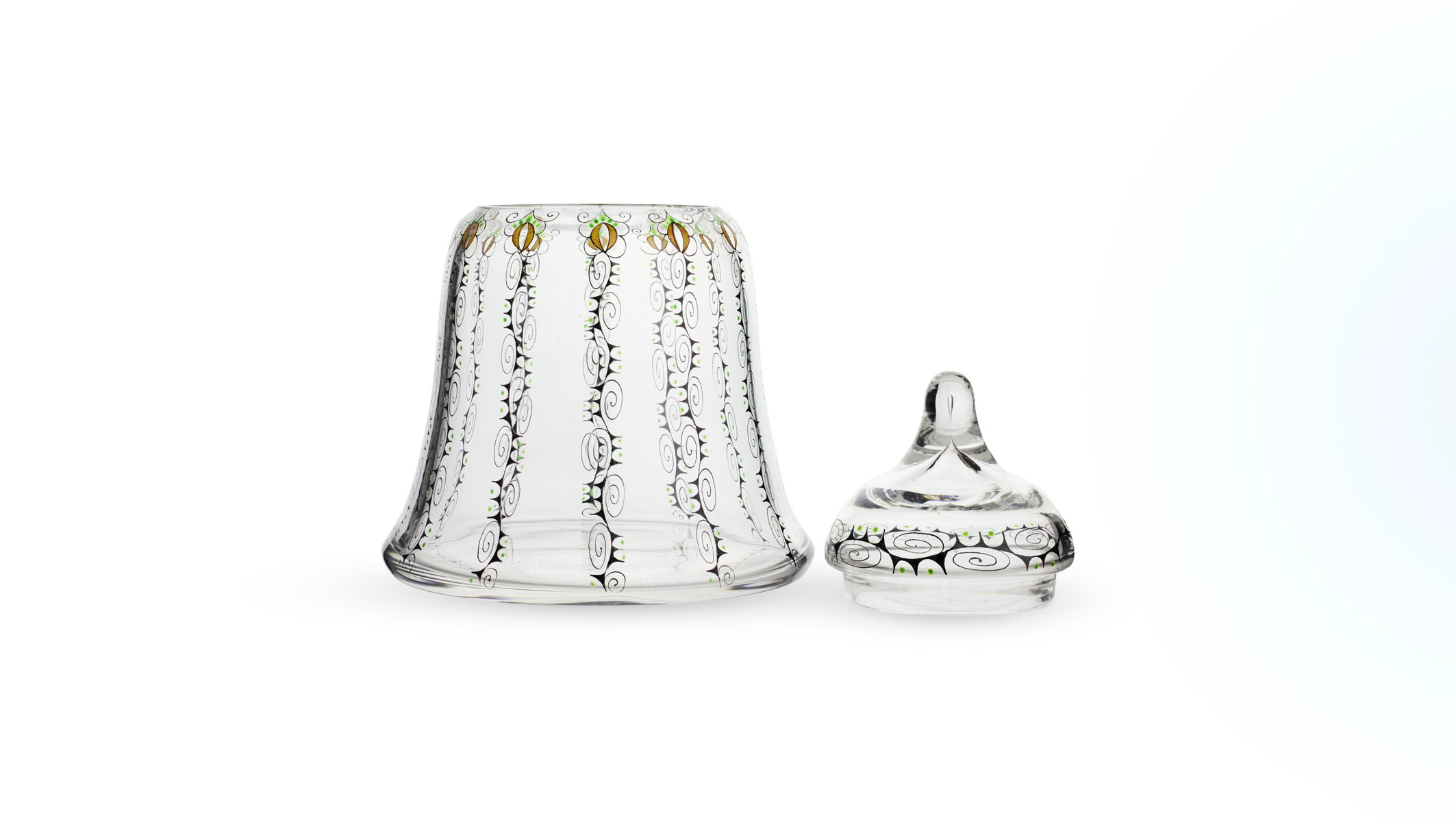 Bonbonnière en verre autrichienne de style Sécession, ornée de délicats détails en émail noir, brun et vert, vers 1915.