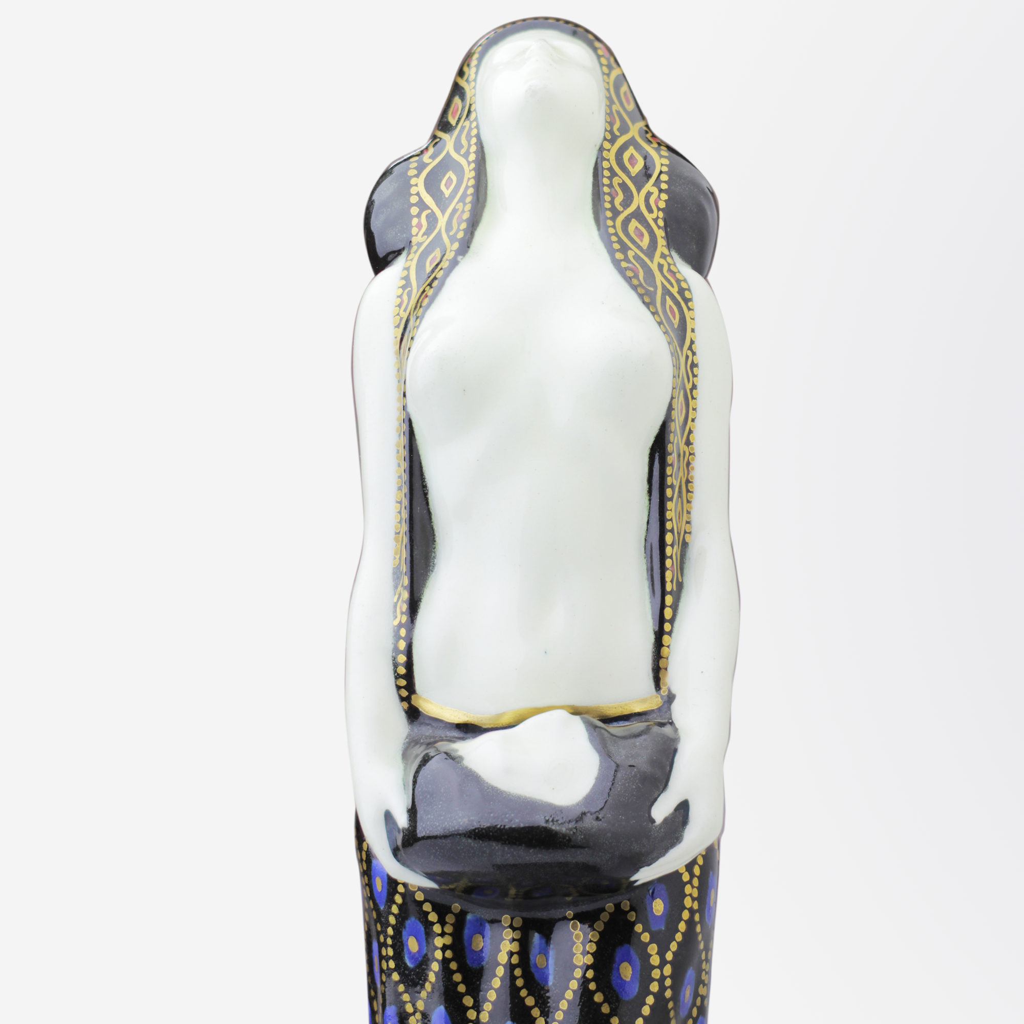Une statuette très rare et importante de Salomé tenant la tête de Jean-Baptiste, réalisée en Autriche. Œuvre de Karl Klaus (1889-1925), elle fut confectionnée par le maître verrier Ernst Wahliss vers 1911. La statuette représente Salomé, fille d'Hérode II et d'Heordius, debout, la nuque inclinée, tenant entre ses mains la tête tranchée de Jean-Baptiste. Richement décorée dans une palette sobre de noir, blanc, bleu indigo, rouge et or, la statuette témoigne indéniablement du goût Sécession. Élève de Josef Hofmann, Klaus créa plusieurs statuettes et objets décoratifs pour Ernst Wahliss sous le nom de « Serapis Wahliss ». La statuette porte à l'intérieur la marque « Serapis Wahliss », ainsi que des marques d'enregistrement et une signature frottée sur émail.