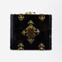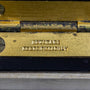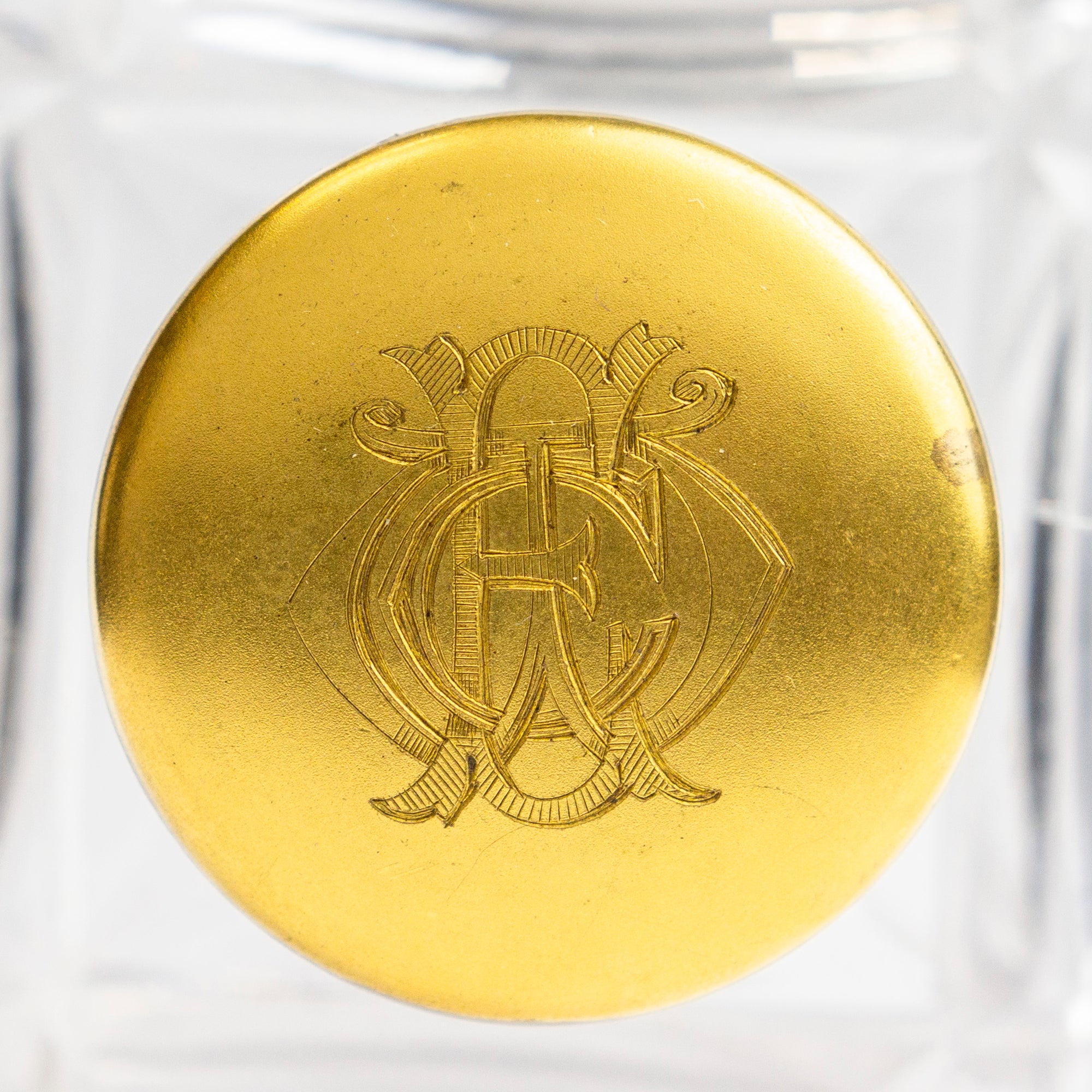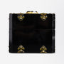 Un coffret à parfum laqué noir de Leuchers of London, orné de ferrures en laiton et d'une pièce centrale en agate rubanée. L'intérieur, doublé d'un somptueux velours violet, renferme quatre flacons de parfum en cristal taillé, coiffés de bouchons en verre et munis de couvercles en laiton. Les couvercles en laiton sont monogrammés « ETC » et ornés d'un écusson en forme d'œil.