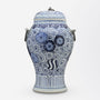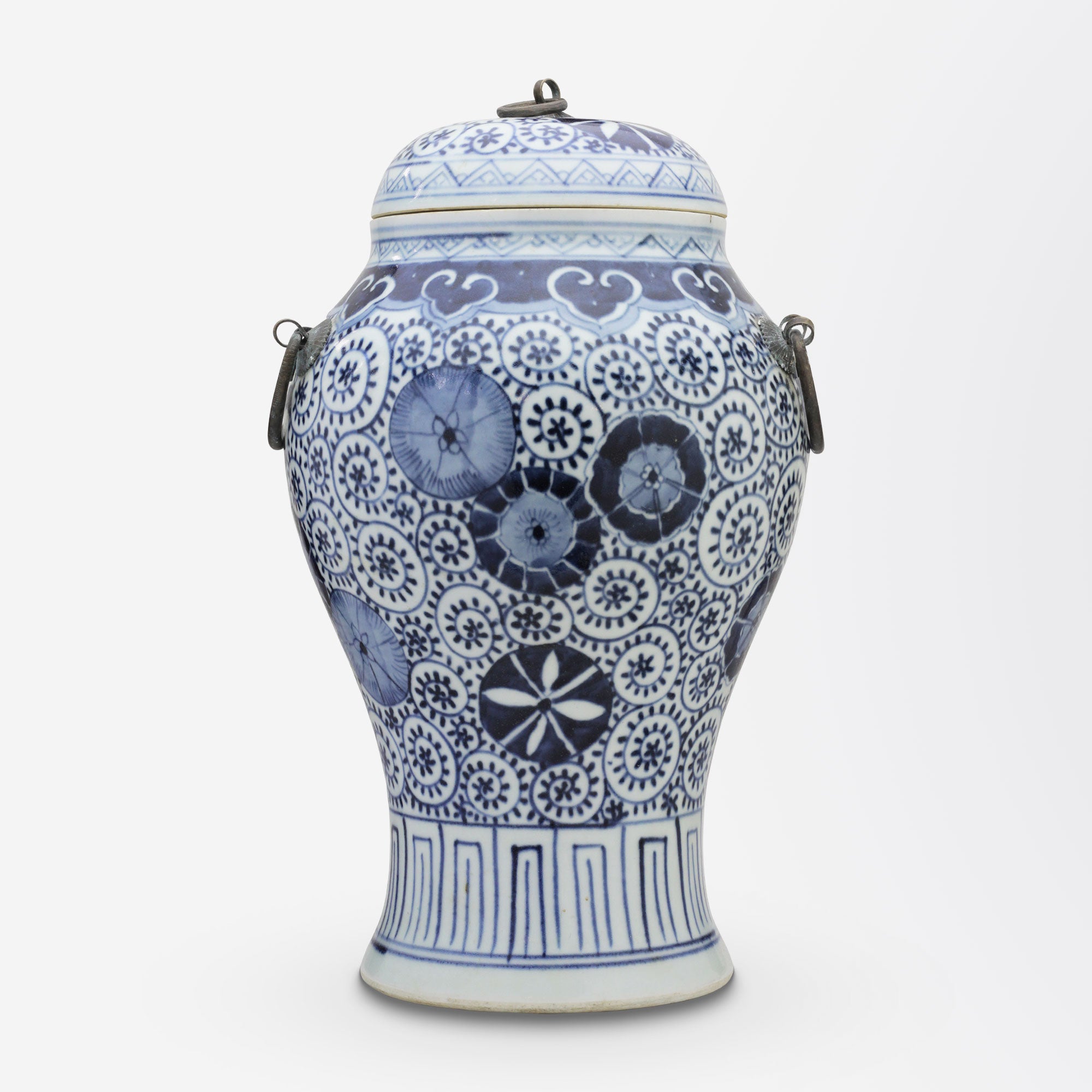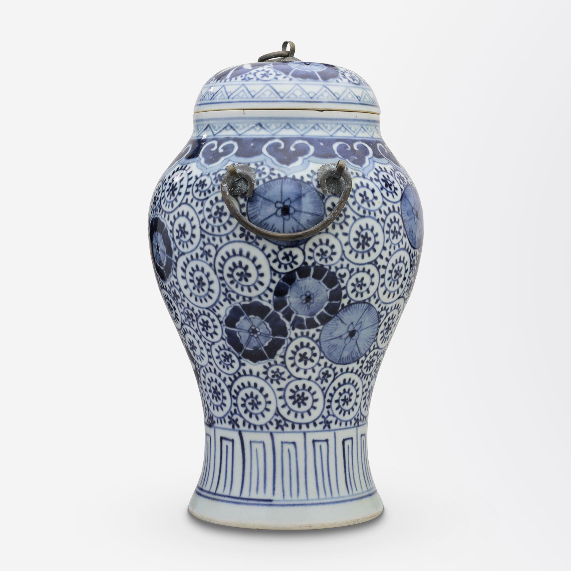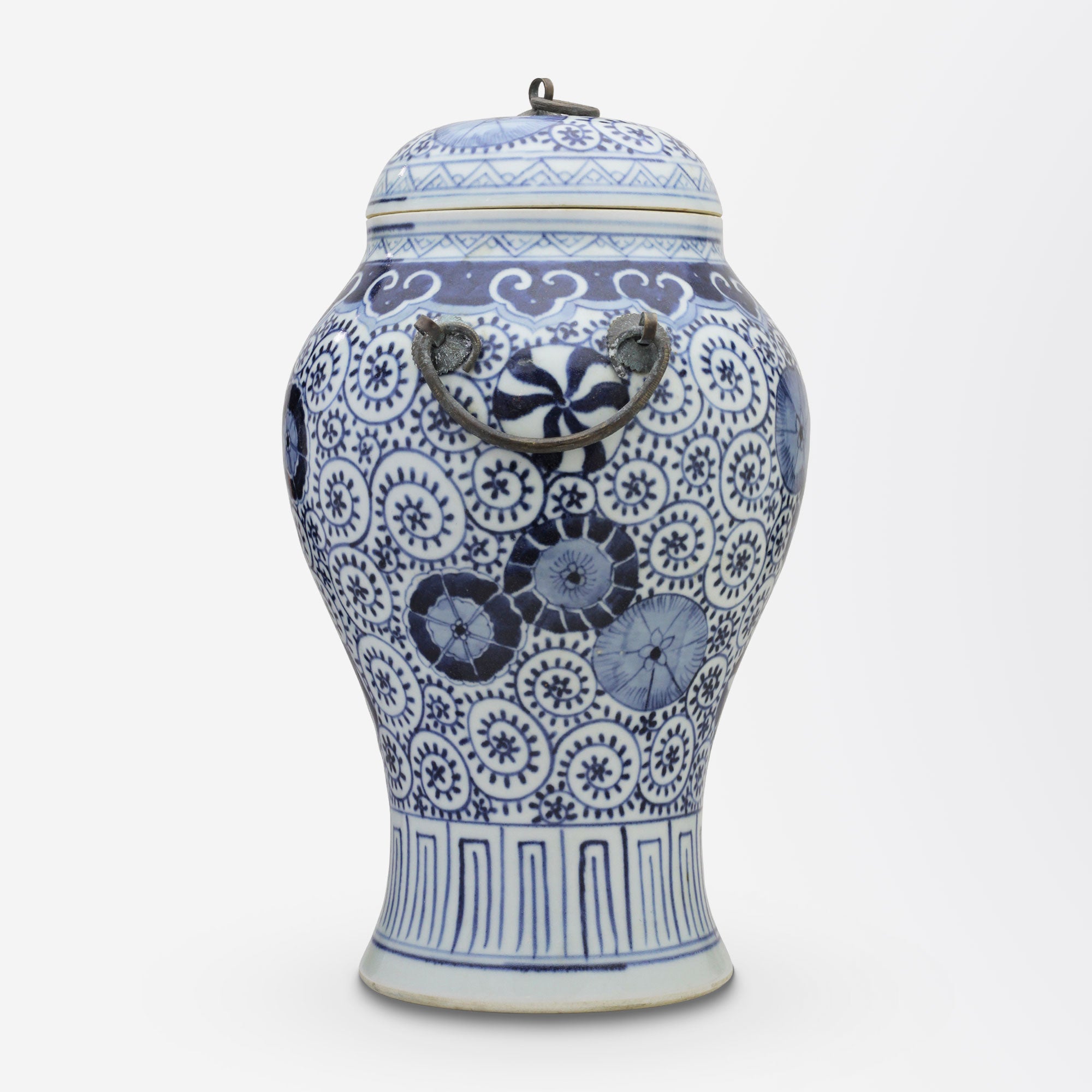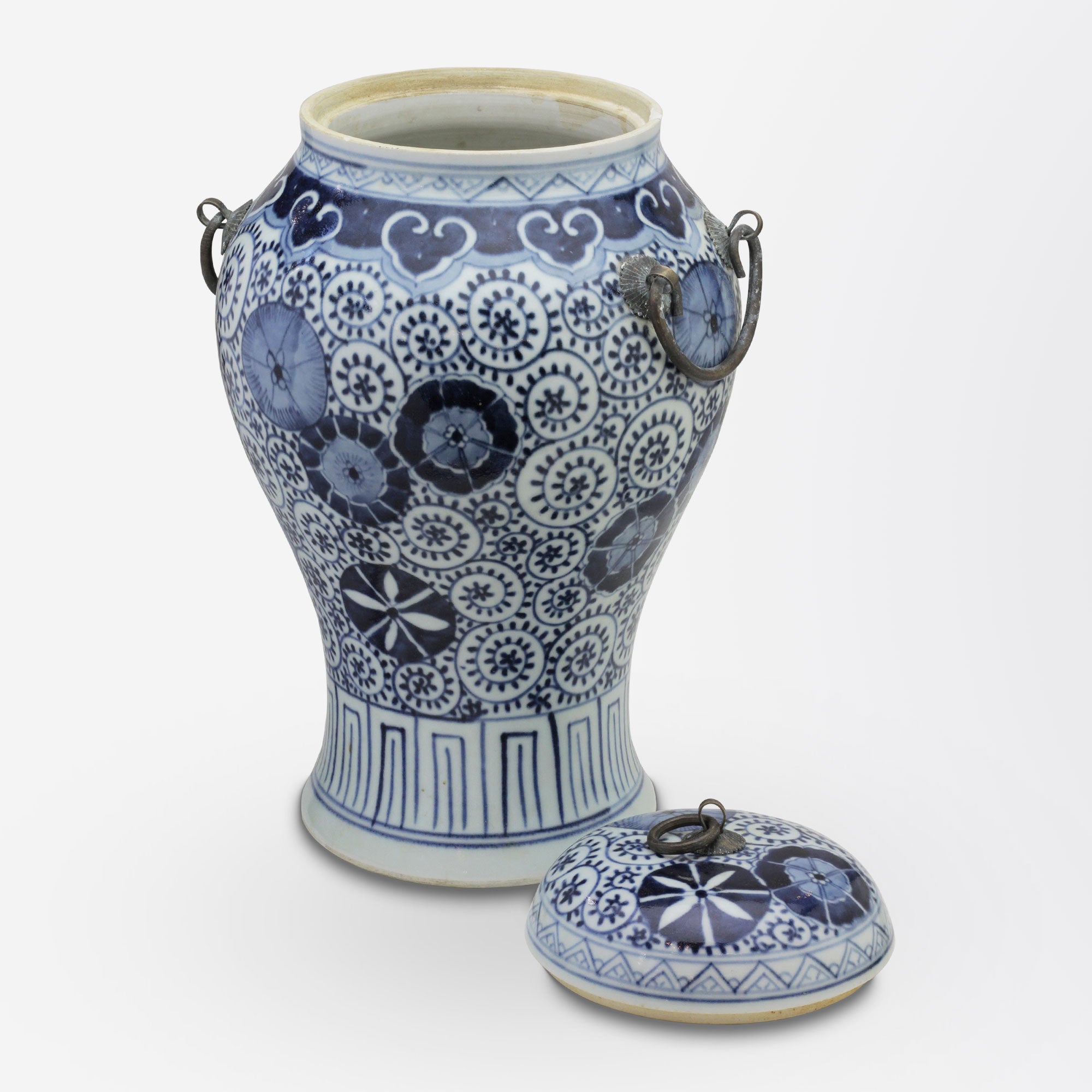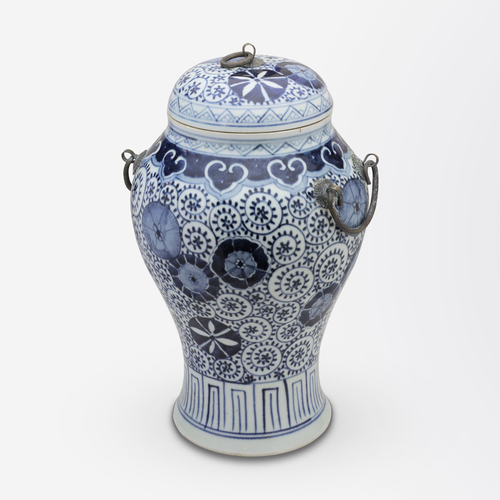 Un récipient chinois bleu et blanc à couvercle, probablement destiné au marché sud-asiatique.