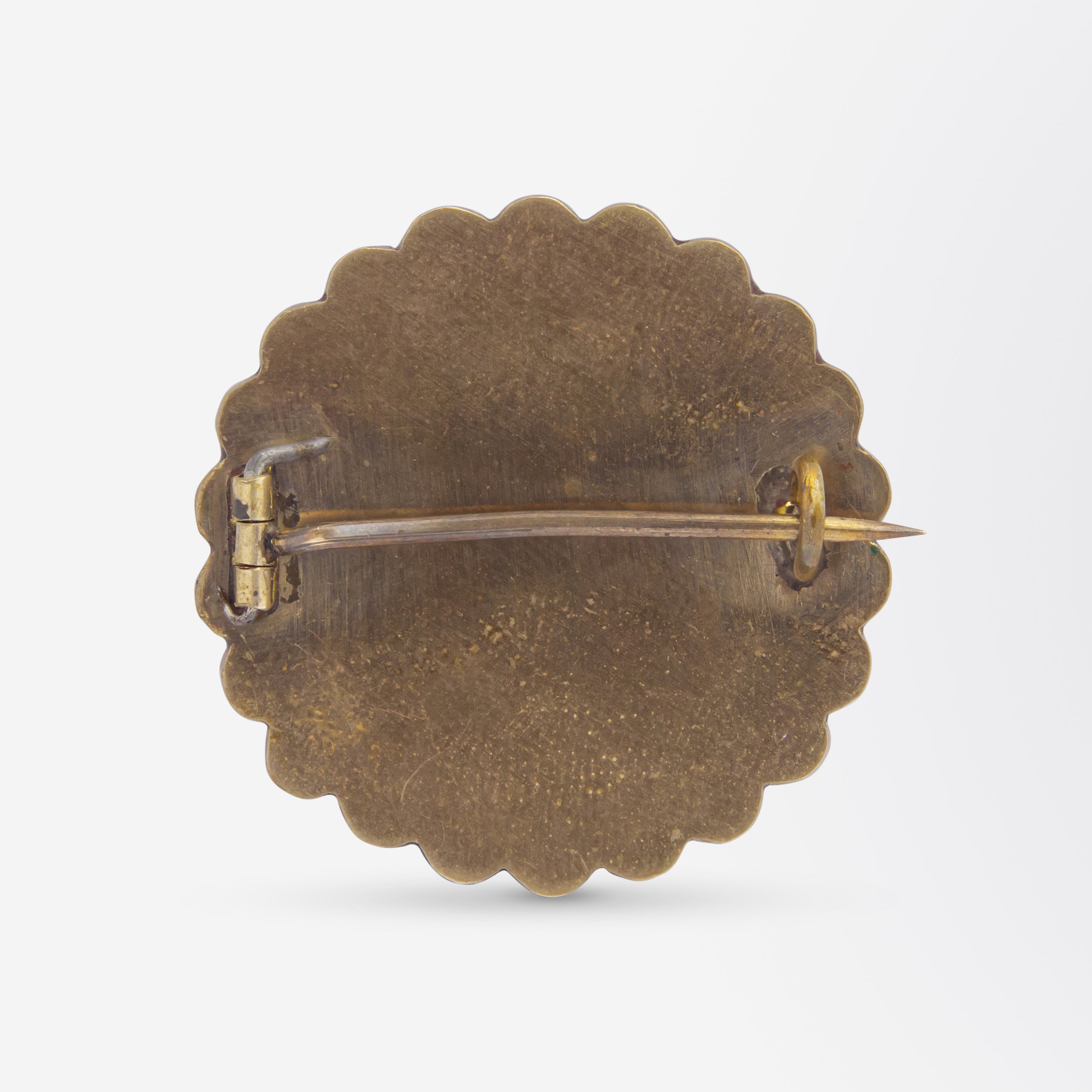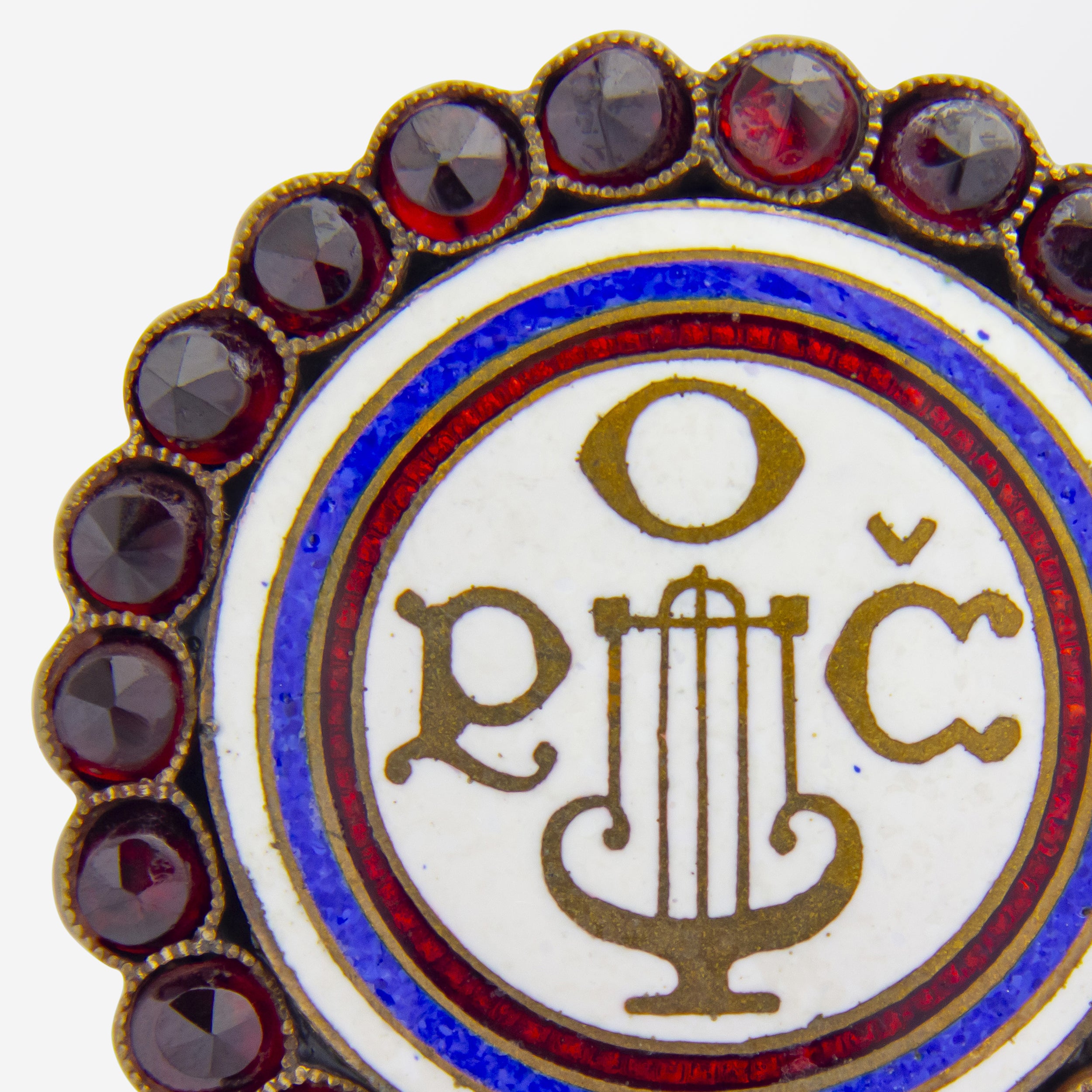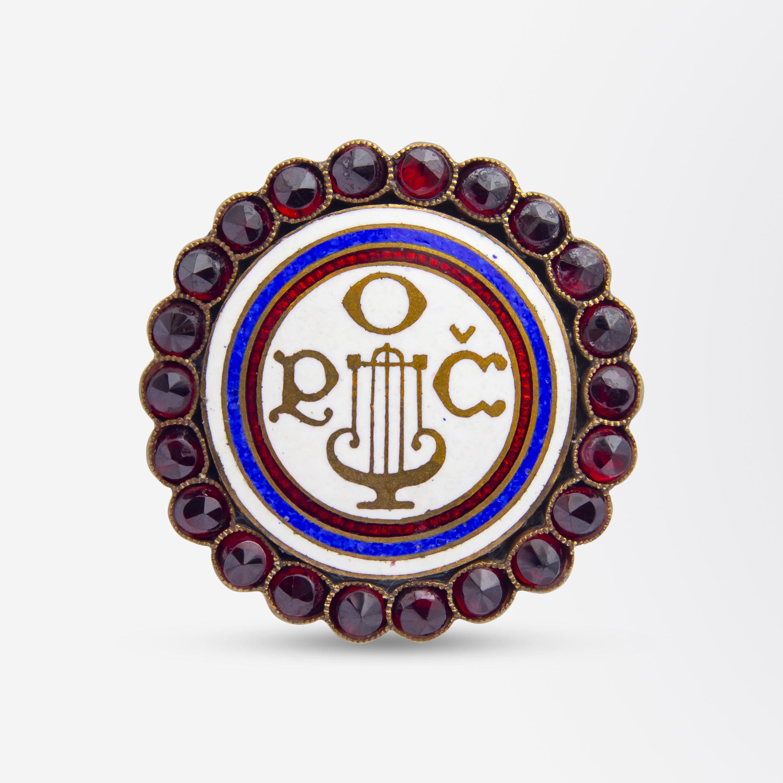 Cette ravissante broche en émail et grenats est accompagnée de son écrin d'origine et date du début du XXe siècle. La broche ronde, de forme cible, est ornée des lettres POC, abréviation de Pevecka Obec Ceska, soit « Communauté Chantante Tchèque ». Les émaux multicolores sont en excellent état, sans ébréchures ni fissures, contrairement à ce que l'on observe parfois sur les pièces de cet âge. Entourée d'un liseré de grenats rouge foncé, la broche est réalisée en métal « tombak » et se ferme au dos par une épingle et un crochet parfaitement fonctionnels. L'écrin d'origine, qui renferme l'épingle de la broche, porte l'inscription « POC » en lettres dorées sur le couvercle, attestant de son authenticité. Une ravissante petite broche ancienne provenant de ce que nous appelons aujourd'hui la République tchèque.