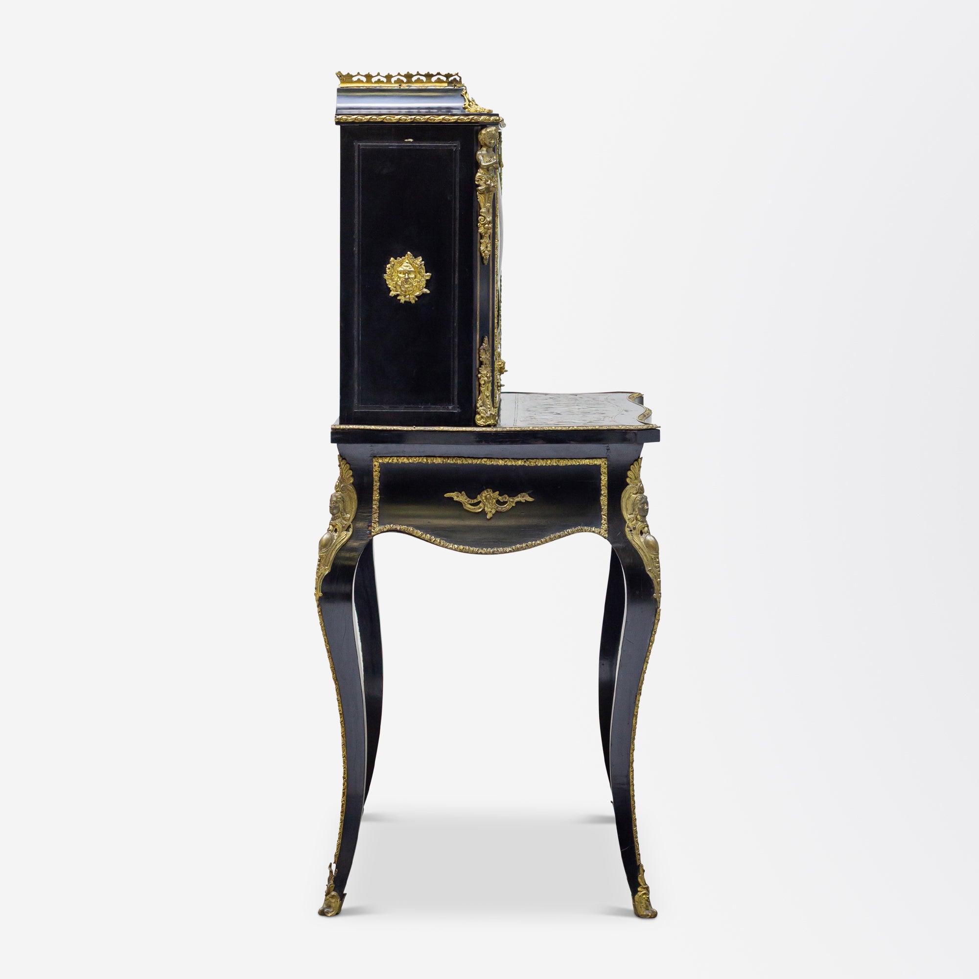 Un ornemental Secrétaire ou bureau d'écriture de style Napoléon III, réalisé en bois ébénisé et orné de marqueterie Boulle, avec incrustations de laiton et de nacre. Ce meuble présente de nombreuses garnitures en laiton, dont une galerie sur le plateau. Le travail de la marqueterie Boulle, créé par le célèbre ébéniste français André Charles Boulle, est remarquable. la marqueterie d'écaille de tortue, de laiton et d'étain dans l'ébène, rendue célèbre par Boulle au début du XVIIIe siècle.