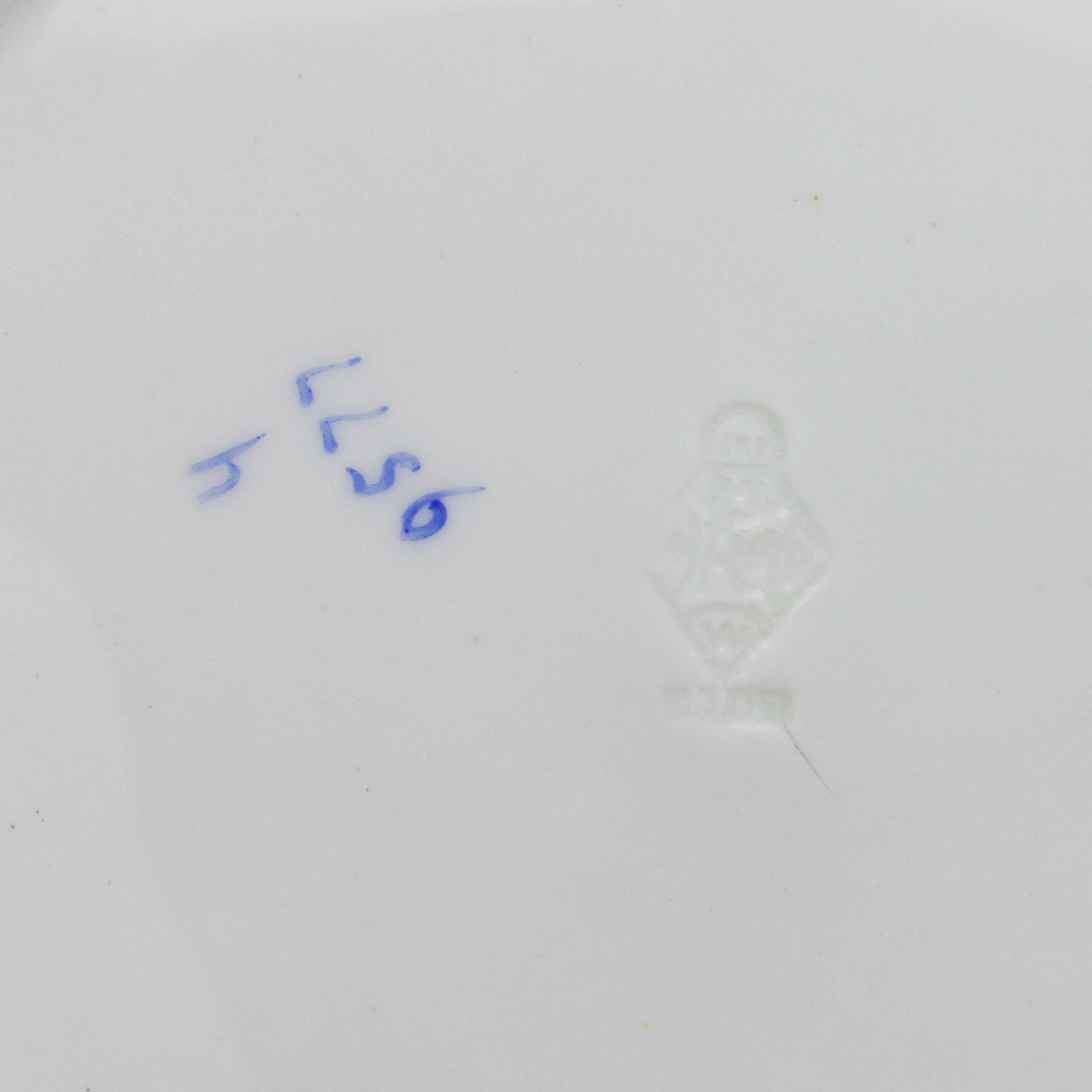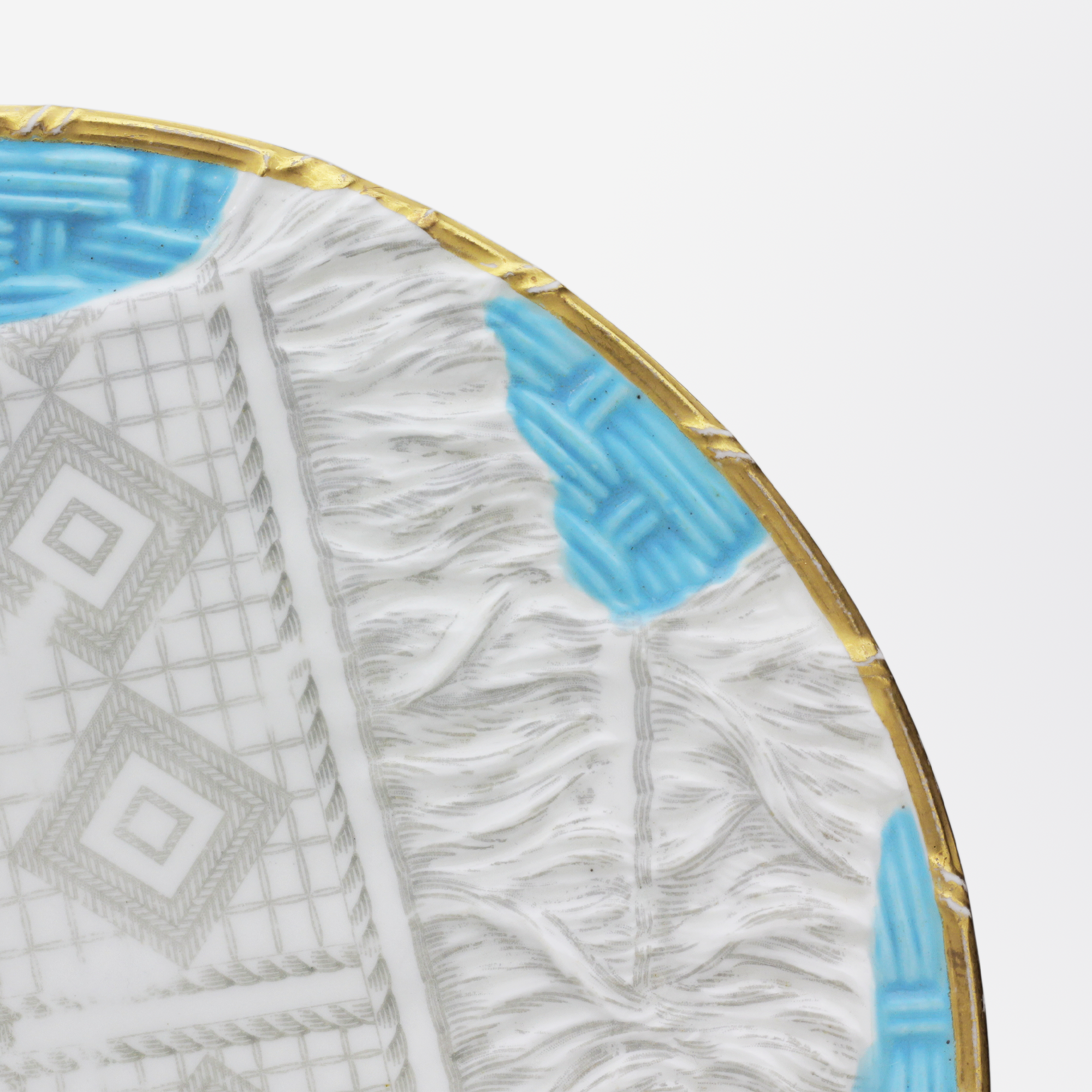 Assiette en céramique d'EJD Bodley réalisée selon la technique du trompe-l'œil (ce qui semble être une serviette pliée délicatement drapée sur un panier), datant de la fin des années 1870 en Angleterre. Edwin James Drew Bodley exerçait ses activités dans une partie de Poterie de Hill (à partir de 1882, elle s'appelait Crown Works), Burslem , Stoke-on-Trent , fabrication Chine et faïence .