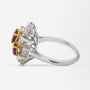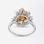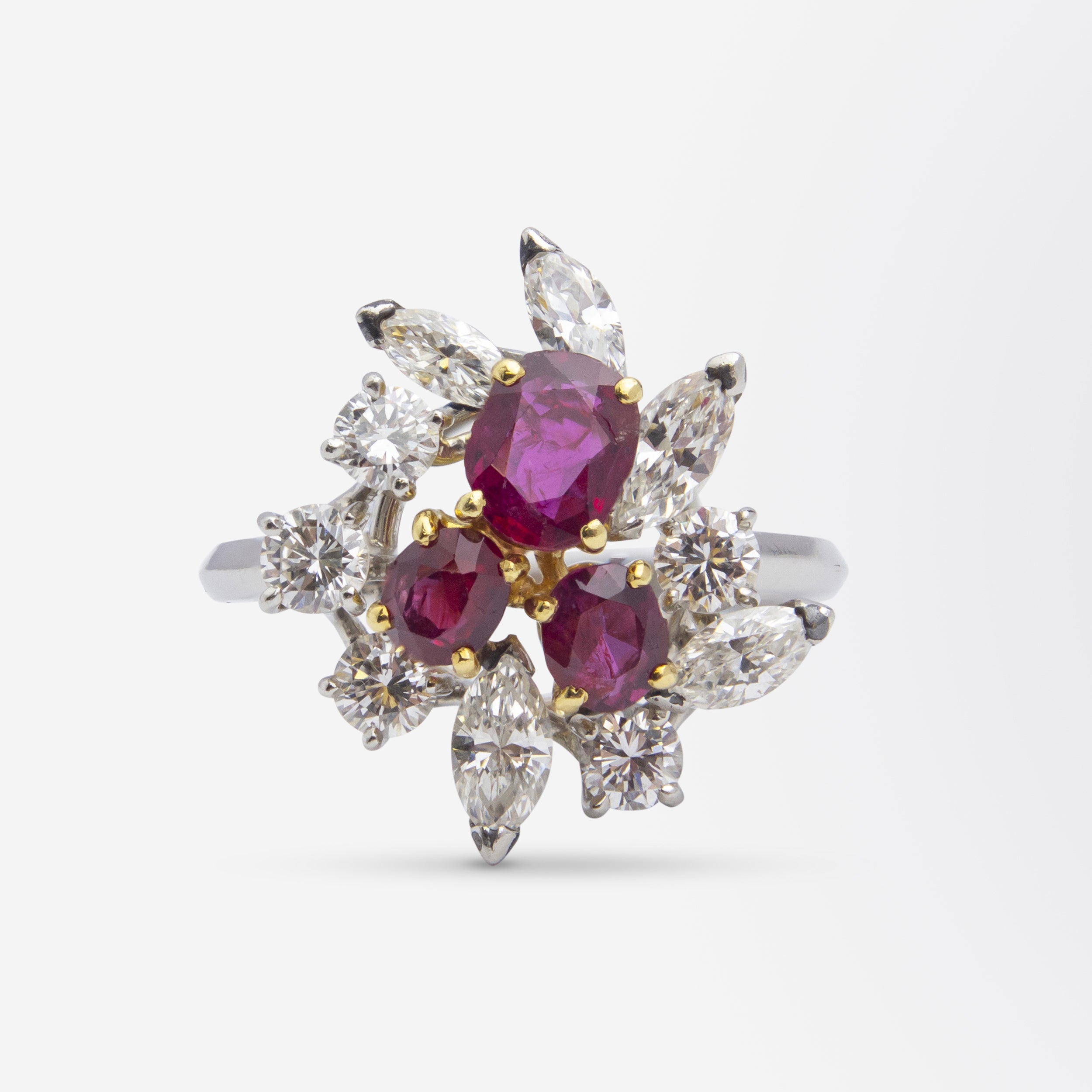 Cette bague en platine, diamants et rubis, entièrement réalisée à la main, est une création de Chaumet, l'un des plus prestigieux joailliers français. La monture en platine, également faite main, est sertie de trois rubis naturels de taille ovale, totalisant 1,42 carat, chacun maintenu par des griffes en or jaune 18 carats. Le reste de la bague est orné de cinq diamants ronds taille brillant et de cinq diamants taille marquise, de couleur G/H et de pureté VS-SI, pour un total de 1,85 carat. Chaque diamant est serti par des griffes en platine et entoure le rubis central d'un halo asymétrique. La bague est signée « CHAUMET RM » et porte une petite marque française effacée, ce qui rend sa datation difficile. Cependant, nous estimons qu'elle a été fabriquée dans les années 1960 ou 1970, car elle présente le style des bagues cocktail de cette époque. Fondée en France en 1780, la maison Chaumet est réputée pour avoir créé des pièces pour Napoléon et Joséphine, et est depuis longtemps reconnue pour avoir réalisé certains des diadèmes en diamants les plus prestigieux au monde. Cette élégante bague cocktail serait un magnifique cadeau pour une femme célébrant ses noces de rubis, ou un ravissant présent de naissance pour une future maman.