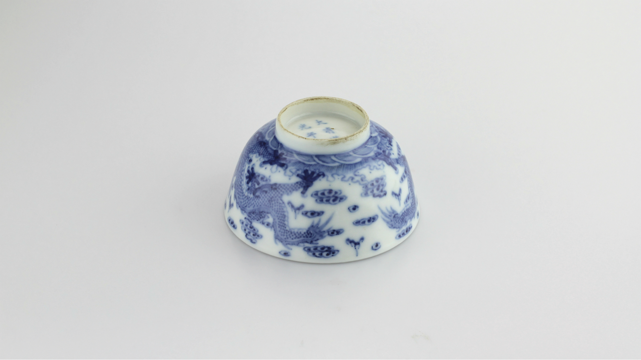 Une tasse bleue et blanche de la période Daoguong (1821-1850) ornée de deux dragons à cinq griffes.