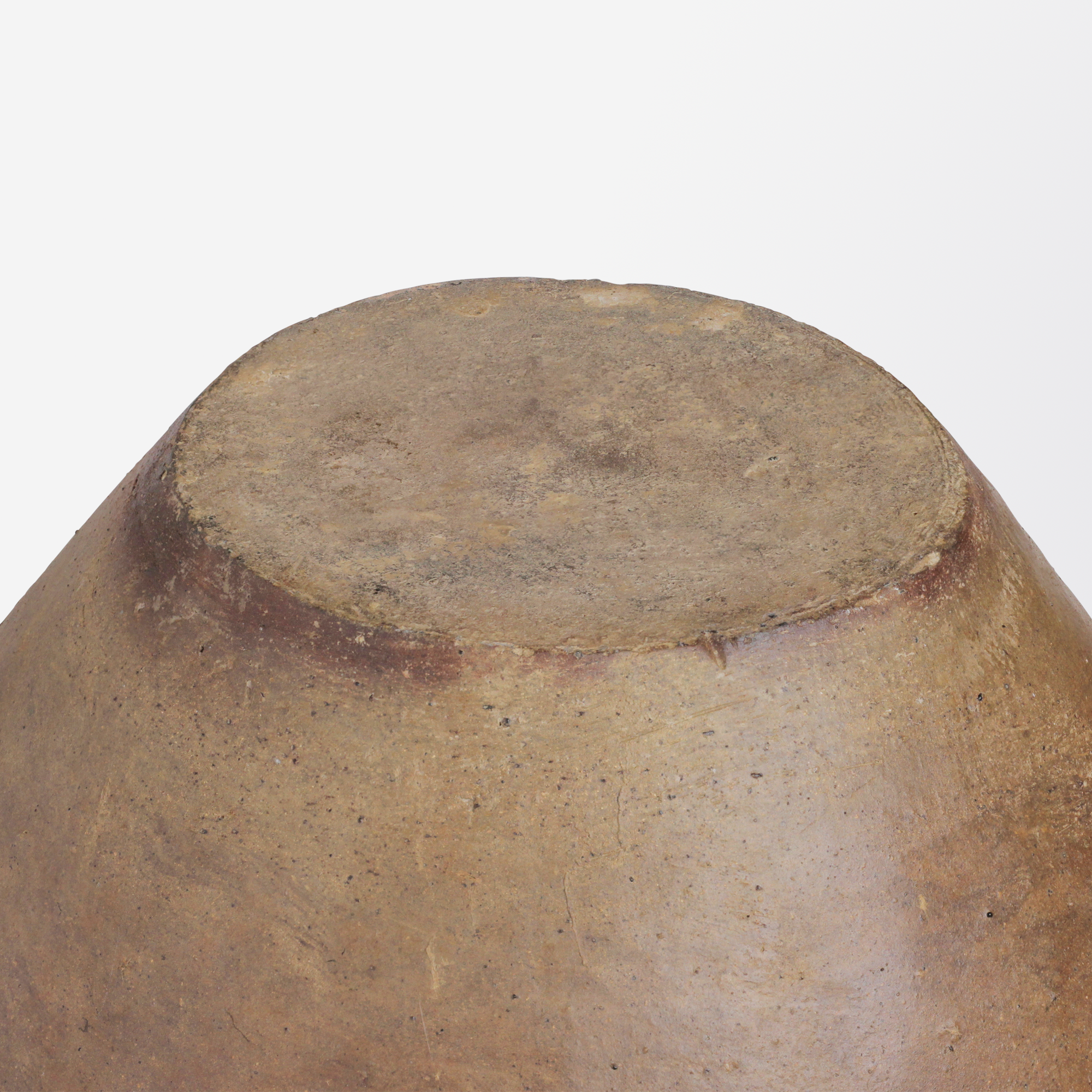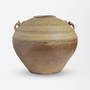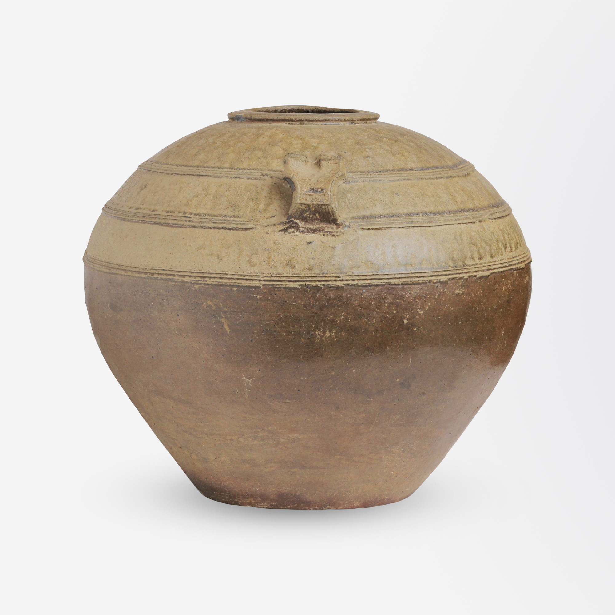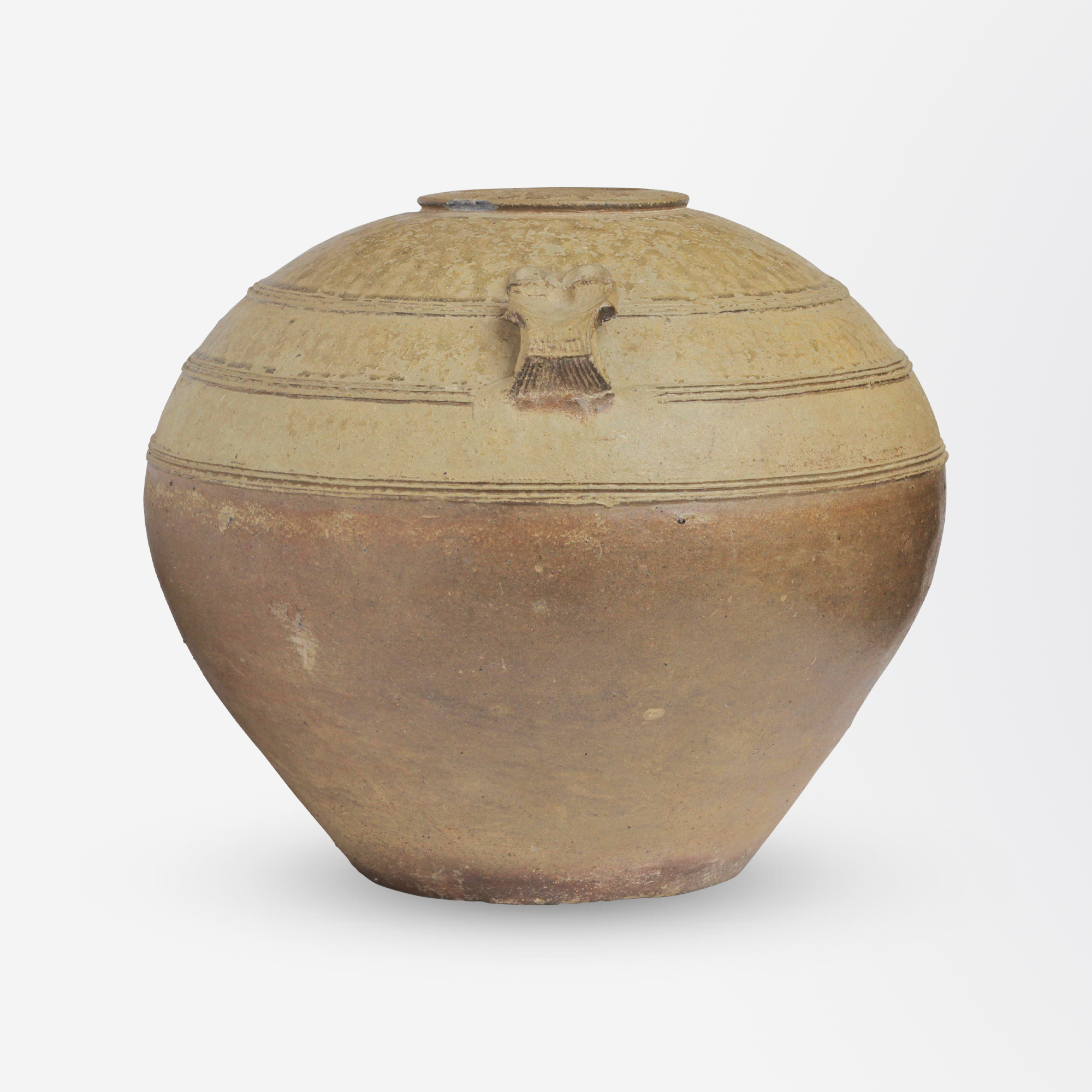 Ce vase en faïence date de la période des Royaumes combattants en Chine, entre 400 et 200 av. J.-C., une époque marquée par d'intenses conflits visant à unifier l'empire chinois. Il est bicolore, orné de petites anses rapportées de chaque côté et de deux rangées de lignes incisées.