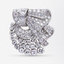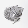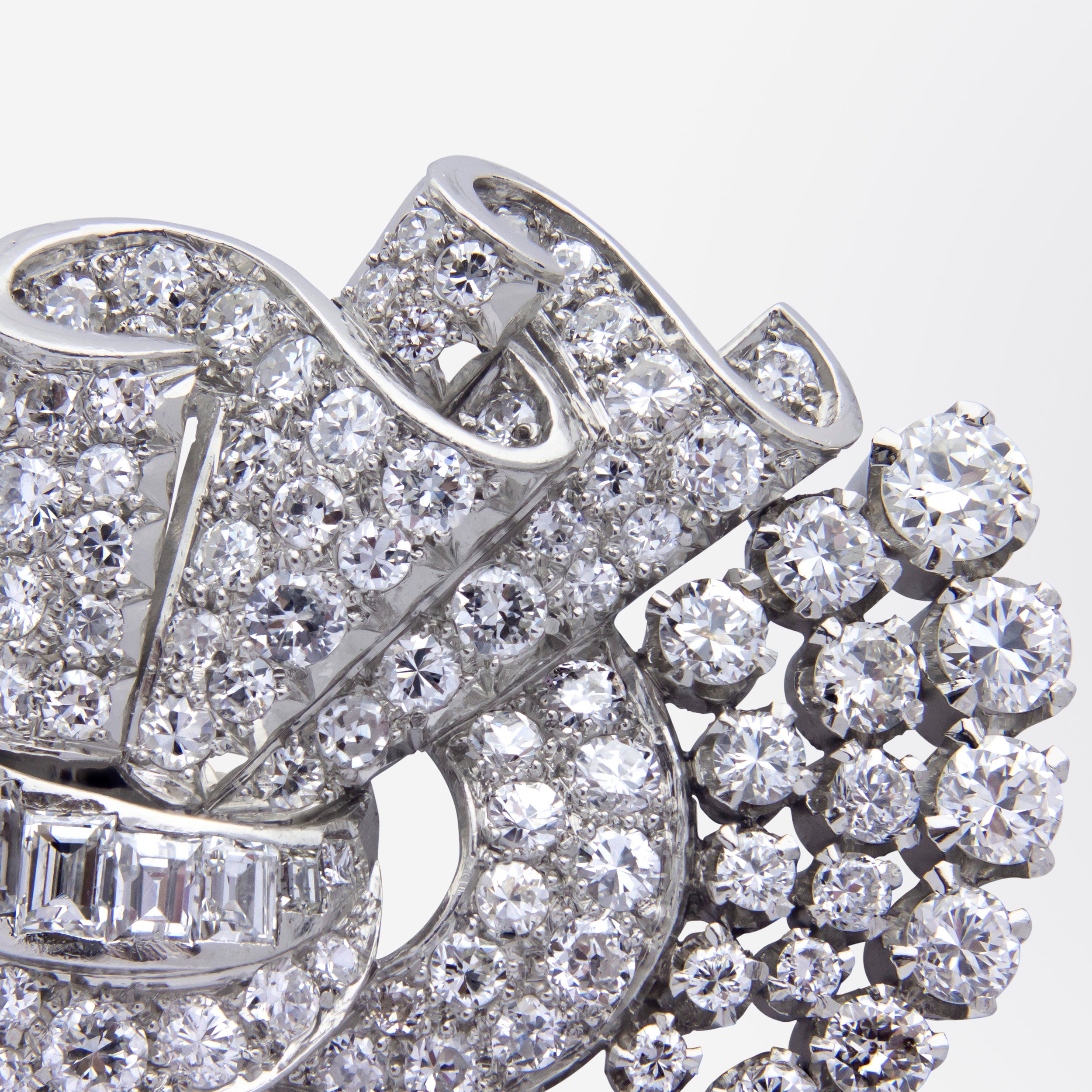 Cette superbe broche à clip sertie de diamants a été fabriquée en France durant la période Art déco. Cette broche en platine, entièrement sertie de 88 diamants taille brillant semi-moderne, de diamants taille baguette et d'un diamant taille princesse, est réalisée à la main. Chaque diamant est de couleur G/H et de pureté VS-SI, pour un total de 4,75 carats. La broche présente un magnifique motif de ruban enroulé et nous datant sa fabrication d'environ 1935, à la fin de l'ère Art déco. À l'origine, cette broche faisait partie d'une paire, fixée à un support permettant de la porter comme une broche plus grande. Malheureusement, le support et la seconde broche ont disparu, mais ce clip unique subsiste et constitue un exemple exquis de bijou Art déco. À l'arrière, la double épingle articulée porte un poinçon français légèrement effacé, probablement un poinçon de pureté du platine, qui atteste de sa fabrication en France. Ce clip pouvait se porter avec aisance à la poche de la veste d'un smoking ou à l'encolure d'une robe.