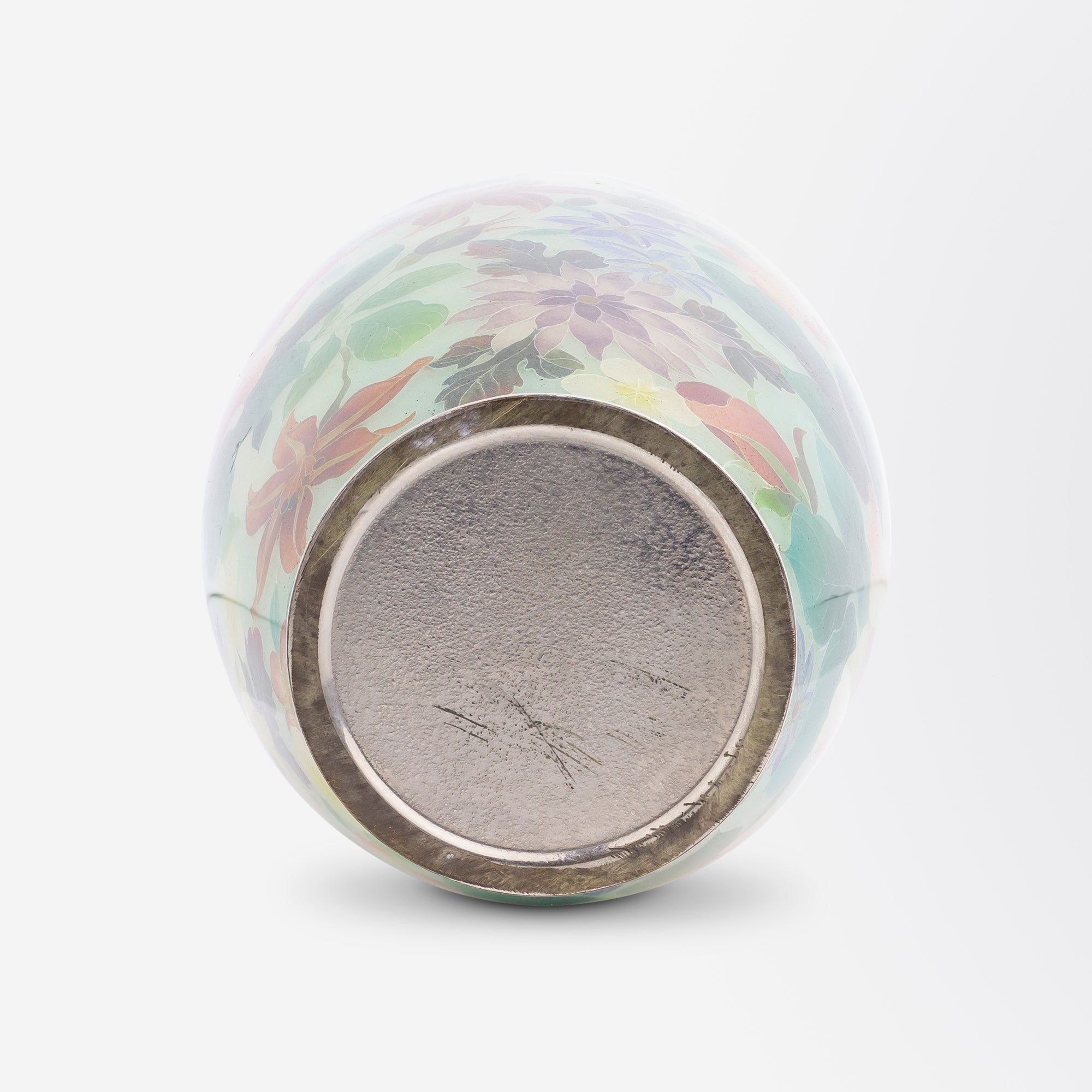 Ce vase cloisonné en plique-à-jour est un exemple exceptionnel du savoir-faire japonais de la fin de l'ère Meiji (1868-1912). Le plus remarquable, c'est son état de conservation impeccable pour son âge, ce qui indique qu'il n'a jamais subi de choc ni de chute. On pense que la technique du plique-à-jour a été introduite au Japon par Ando Jubei (1876-1953) et Kawade Shibararo (1856-1921) après avoir vu des exemples à Paris, techniques qu'ils ont ensuite perfectionnées. Le terme japonais exact est « shotai-jippo », qui signifie cloisonné sans support. Il semblerait que le corps métallique de la pièce soit dissous après la cuisson et le polissage, une opération réputée complexe et laborieuse. Le vase repose sur une base en métal blanc non marquée, et son col est également orné d'un rebord en métal blanc, lui aussi non marqué. Bien que difficile à rendre en photo, ce vase est d'une translucidité remarquable et scintille au soleil. Hormis quelques rayures superficielles mineures, il est en parfait état et pourrait devenir la pièce maîtresse de votre collection de cloisonnés.