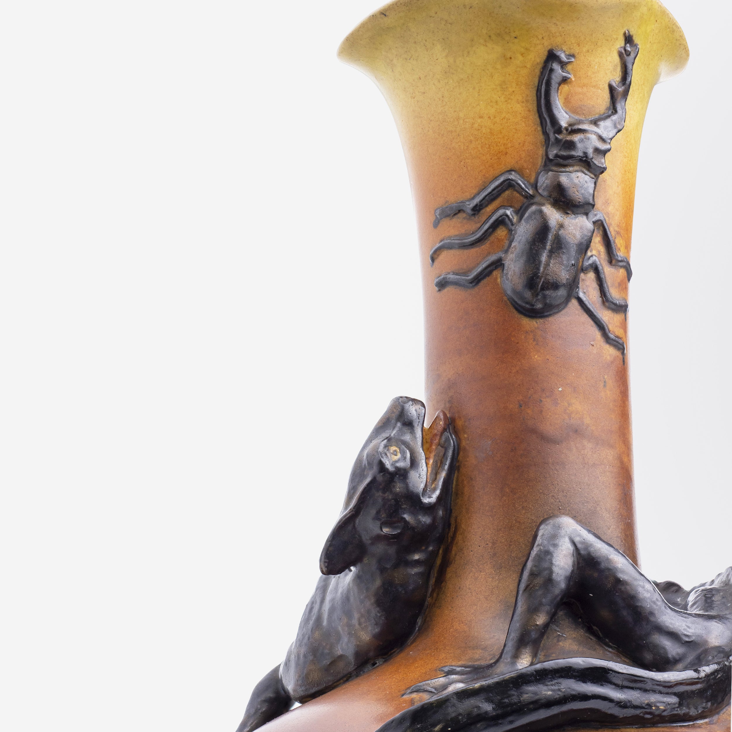 Vase Art Nouveau danois à fond brun, rouge et jaune, orné d'un grand lucane cerf-volant et d'un lézard, par le fabricant P. Ipsen.