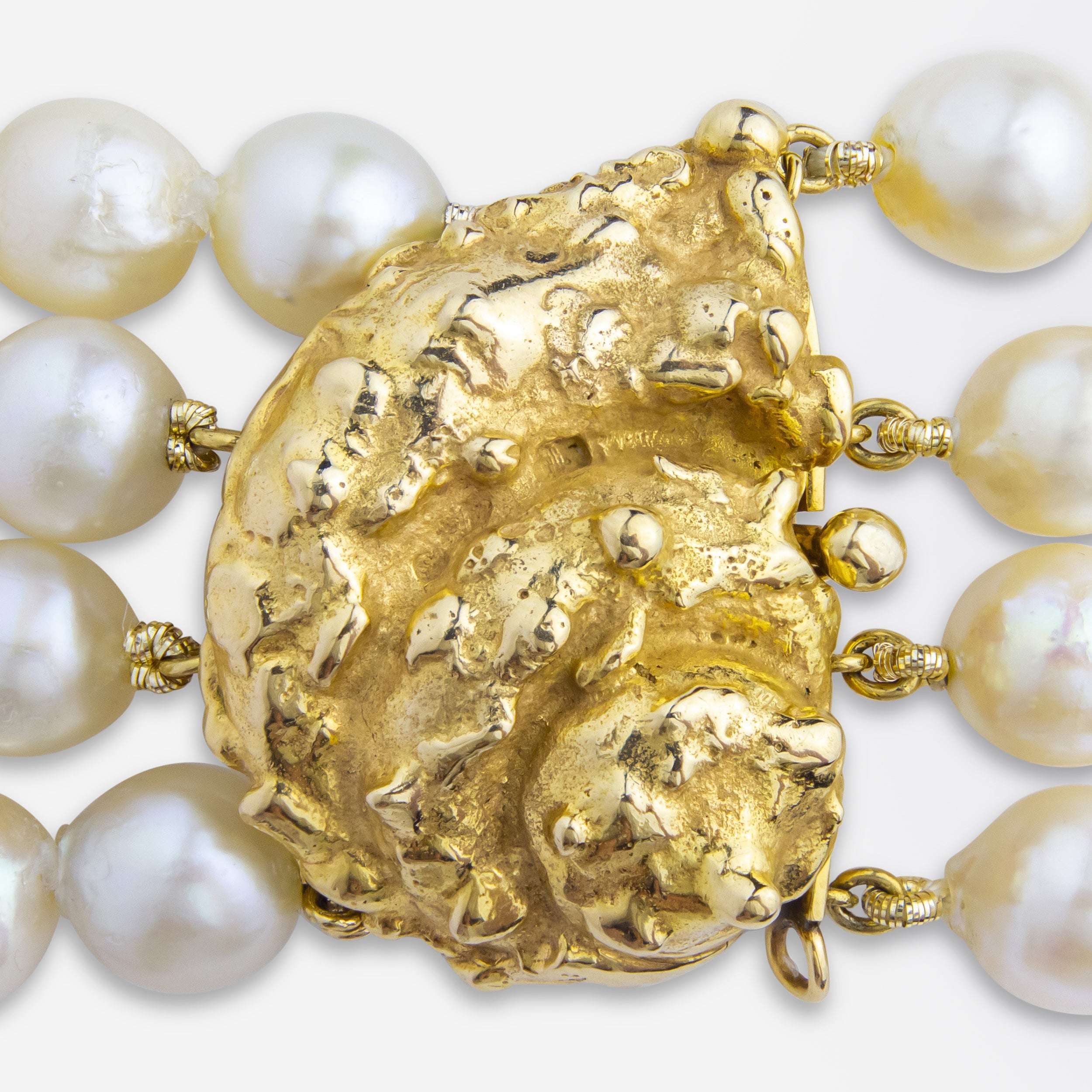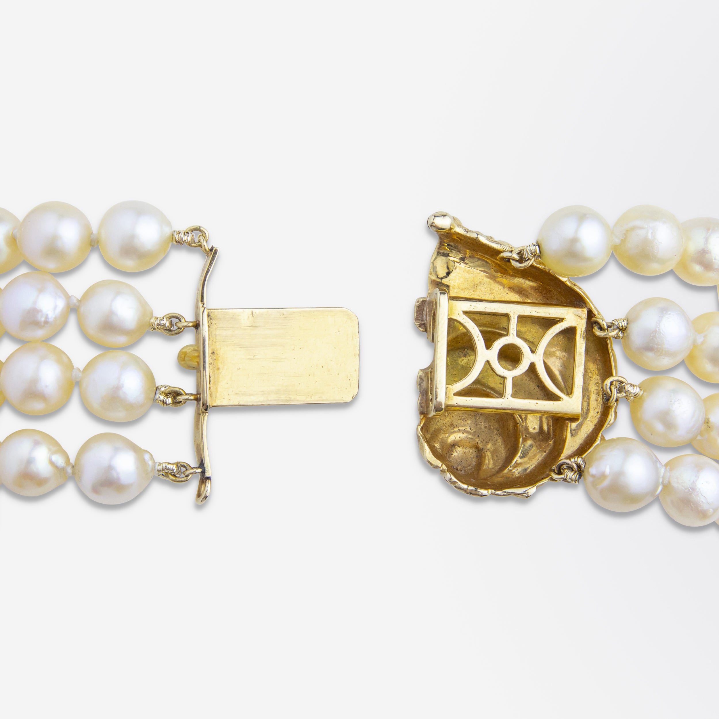 Ce bracelet à quatre rangs de perles Akoya est doté d'un fermoir en forme de coquillage en or et porte la marque du joaillier américain David Webb. Datant des années 1960, il est orné d'un fermoir en forme de coquillage en or moulé, à l'aspect et à la texture « fossilisés ». De ce fermoir partent quatre rangs de perles blanches de type Akoya, nouées individuellement et terminées par un fermoir à languette. Fondée en 1948, la maison David Webb a créé des bijoux audacieux portés par des personnalités telles que la duchesse de Windsor, Diana Vreeland, Elizabeth Taylor et Jackie Kennedy Onassis. Depuis le décès de David Webb en 1975, la maison poursuit son activité et possède des boutiques à New York et à Los Angeles. Entièrement réenfilé en 2024, ce bracelet est prêt à orner à nouveau le poignet d'une amatrice de perles.