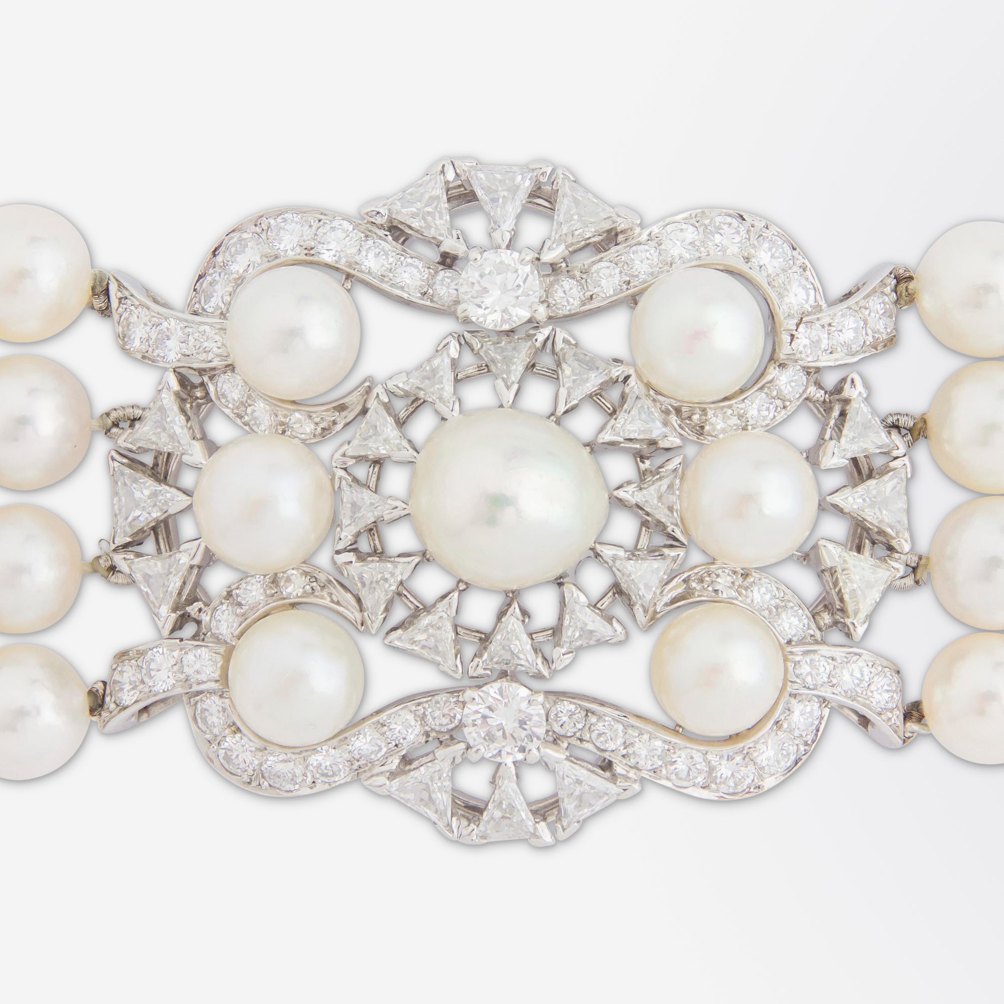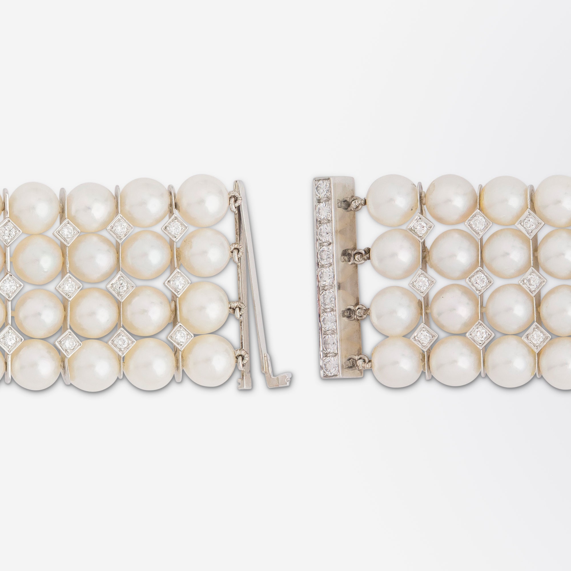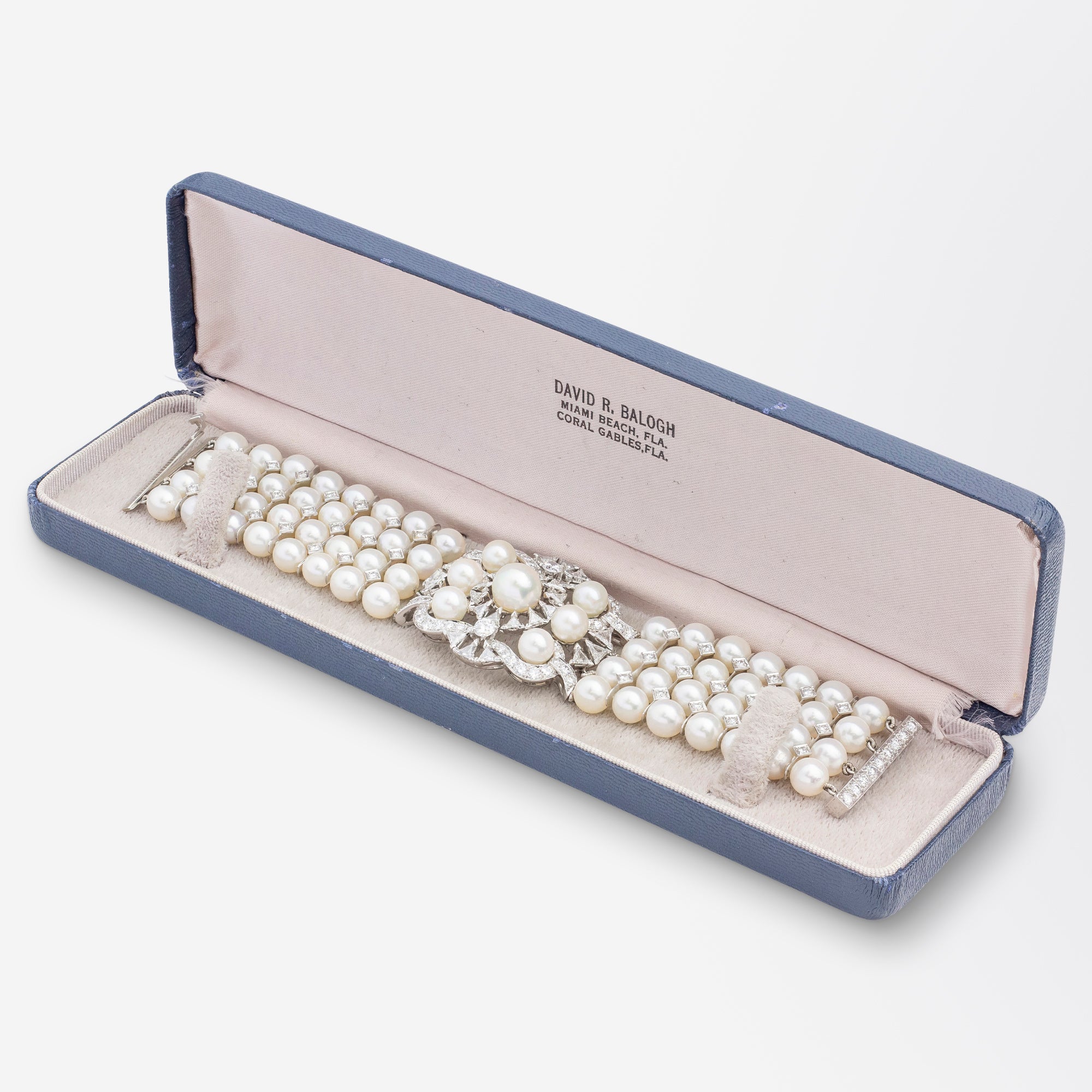 Ce bracelet exceptionnel, datant des années 1960, a été vendu par le joaillier David R. Balogh, basé à Miami. Il est réalisé en platine, diamants et perles de culture. Le bracelet présente une plaque centrale ornée d'un pavage de diamants et de perles. Les diamants sont de tailles variées : brillant rond semi-moderne, triangle à degrés, brillant rond et taille simple. De chaque côté de cette plaque centrale partent quatre rangs de perles de culture Akoya, séparés par des entretoises en platine et diamants. Le bracelet se ferme par un fermoir coulissant serti de diamants, parfaitement fonctionnel et sécurisé. Chaque diamant est de couleur G/H et de pureté VS à SI, pour un poids total de 6,30 carats. Le bracelet est accompagné de son écrin d'origine, ayant appartenu à David R. Balogh, joaillier de Miami réputé pour sa clientèle de célébrités, comme Frank Sinatra et le Shah d'Iran. Il est rare de trouver un bracelet cocktail d'une telle beauté.