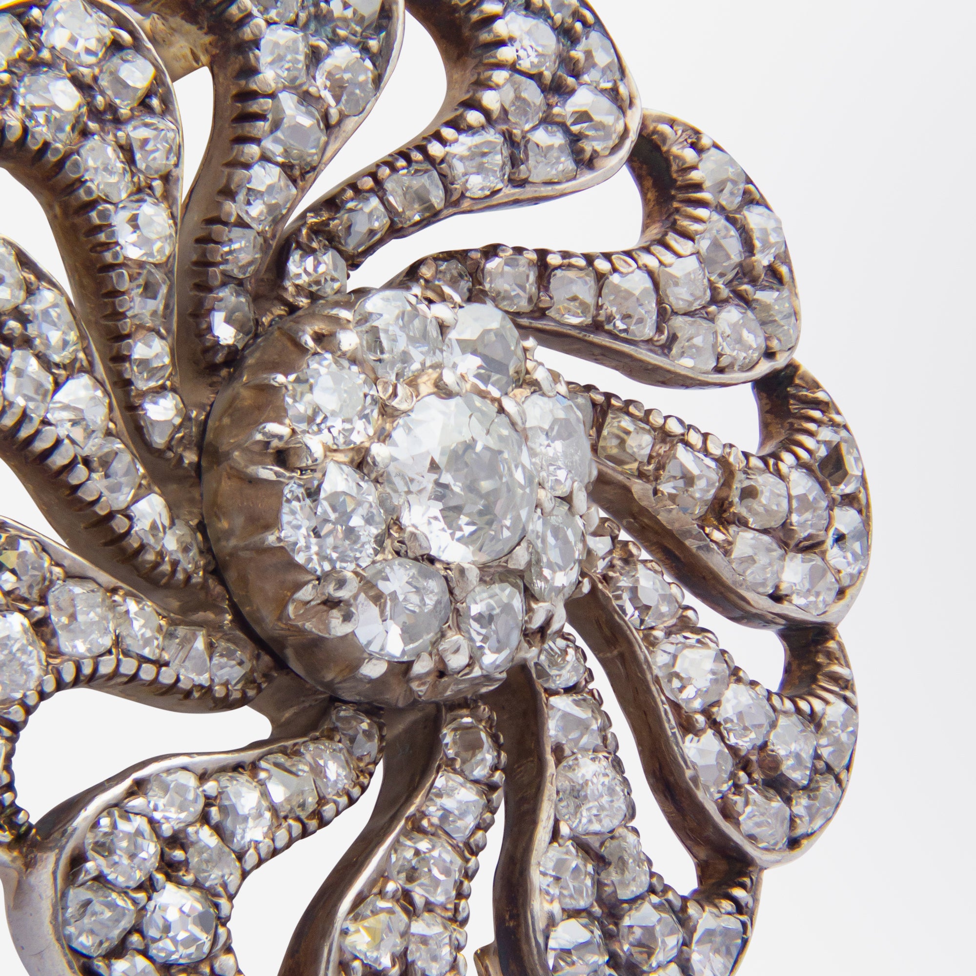Cette exquise broche florale stylisée Art déco a probablement été réalisée dans les années 1920, au plus fort de la période Art déco. Cette broche en or 18 carats a été façonnée à la main en or jaune et blanc, puis sertie de diamants taille ancienne. Le centre de la fleur est orné d'un brillant diamant taille ancienne d'environ 0,30 carat, entouré de huit autres petits diamants taille ancienne. Les pétales de la fleur sont stylisés en une spirale Art déco, caractéristique de l'époque. Les onze pétales sont sertis de 121 diamants taille ancienne. Chaque pierre de cette pièce est de couleur H/I/J et de pureté SI-P2, pour un poids total de 2,51 carats. À l'arrière, la broche est munie d'une épingle à charnière et d'un fermoir à rouleau, parfaitement fonctionnels et sécurisés.