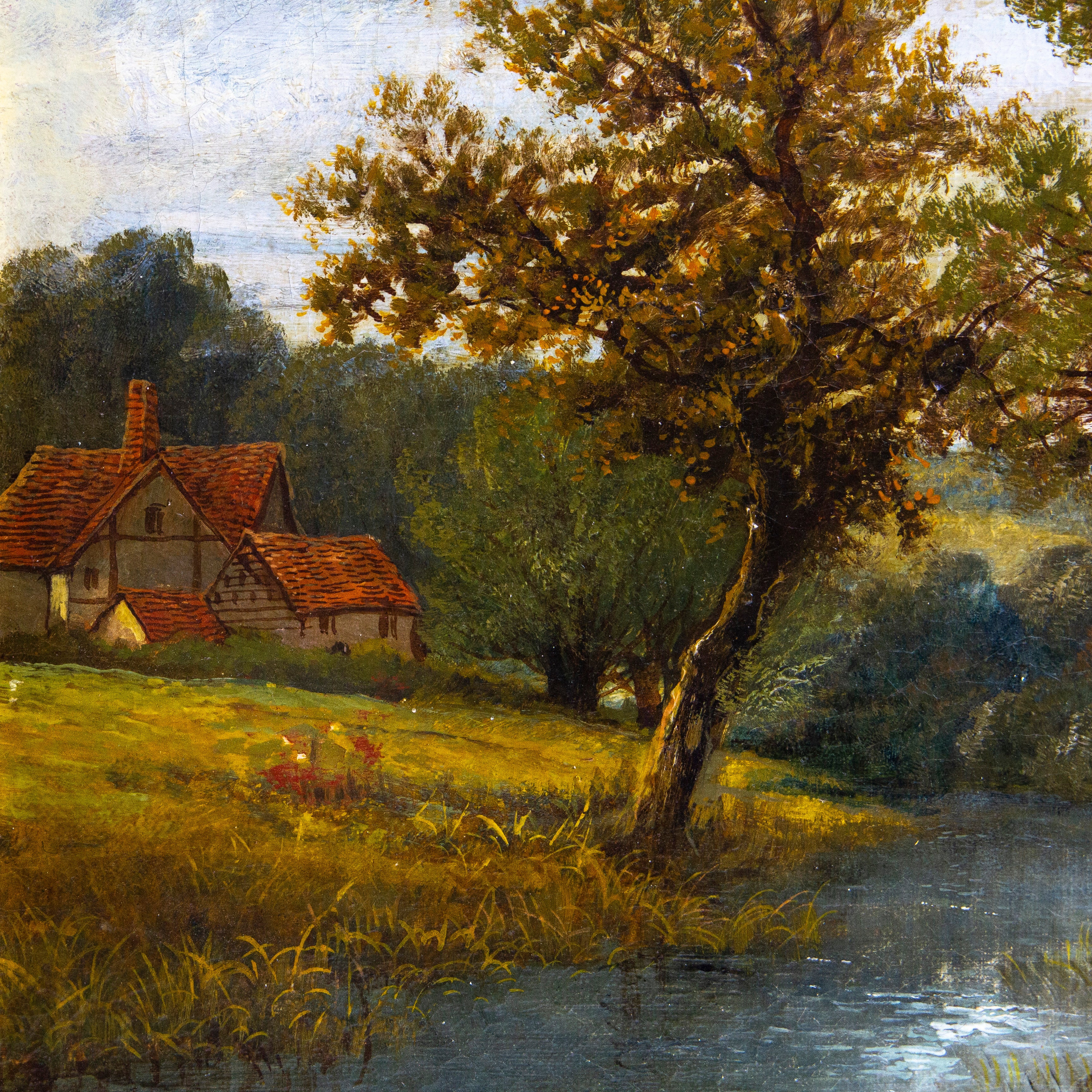 Huile sur toile hollandaise du début du XIXe siècle représentant une scène de ferme avec une jeune fille qui se promène et des oies. Signée par un peintre inconnu.