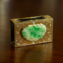 Un élégant étui à allumettes en argent massif et jade jadéite, signé Edward I. Farmer de New York. La face avant présente un morceau de jade jadéite sculpté, serti dans une monture en argent massif gravée. On y perçoit des traces de dorure, une technique que Farmer appliquait fréquemment à ses créations. Une pièce Art déco à la fois belle et pratique, dans un état exceptionnel pour son âge.