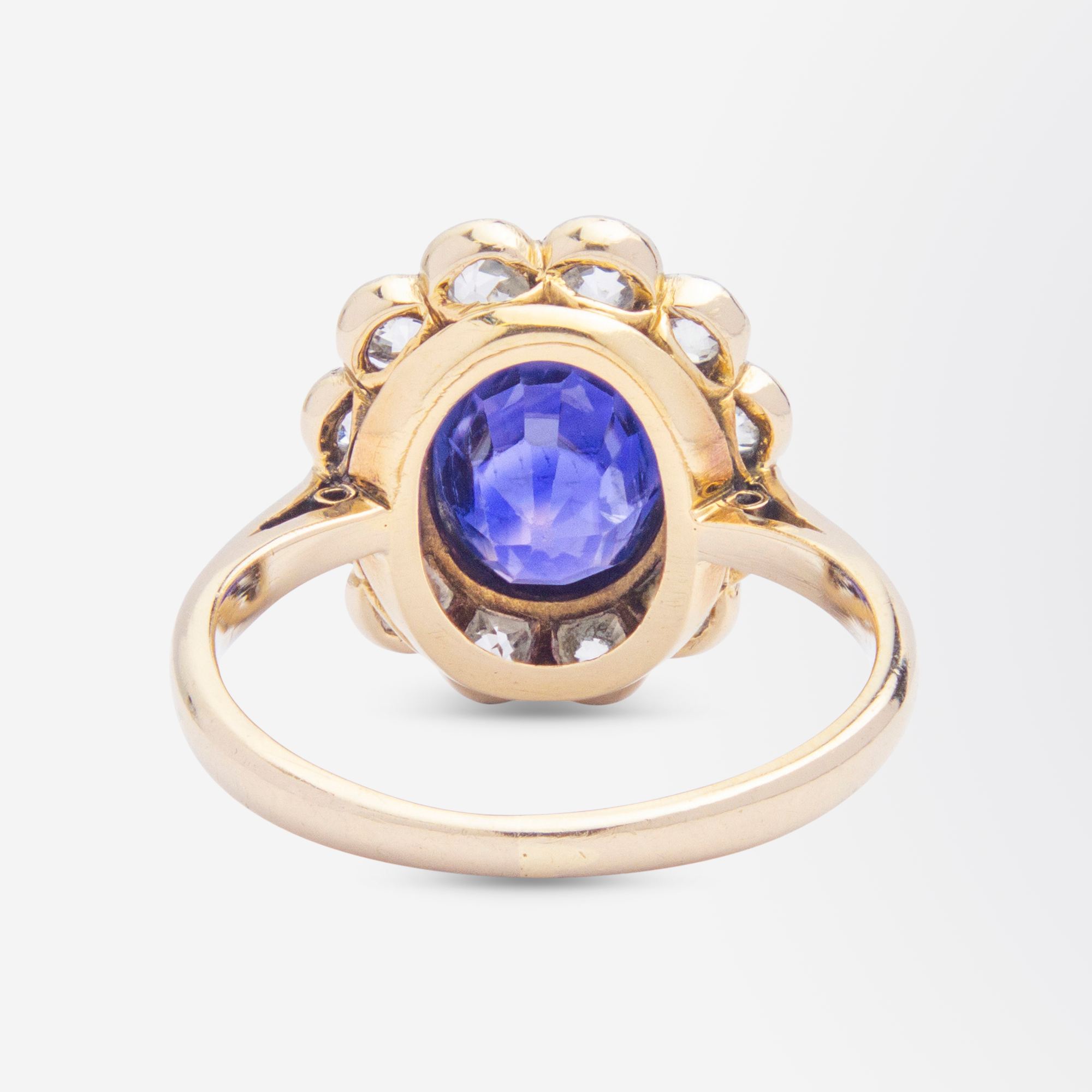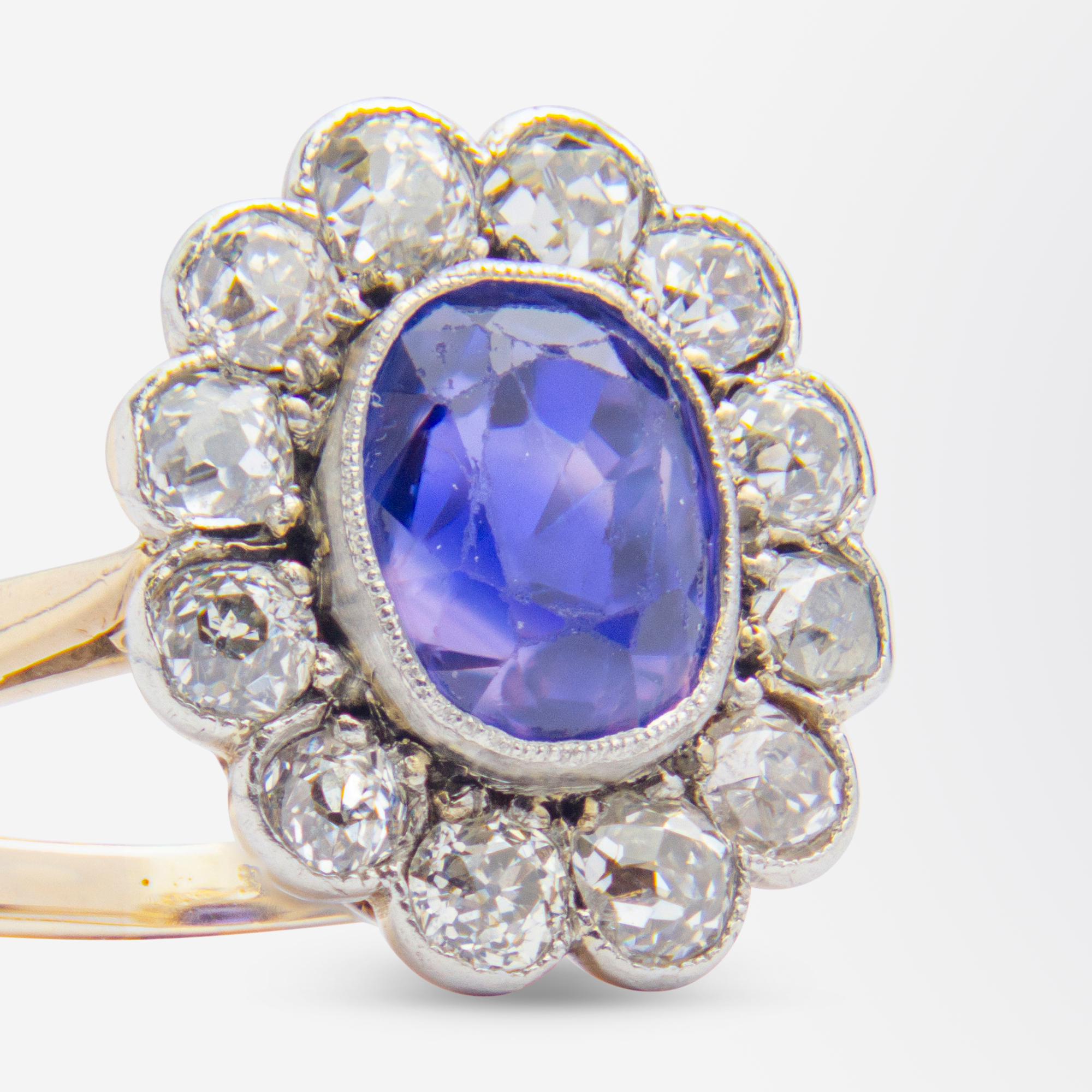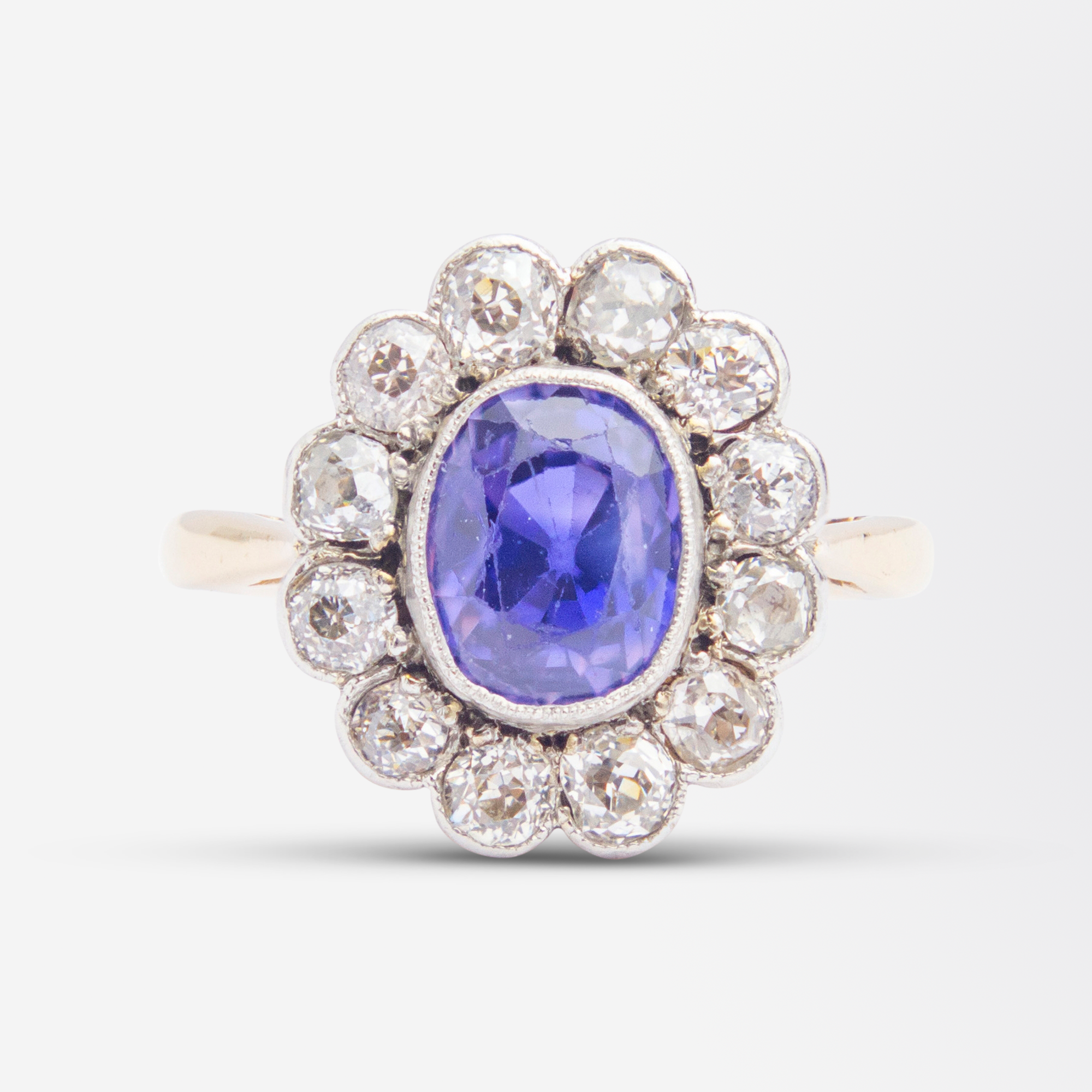 Cette bague ancienne de style édouardien présente un magnifique saphir à changement de couleur, entouré de diamants. La bague, en platine et or jaune 18 carats, est réalisée à la main. Le saphir, de taille ovale mixte et serti clos, pèse 1,92 carat. Un gemmologue a décrit ce saphir comme changeant de couleur « d'un bleu intense à la lumière du jour à un violet intense à la lumière incandescente » et l'a qualifié de « brillant et légèrement inclus ». Le saphir est entouré de 12 diamants taille ancienne, de couleur G à I et de pureté VS-SI, totalisant 1,26 carat. À l'intérieur de l'anneau, un poinçon très discret, légèrement effacé, semble avoir été endommagé lors d'une ancienne mise à taille. Bien que nous ignorions qui a fabriqué cette bague et où, il est probable qu'elle soit européenne et date d'environ 1910. Cette bague est un véritable ravissement et ferait une magnifique bague de fiançailles pour une femme qui apprécie les beaux bijoux anciens.