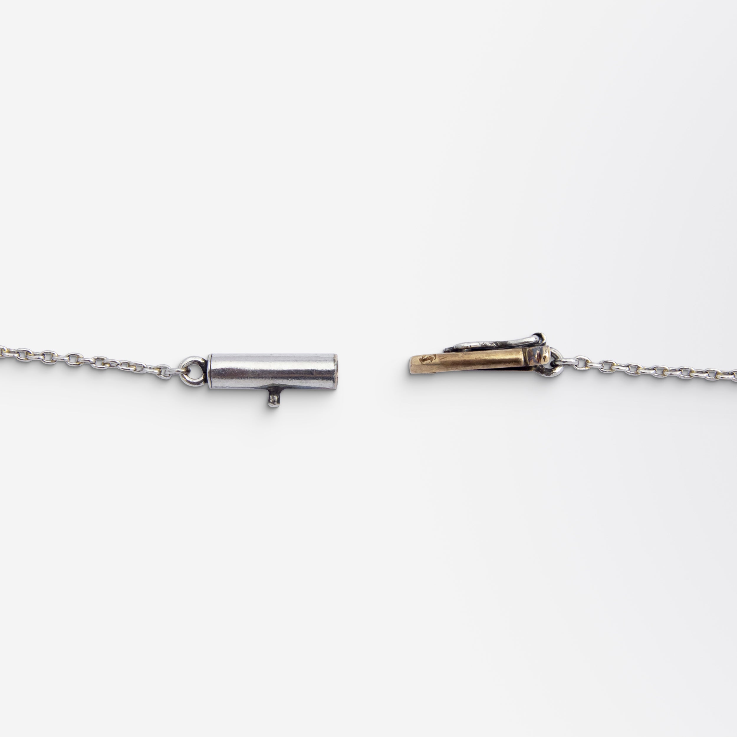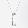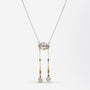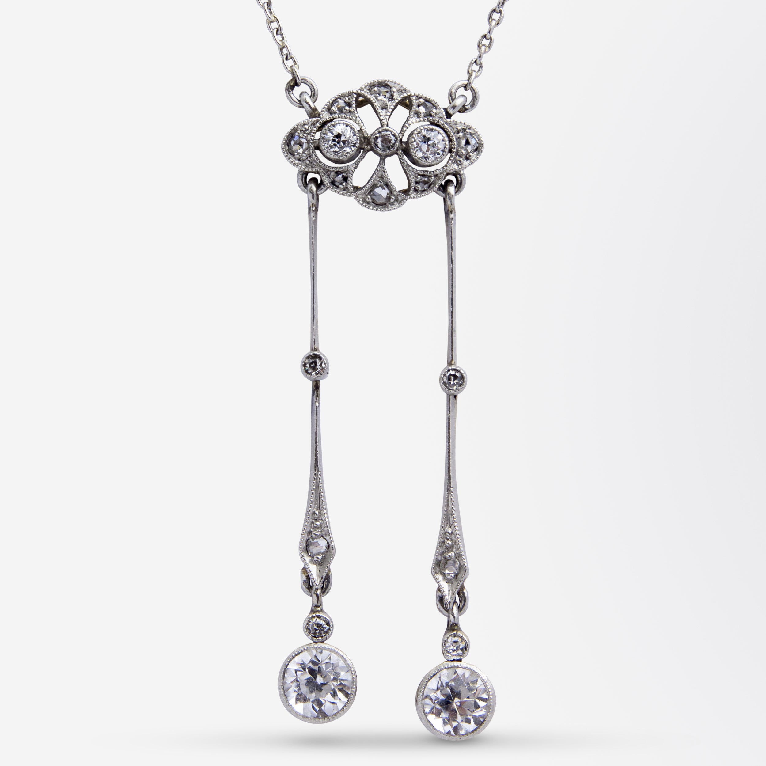 Ce ravissant collier, souvent appelé « négligee », date d'environ 1910. Il est orné d'un petit groupe de diamants sertis dans un motif ovale symétrique en platine, d'où pendent deux pendentifs. Ces pendentifs, en or jaune et platine, sont sertis de diamants et de deux saphirs blancs ronds de belle taille, sertis clos. Chaque diamant est estimé à 0,12 carat, de couleur H et de pureté SI/piqué. La très fine chaîne en platine à laquelle est suspendu le « négligee » se termine par un fermoir barillet et un fermoir de sécurité en forme de 8, parfaitement fonctionnels. Bien que non poinçonné, ce collier date du premier quart du XXe siècle et provient probablement d'Europe continentale. Un très beau collier ancien qui se portera aussi bien avec un jean et un t-shirt qu'avec une petite robe noire pour une soirée cocktail.