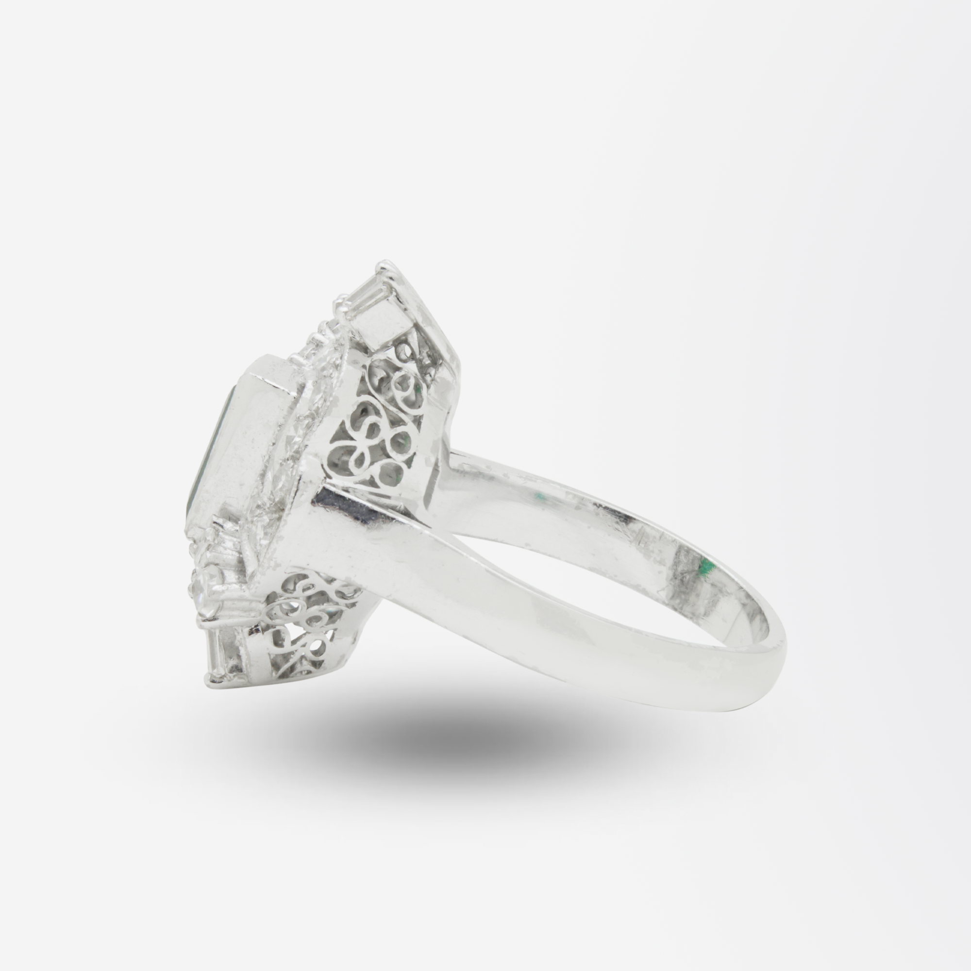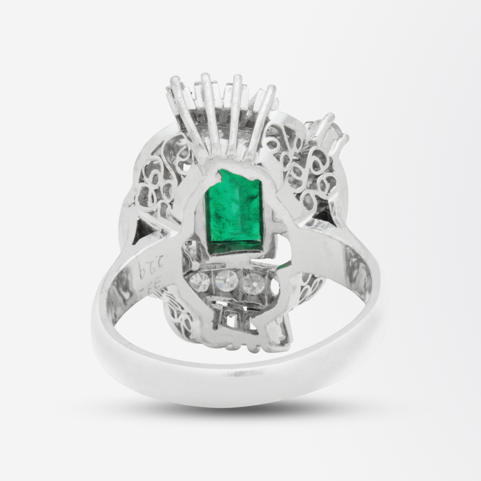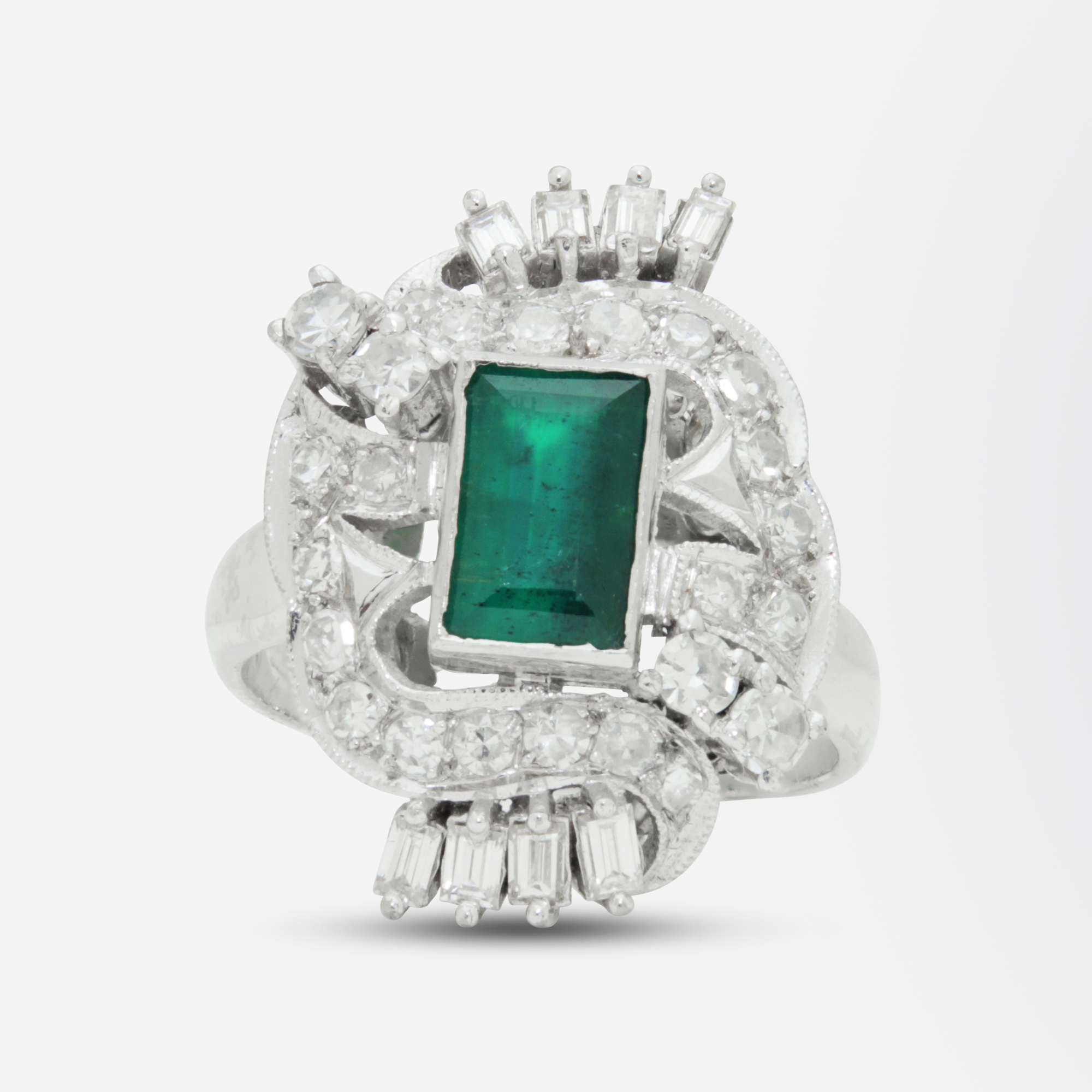 Une bague cocktail d'une finesse exceptionnelle, typique de la période rétro du XXe siècle. Réalisée à la main en platine, cette pièce met en valeur une émeraude octogonale de 1,25 carat, sertie clos. Autour de cette émeraude, une multitude de diamants taille simple et baguette, de couleur G/H et de pureté VS à SI, sont sertis en spirale asymétrique, dans un style rétro. La galerie en platine, finement ajourée, évoque la dentelle. Une bague élégante et raffinée, qui a magnifiquement vieilli et qui symbolise l'époque des cocktails et des bals de gala.