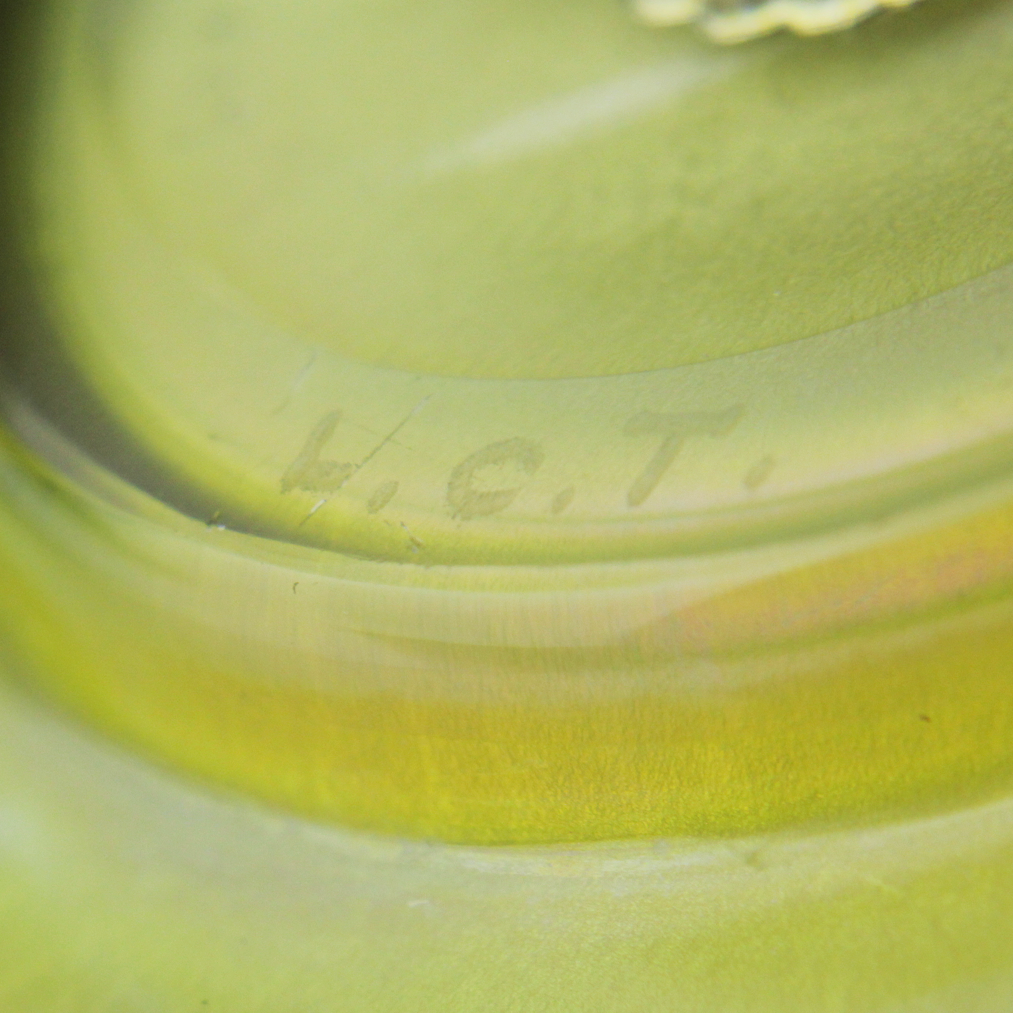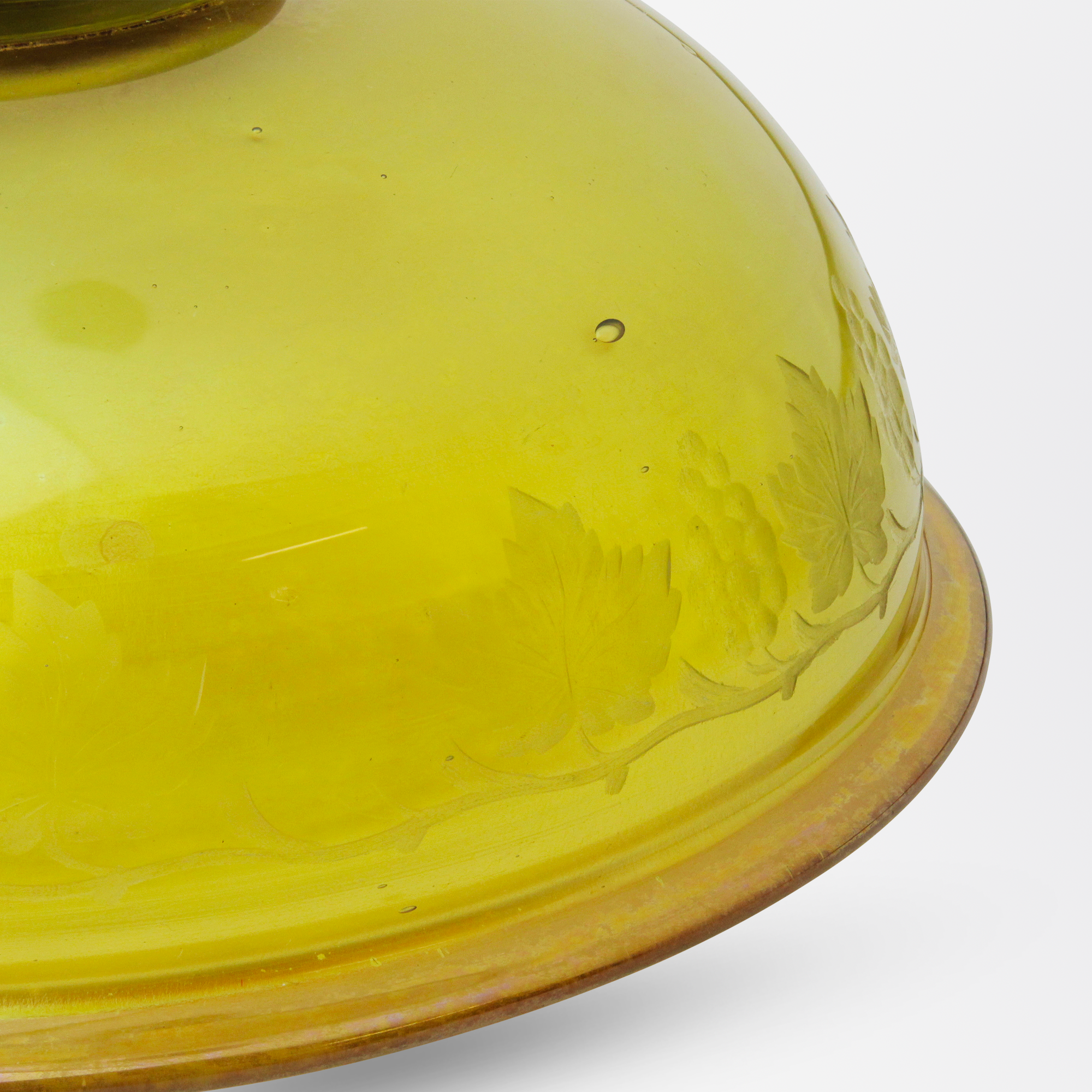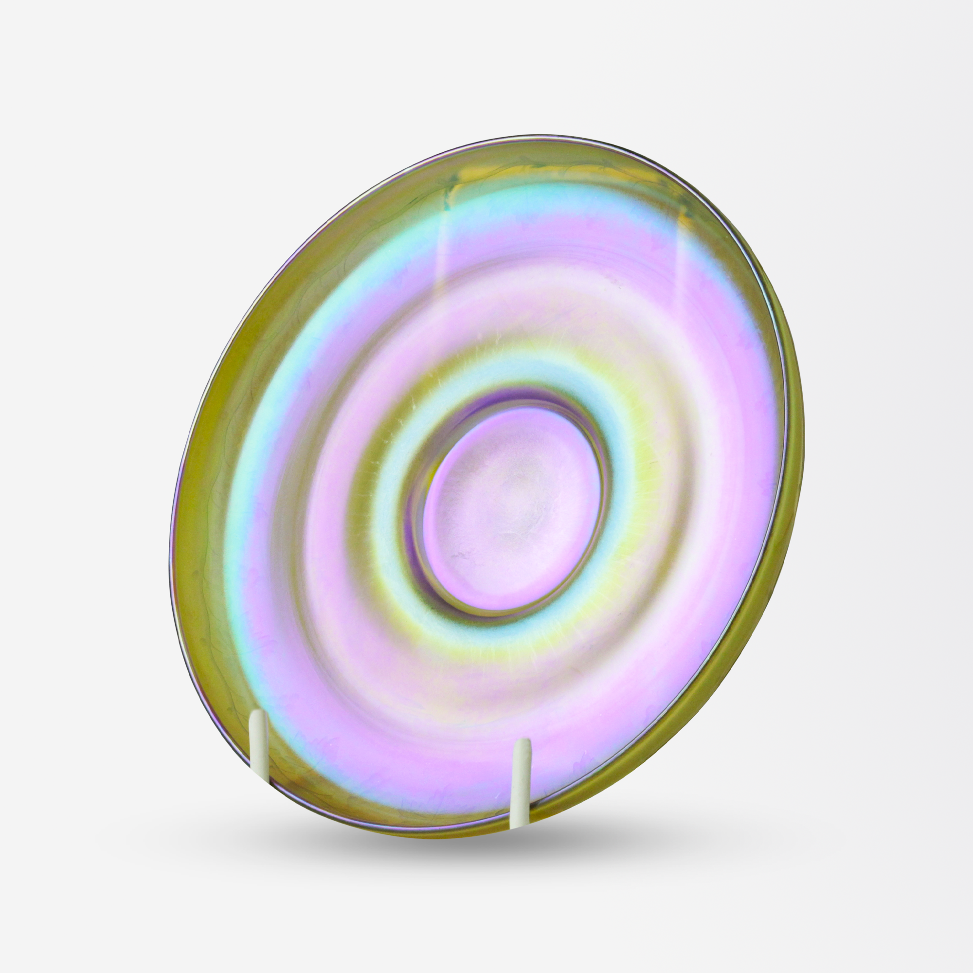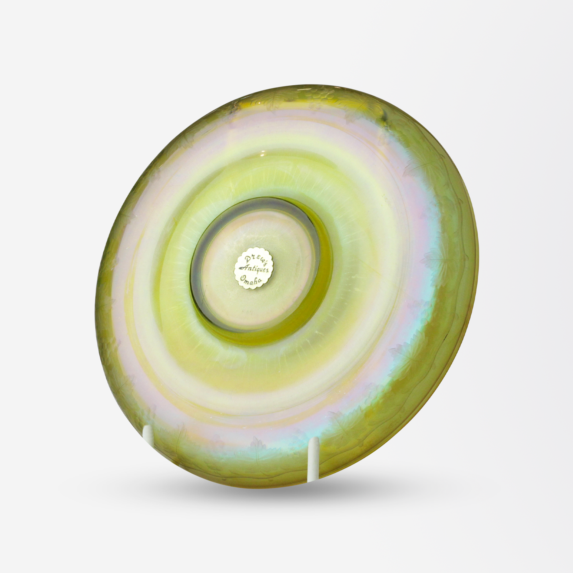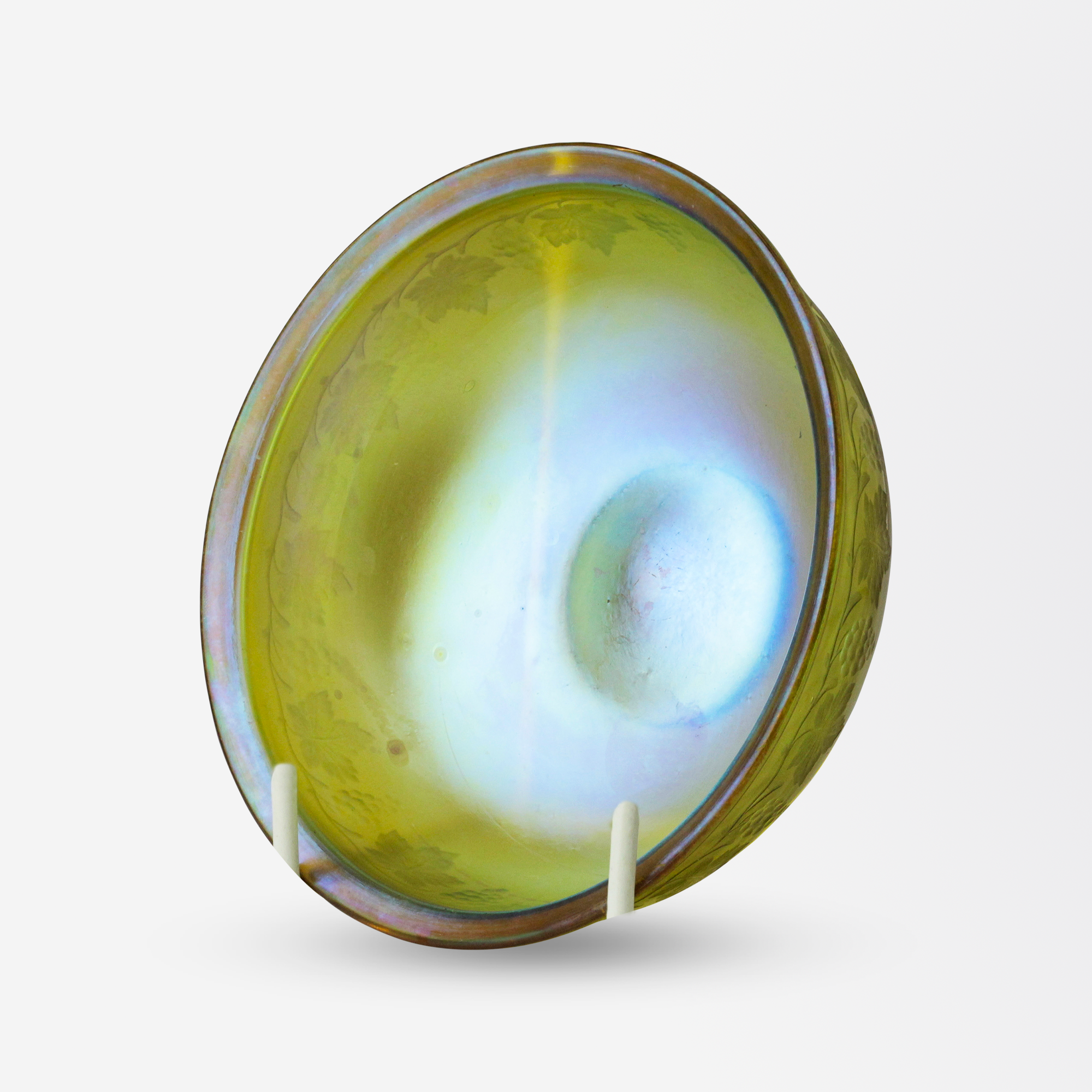 Bol et soucoupe en verre favrile doré et irisé, ornés d'un décor de vigne gravé. Signés « LCT » pour Louis Comfort Tiffany, New York, vers 1920.